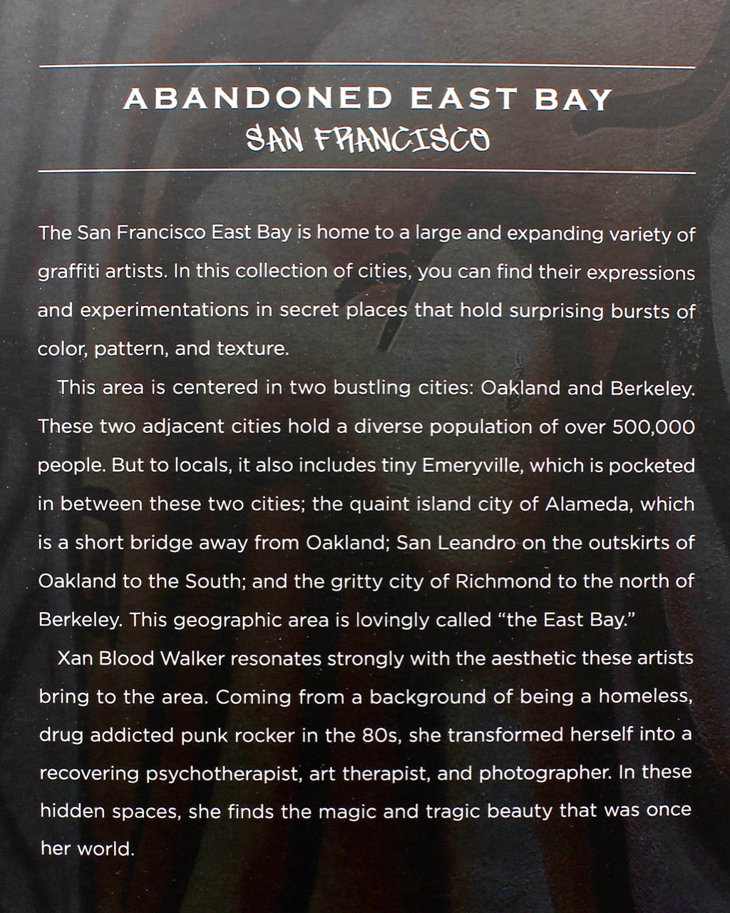 Artist Xan Blood Walker has led a creative life rife with transformation. She is currently a fine art photographer in the Bay Area. She learned print photography in high school, and went on to obtain two BFA's, one in printmaking and another in painting from the University of Washington. Her work finds a way to blend her vision and life experience into contemporary, bold expression. This book chronicles the expression and experimentations of graffiti artists across the cities of the East Bay including Oakland, Berkeley, Emeryville, Alameda, San Leandro and Richmond. The book is 96 pages, measuring 6" x 9". Published by Arcadia Publishing, 2020.