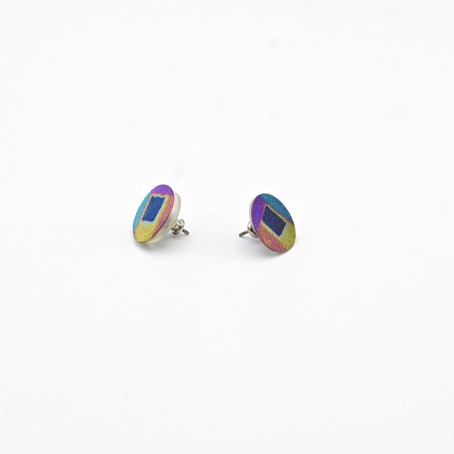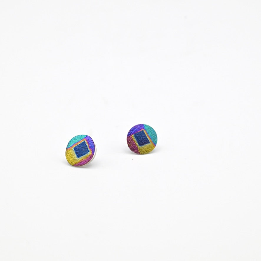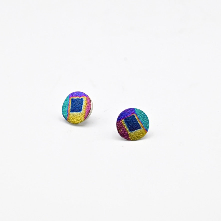 Kirk McCarthy is known for his modern geometric designs and the rainbow of colors he achieves with his niobium and titanium jewelry. This pair of lapel pins provide a flash of rainbow color on each .5" round.