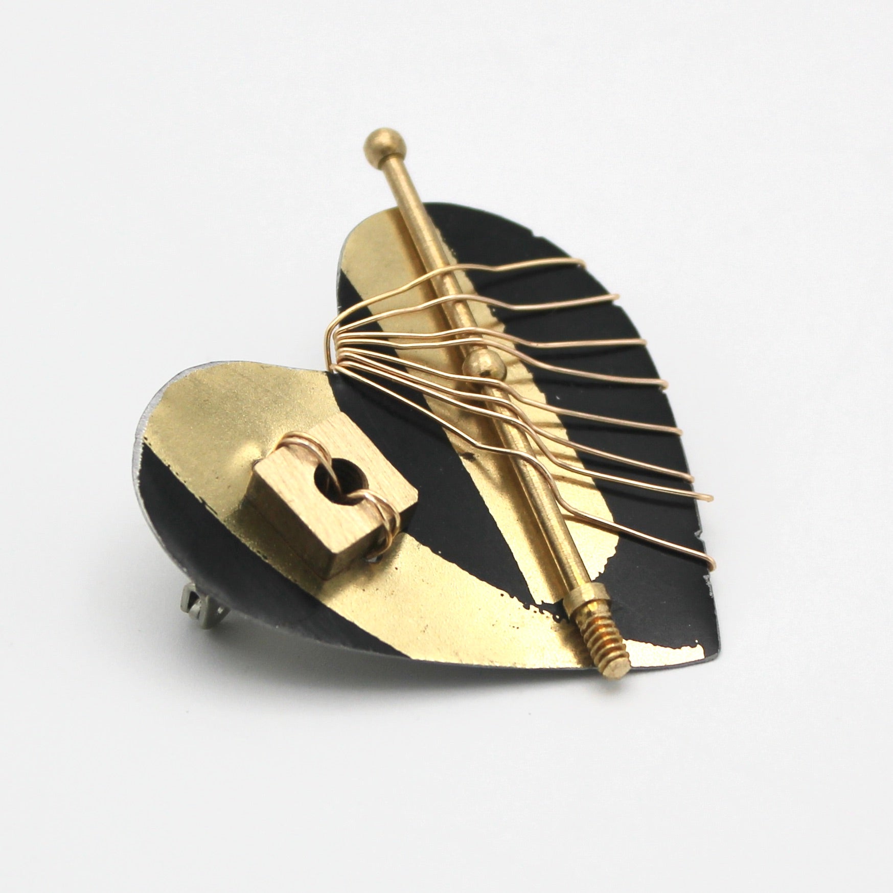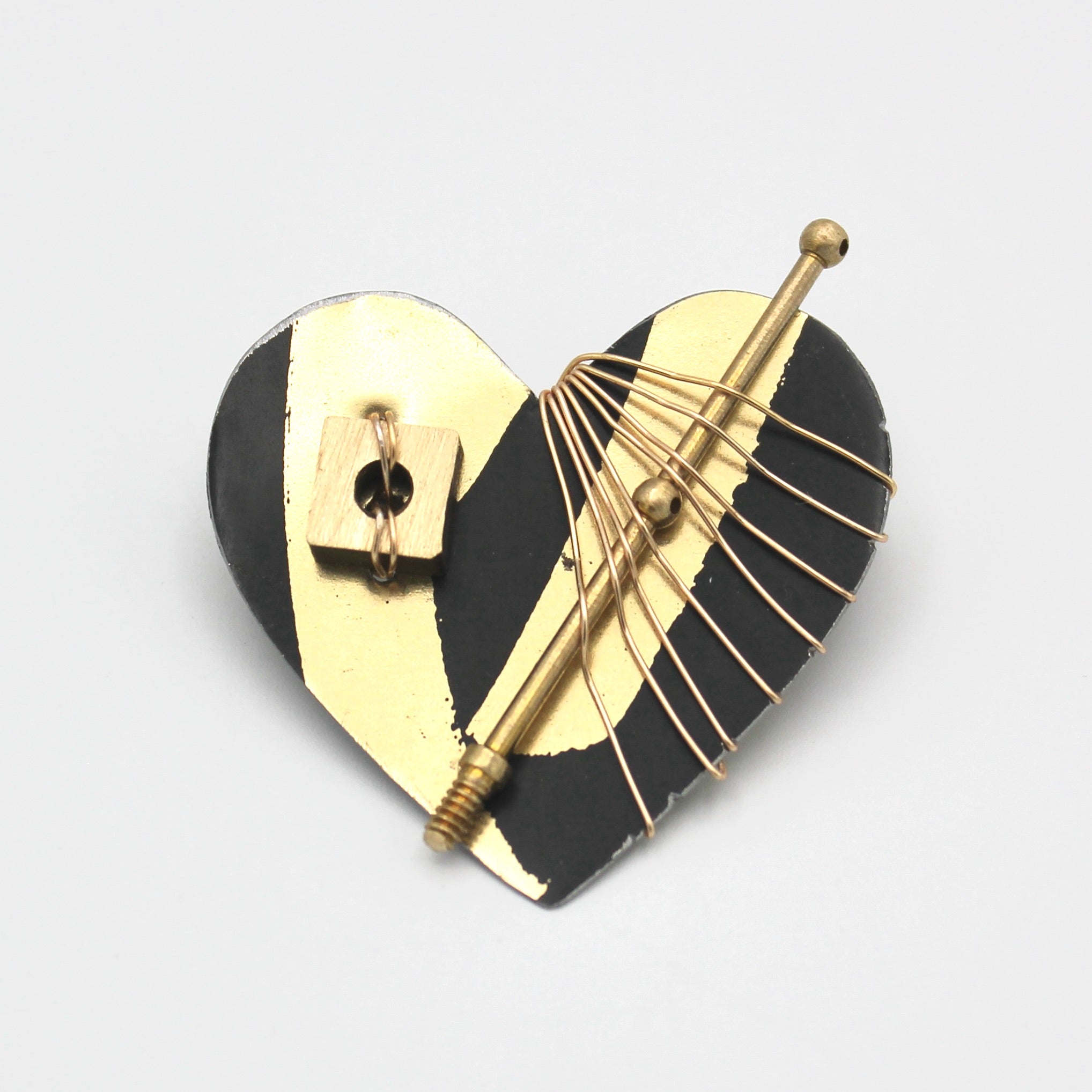 Irene Storch's work is a synthesis of her background in fine arts (painting, fiber sculpture, mixed media) and her love of found, salvaged, and upcycled materials. This funky pin measures about 1.75" square.