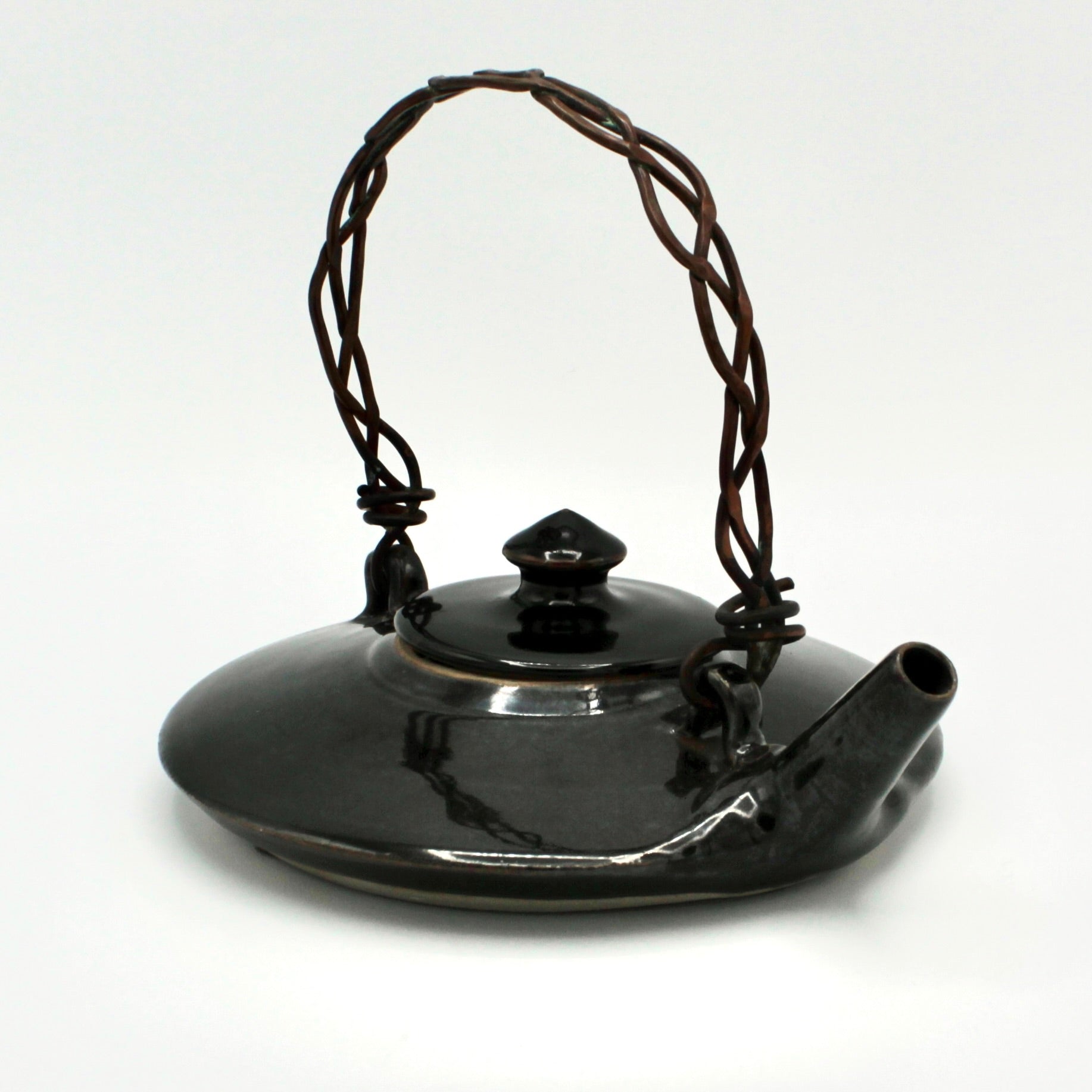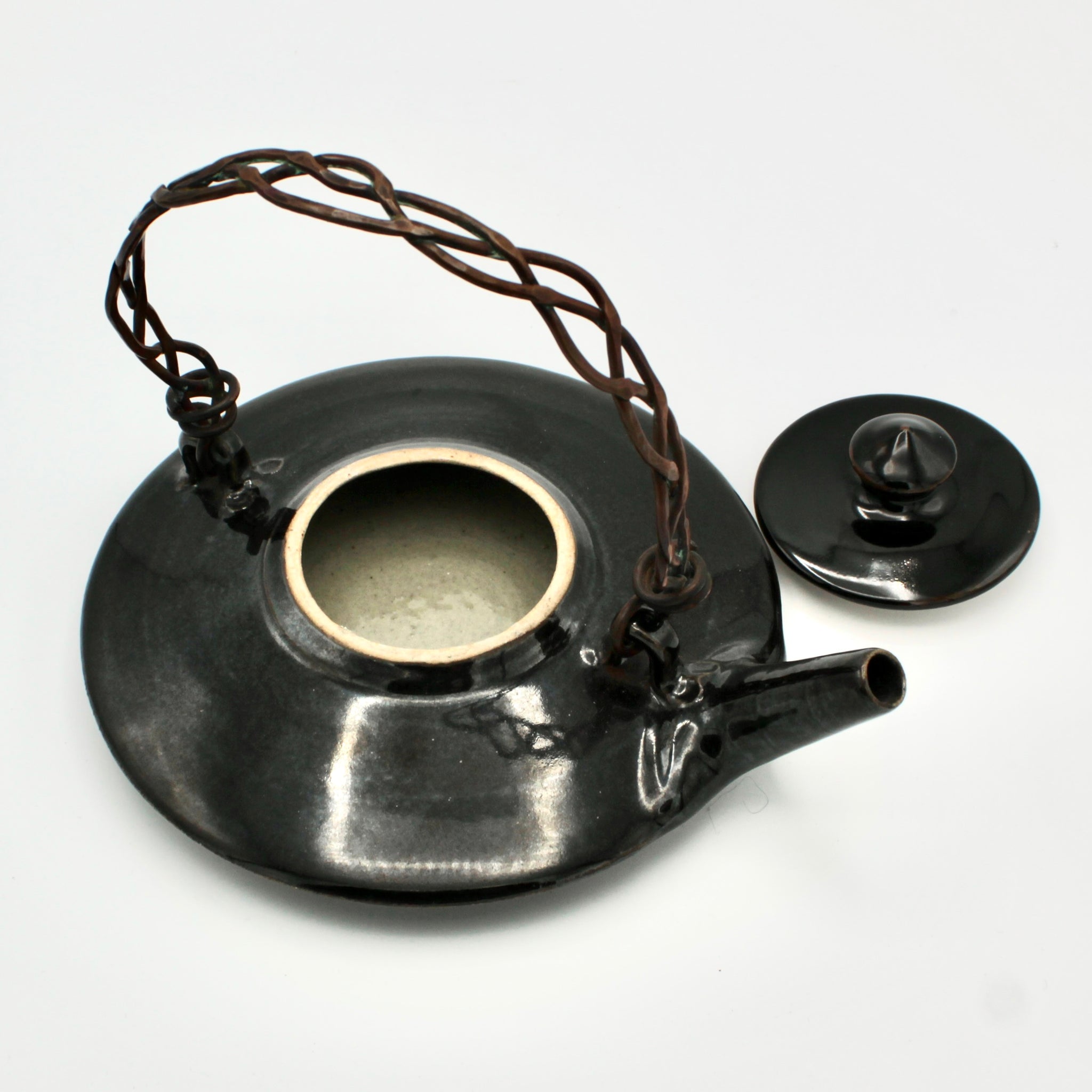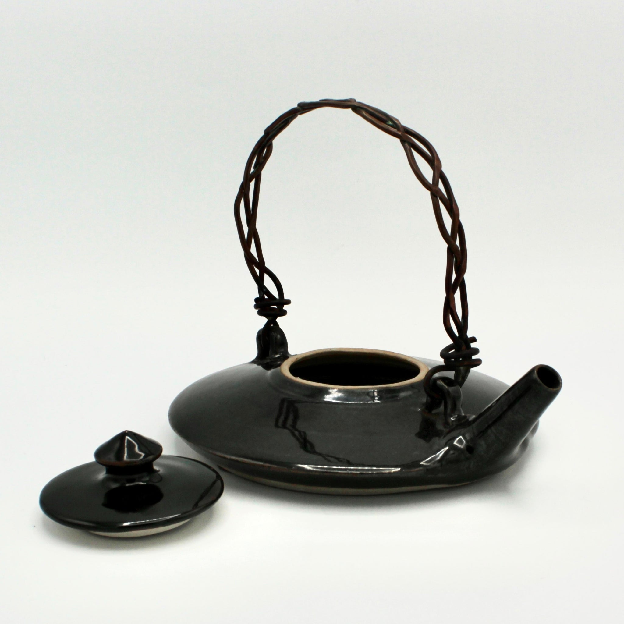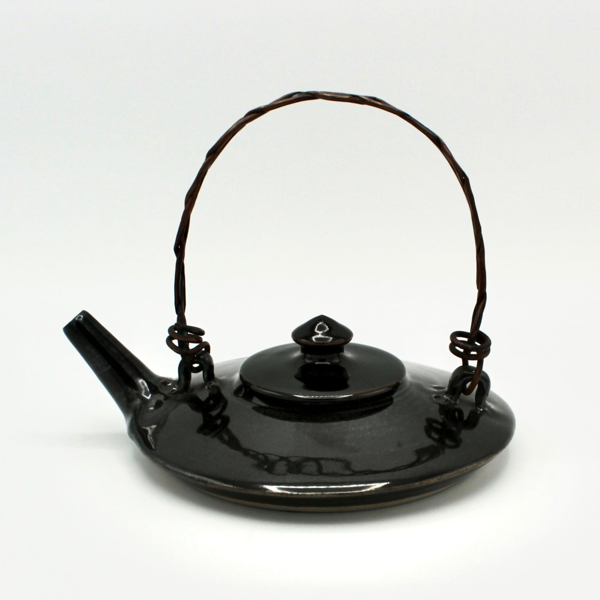 Longtime ACCI artist Susan Brody is back as a Holiday Guest Artist for the end of 2025! As ever, Brody's work is elegant, solid, and functional. This teapot has a beautiful, flat silhoutte and braided metal handle. It features a classic glossy black glaze. It measures approximately 2.25" in height and 6" in diameter. Its handle reaches about 6" in height.