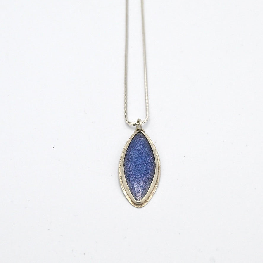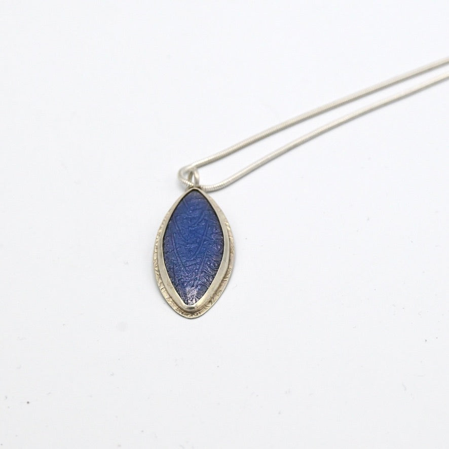 Daria Salus creates beautiful, nature-inspired jewels with her own special multi-step process of enameling. Her artful combination of different metals with enamel have been a recognizable favorite of the gallery for many years. This marquise pendant hangs 2" long and features stamped pattern behind a mysterious blue enamel; and a surprise on the back! Includes an 18" silver snake chain.