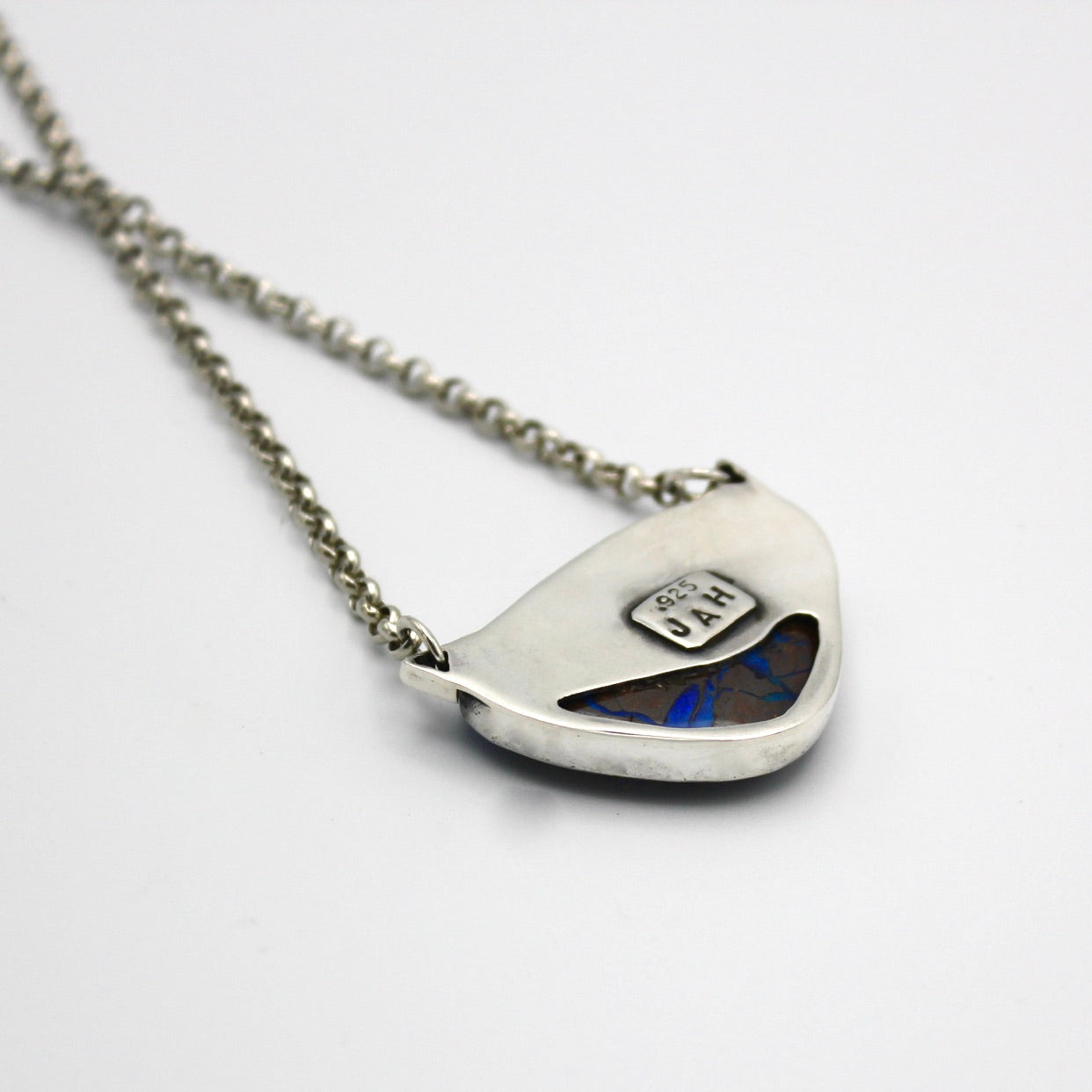 Jeannie Haydon's work is a playful mix of metals, textures, and patterns. This statement necklace blends the elegant and the industrial. It features a large polished boulder opal stone set in sterling silver. The necklace measures about 15" long.