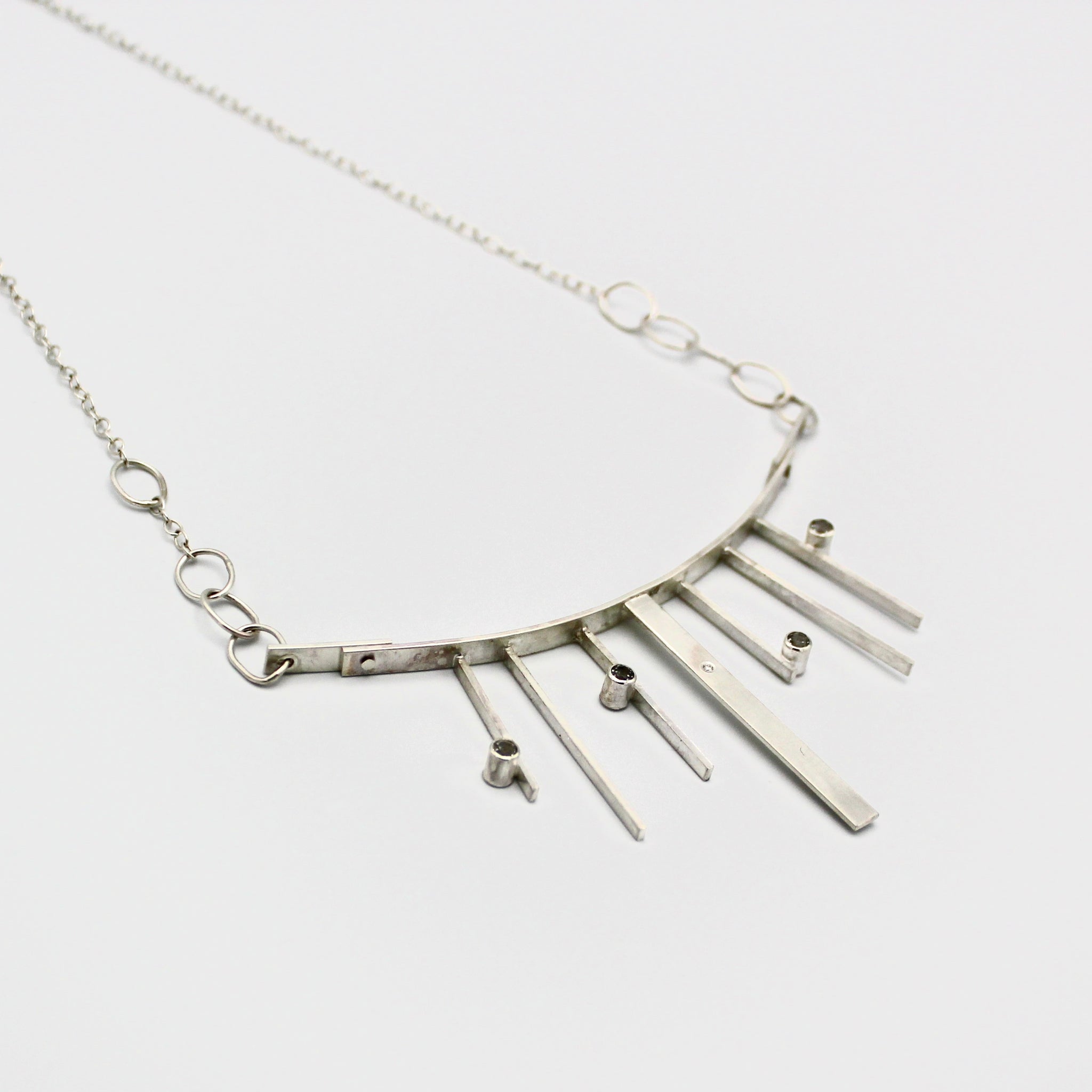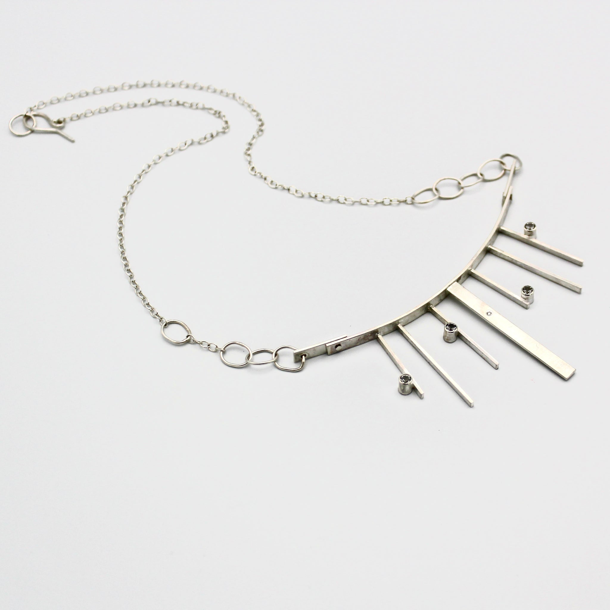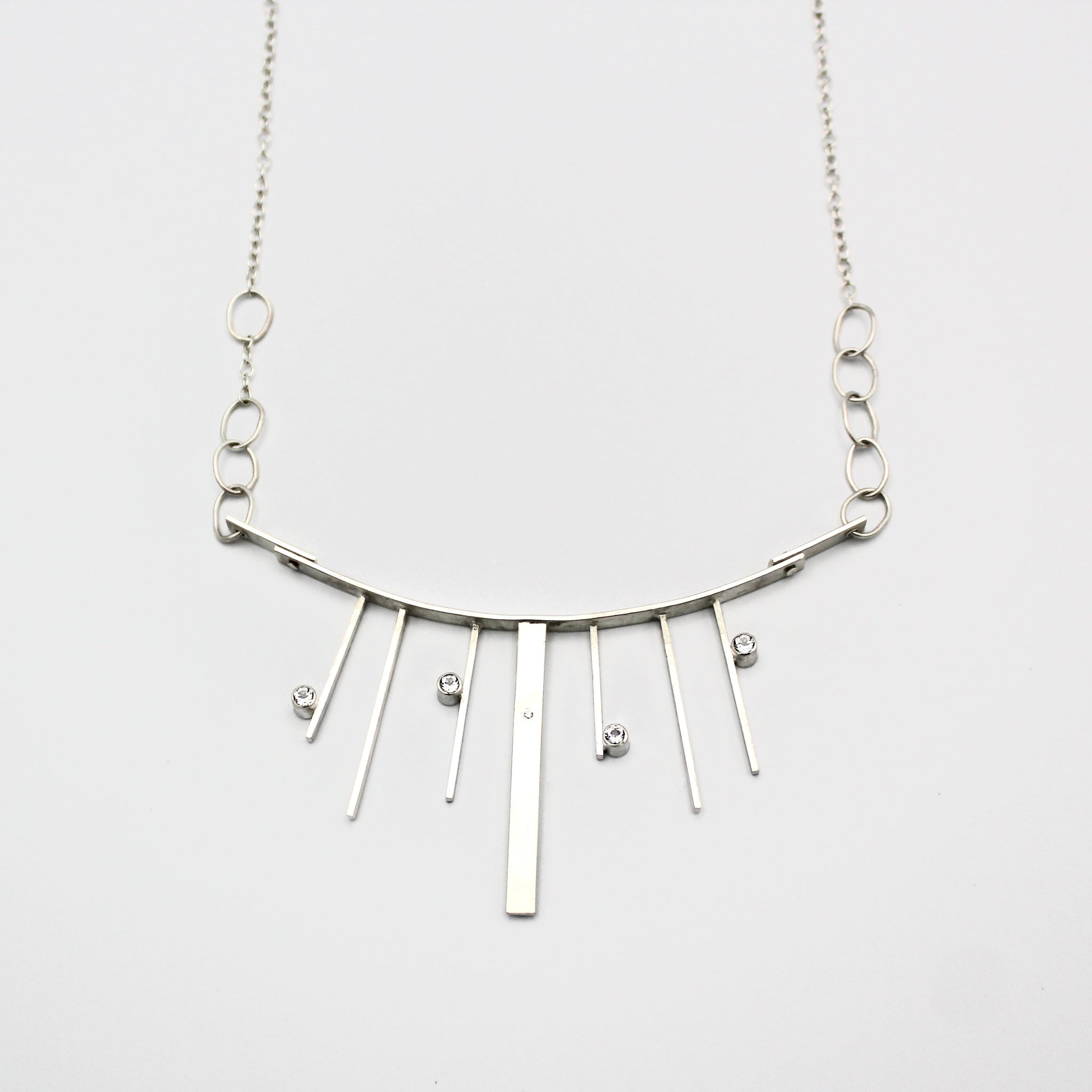 Eko Wright's minimalistic pieces are influenced by the Japanese concepts of nature as tranquil and elegant, yet simple and imperfect. This sterling silver necklace features seven vertical bars soldered onto a gently curved horizontal bar. The centerpiece is adorned with a flush-set diamond, while four of the other bars are accented with tube-set white topaz stones, creating a rhythm of sparkle and structure.