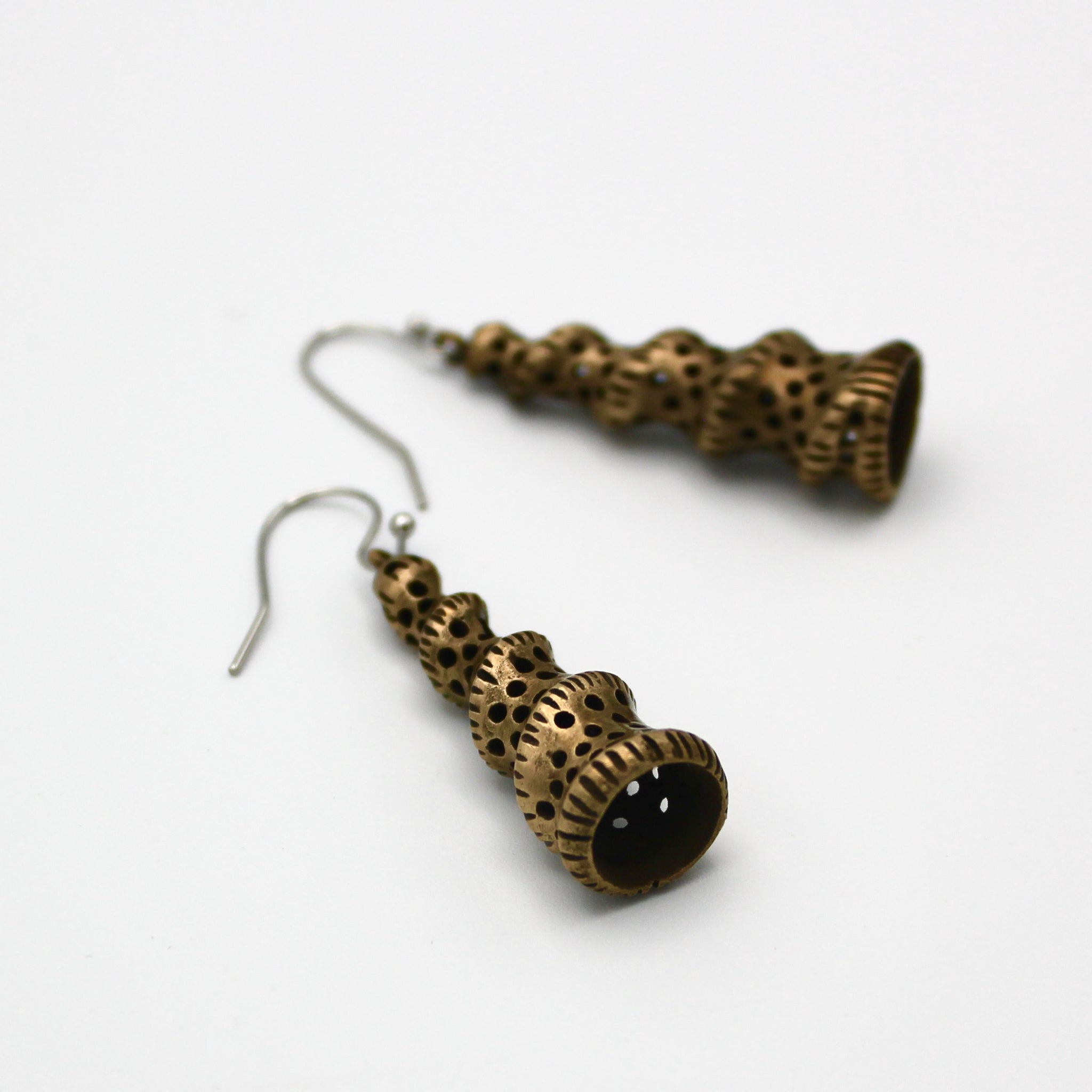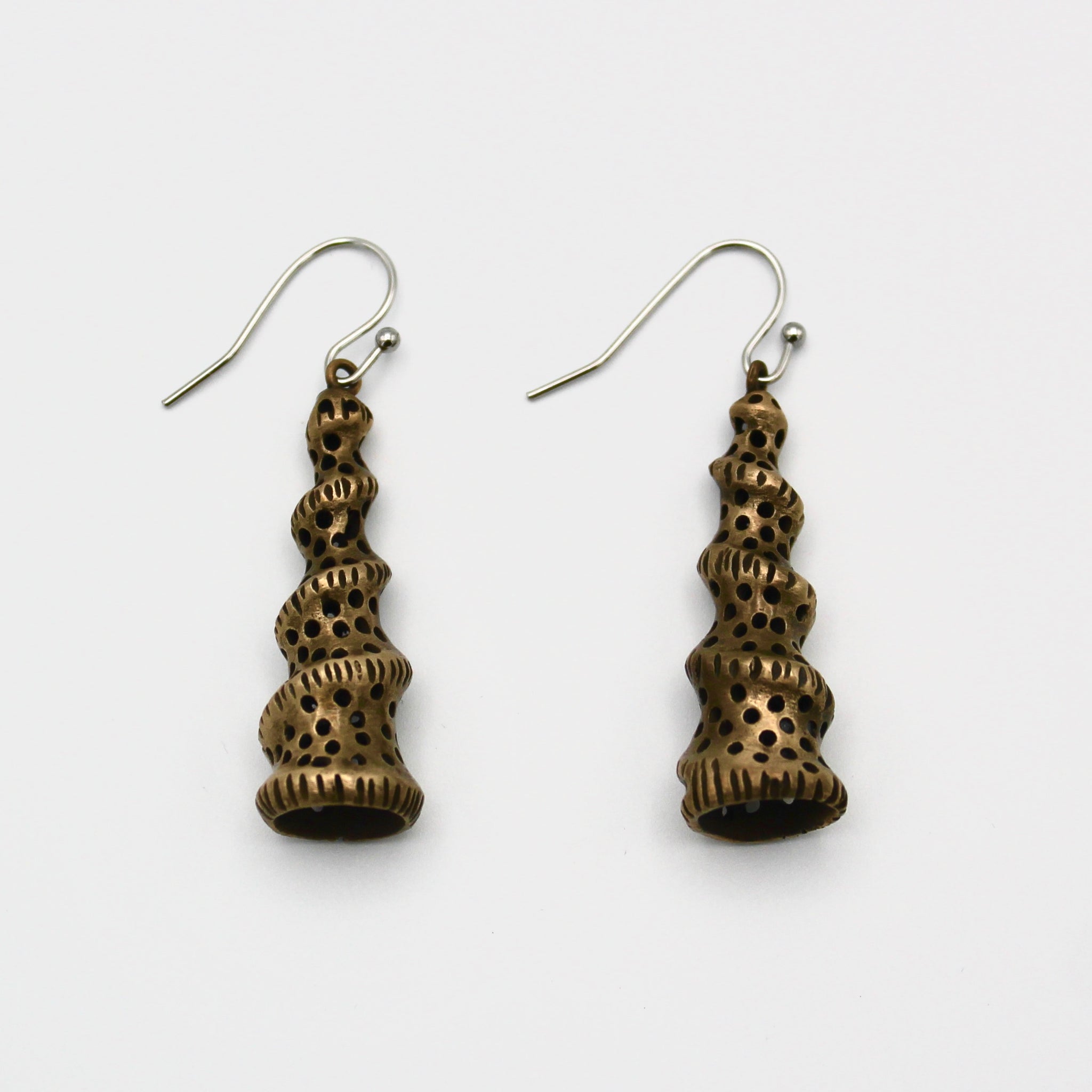 Hadar's Jewelry showcases intricate designs crafted from her unique handcrafted metal clay, transformed into pure metal through innovative techniques. Her creations feature mixed metals, textures, and architectural forms, reflecting over two decades of expertise and artistry. These bronze earrings feature a three-dimensional, seashell-like pattern. They measure about 1.75" long on stainless steel ear wires.