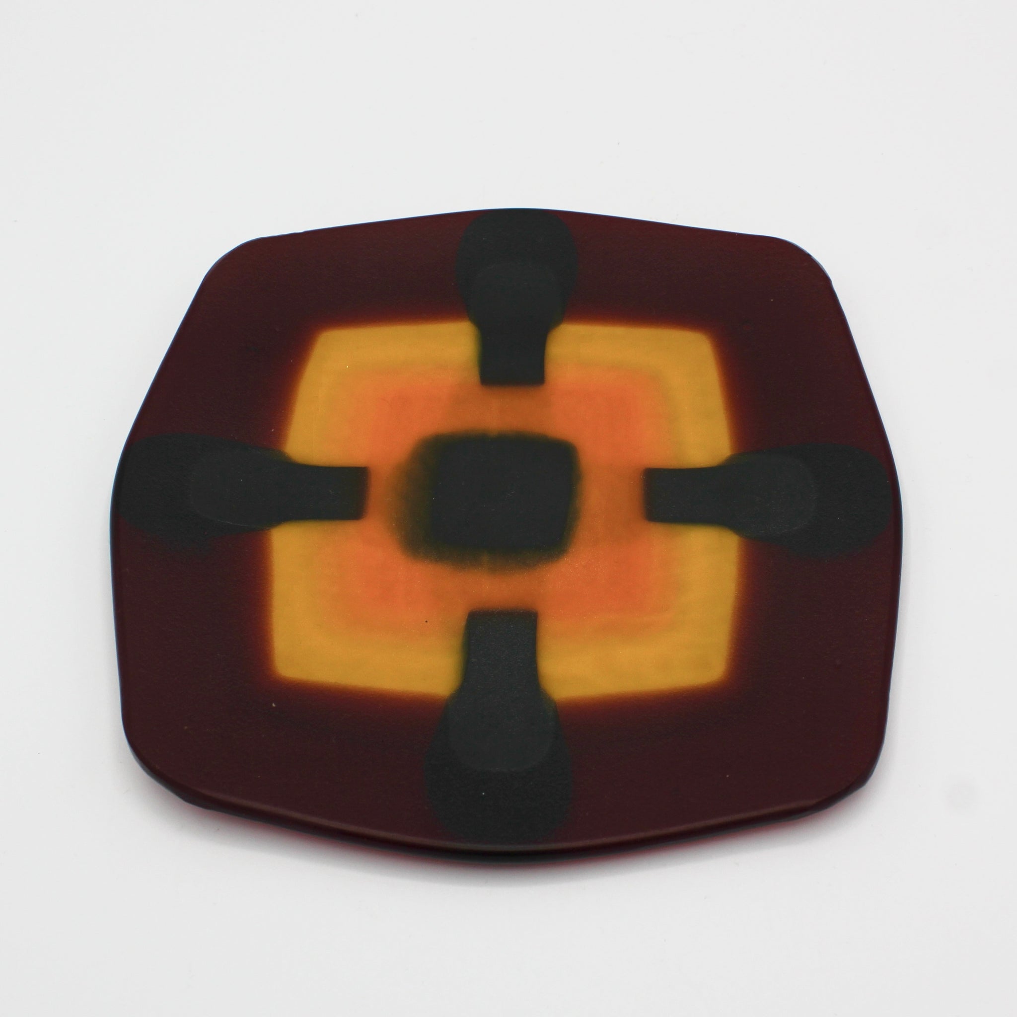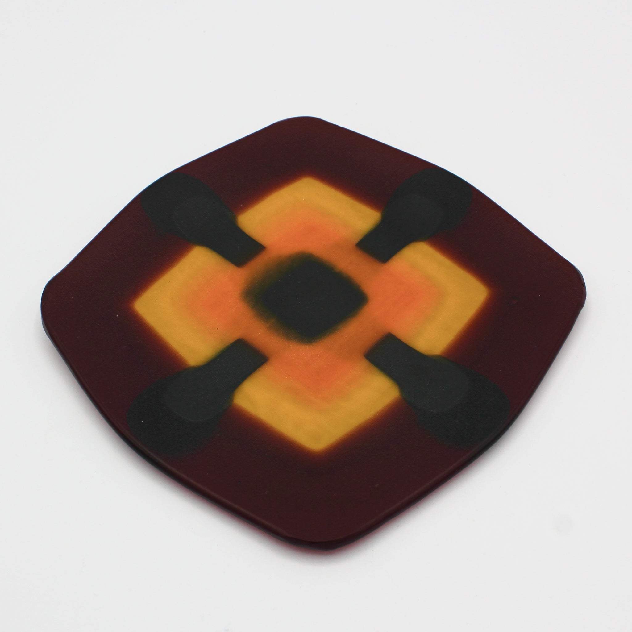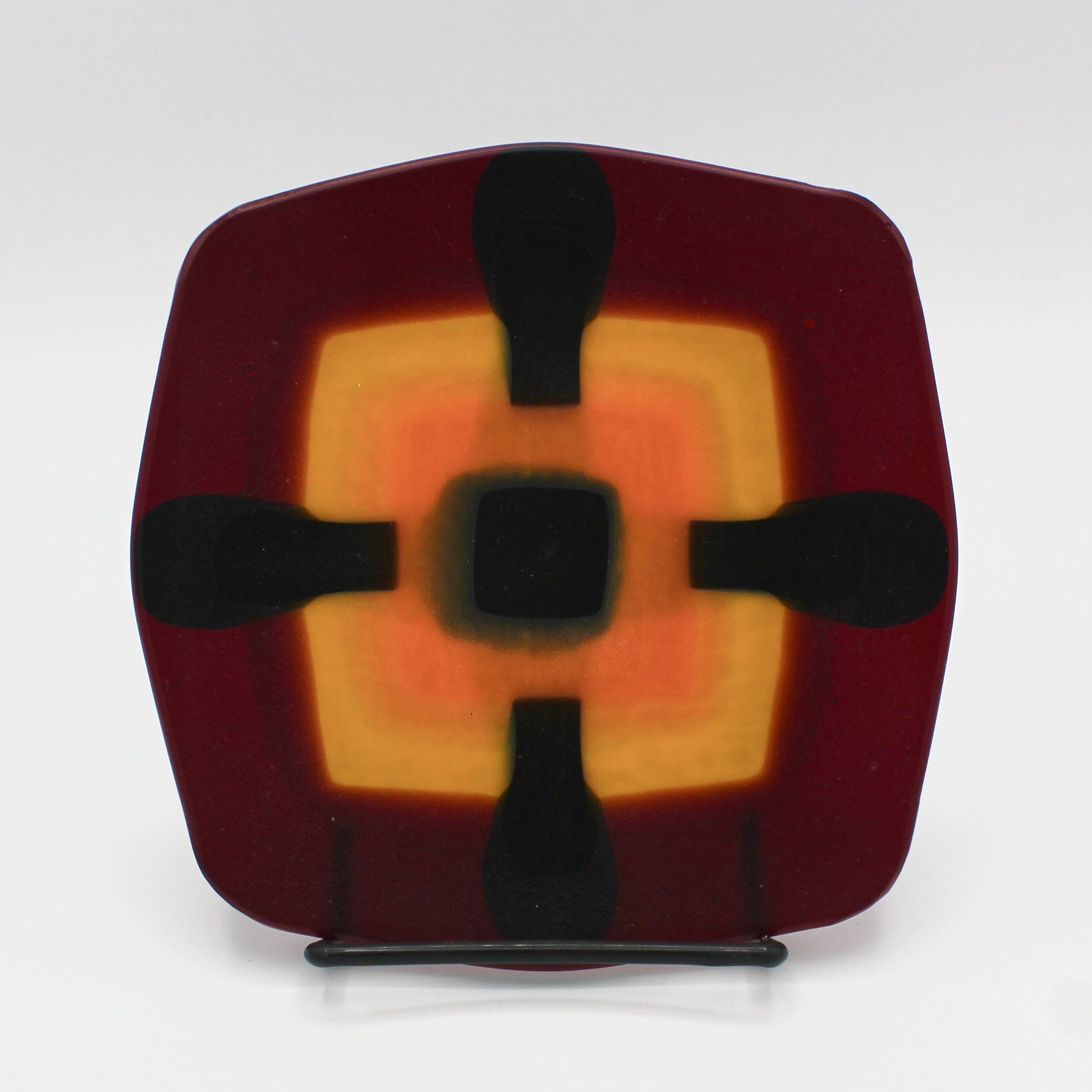 Mark Schatz's career in architecture really shines through his elegant and intricately assembled fused glass creations. This beautiful pressed glass accent plate measures 6.25" square. This dish, along with many of Mark's beautiful pieces, can serve equally well as a tapas or hors d'oeuvres plate, nut/olive dish, or trinket holder for keys and rings.
