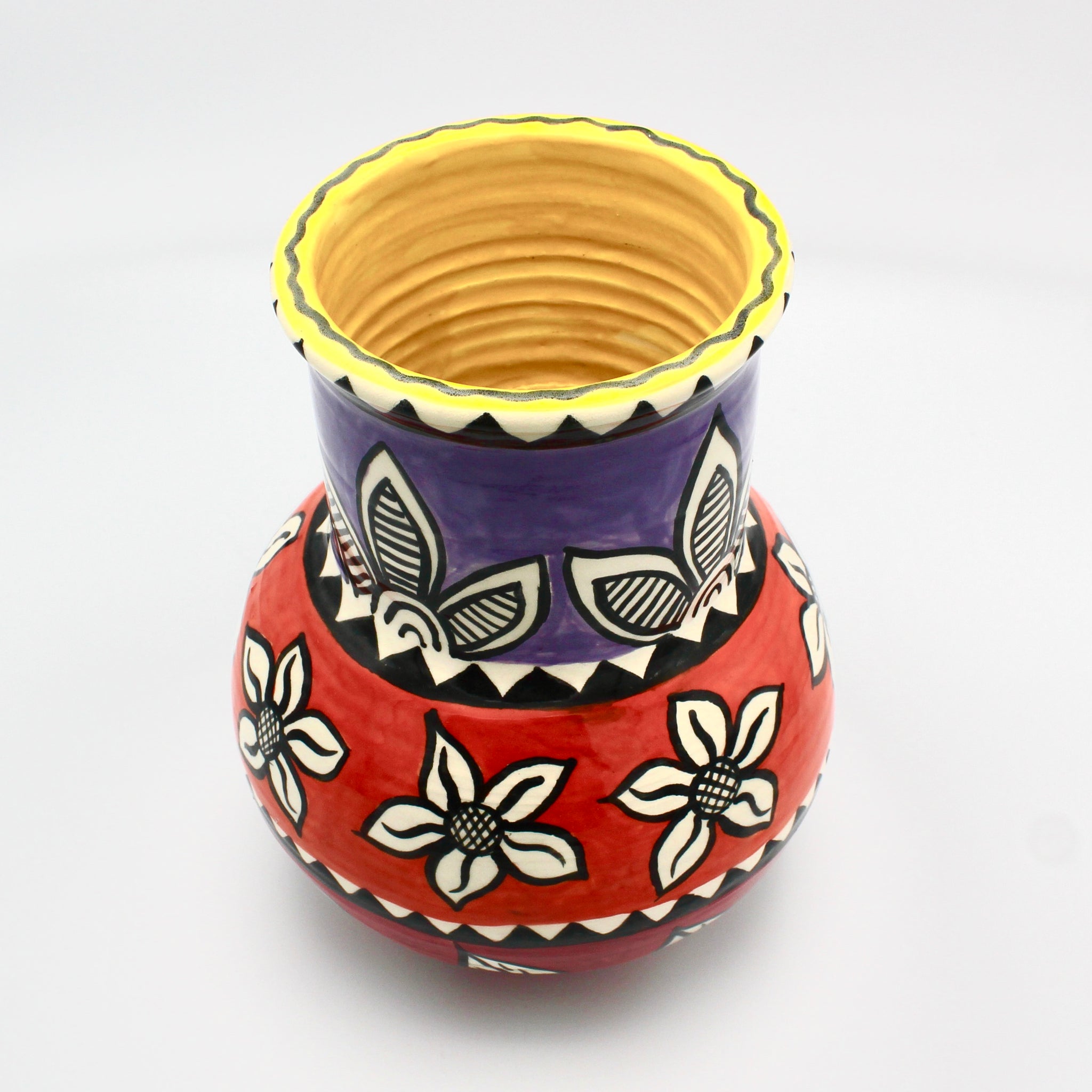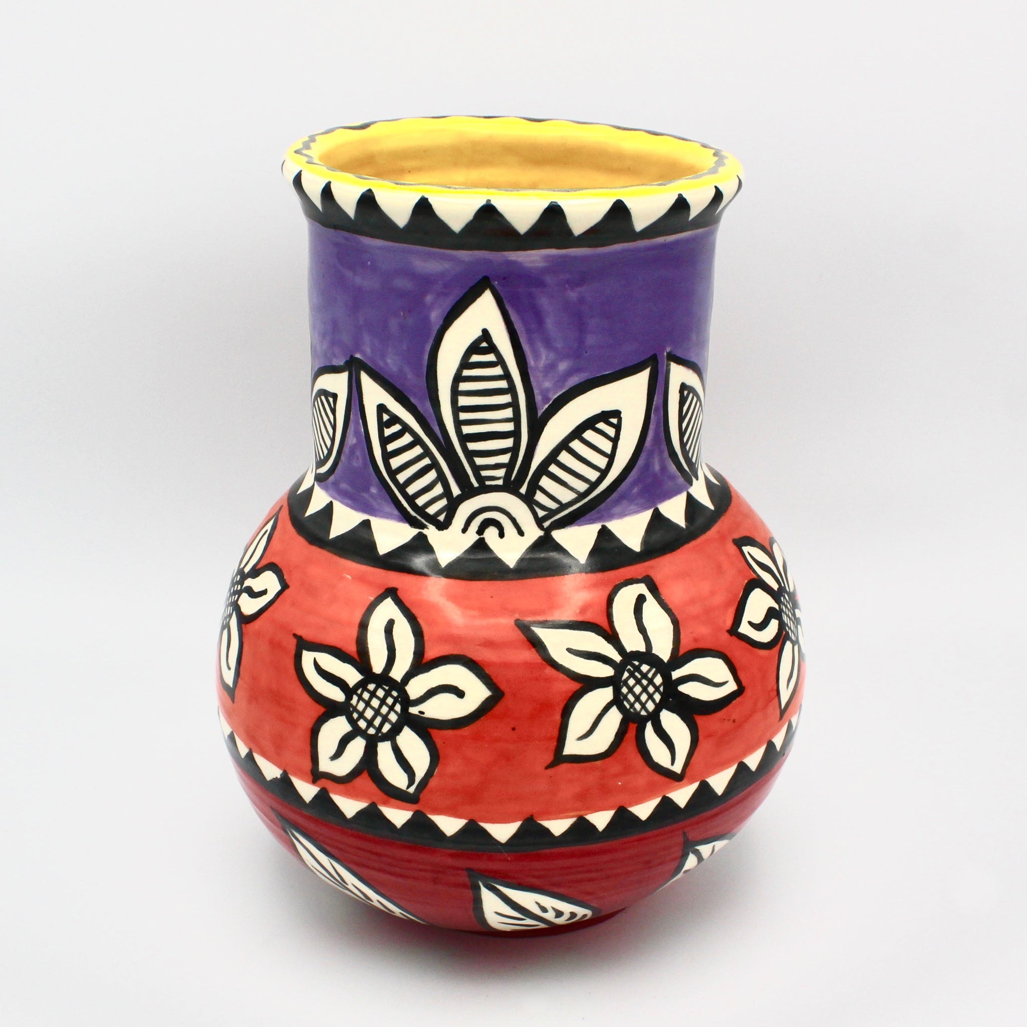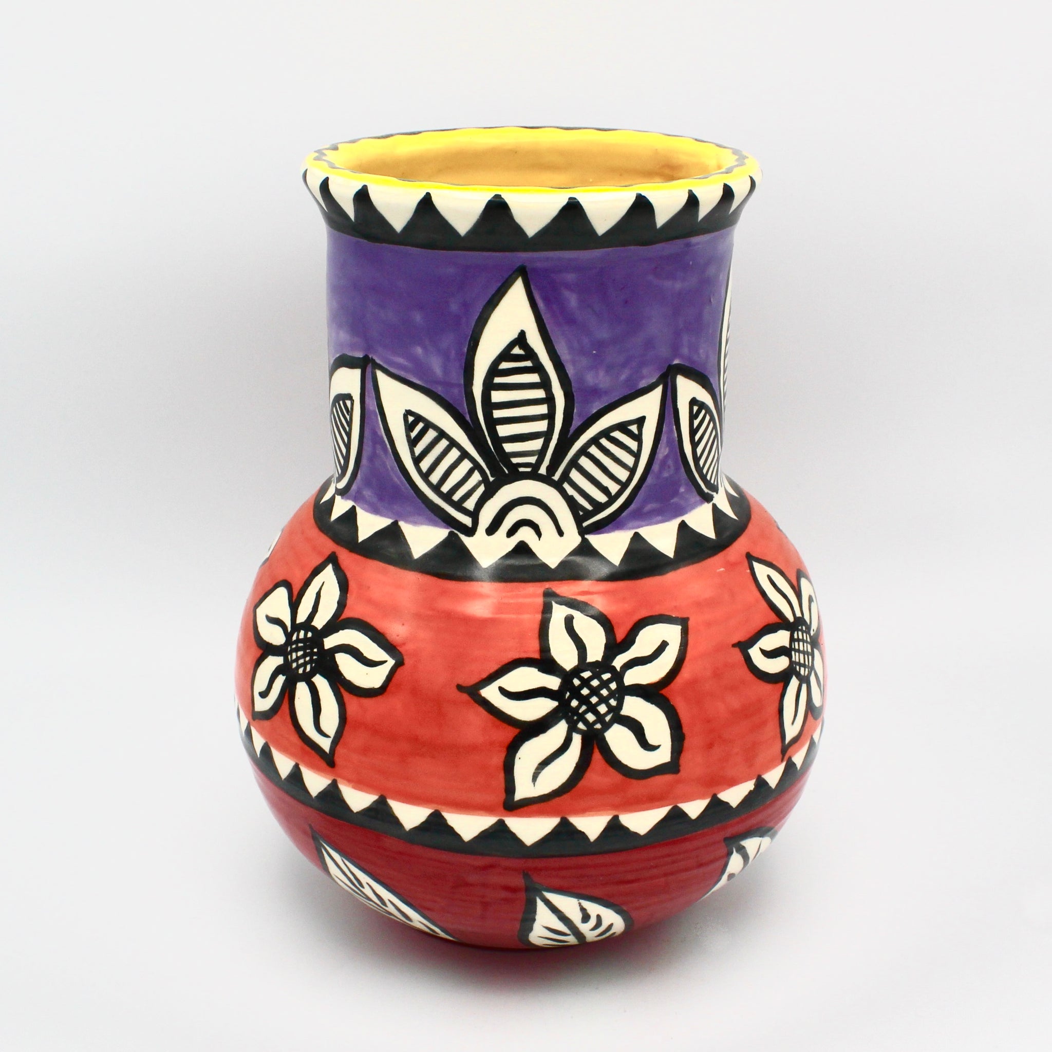 Bold and whimsical, Jacqueline Thompson's hand painted pottery is a longtime favorite of ACCI visitors. This large, full bellied vase features Jacqueline's signature folk art style in black, white, and red, purple, orange, and yellow. It measures about 8" in height and 4" in diameter at its mouth.