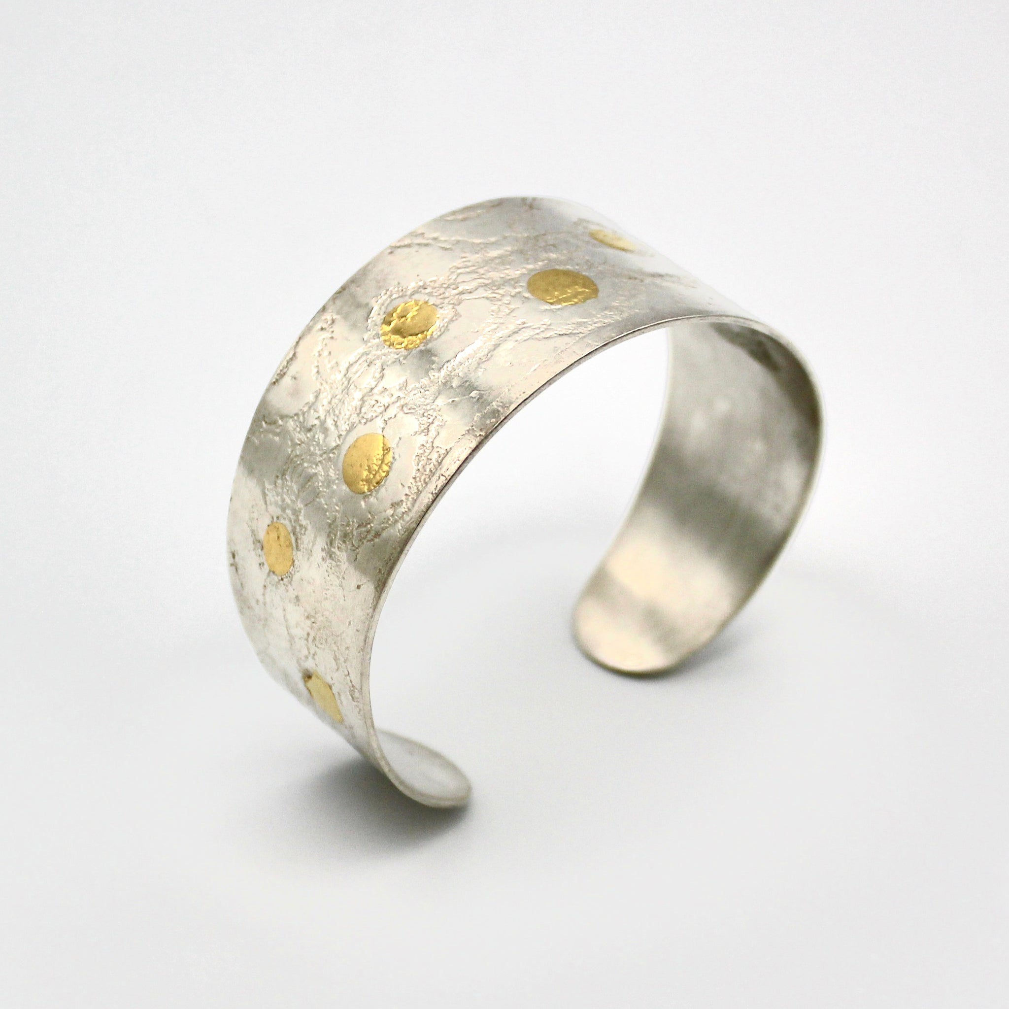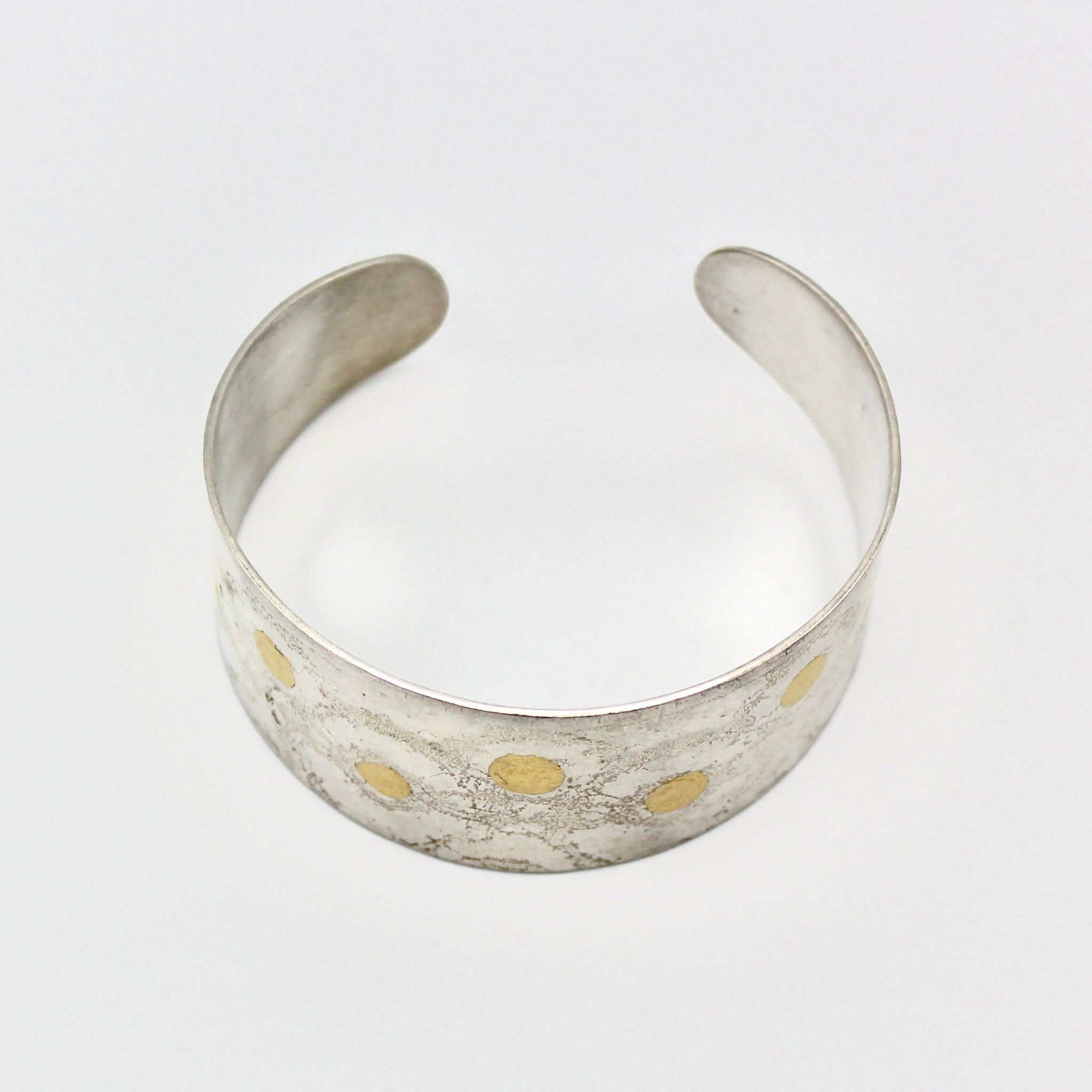 This bold silver cuff features artist Sarah Liron's masterful metalsmithing and elegant design sense. The bracelet is made with a combination of techniques in Argentium silver and overlaid with 24K gold dots using the Keum Boo method. The bracelet measures just over 1" at its widest point and fits an approximate size medium. PLEASE NOTE: this piece is currently being shown in our collaborative show with the Metal Arts Guild, "Bridging the Bay." It will be available to be shipped or picked up in store after the show closes on November 9th, 2025.