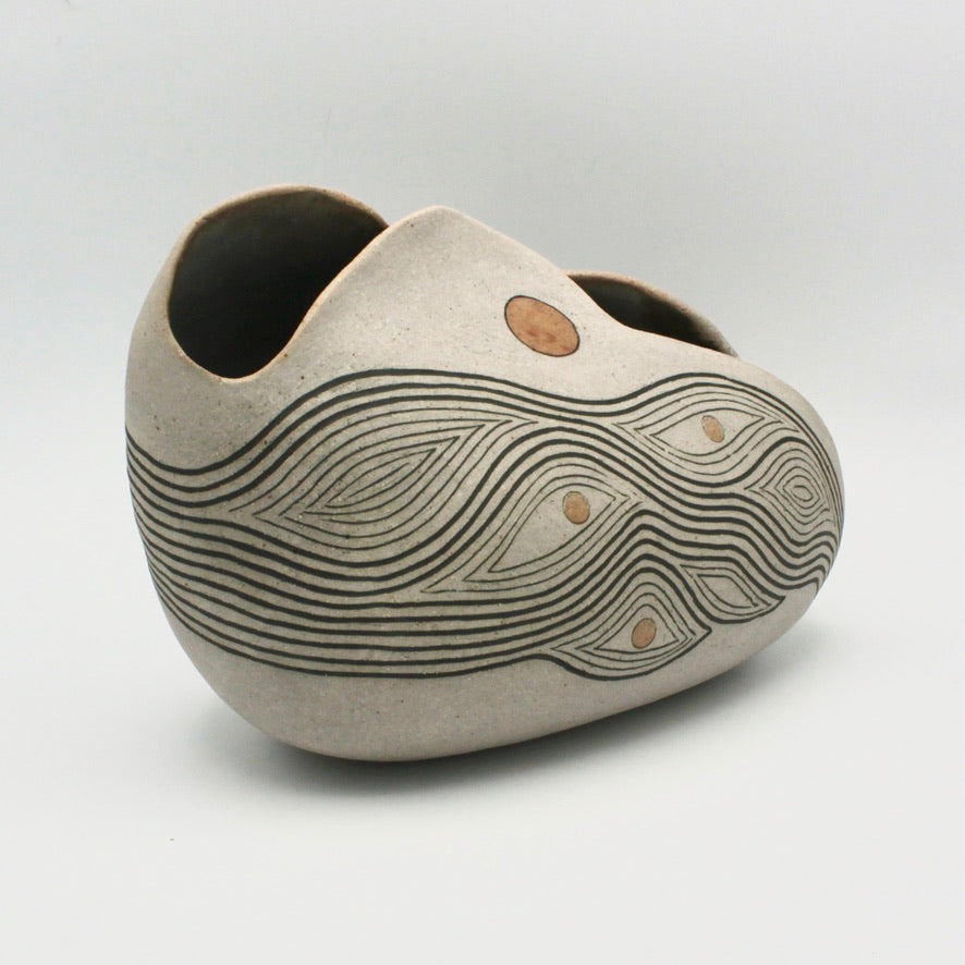 Jennifer Joh's work is a fascinating combination of lines, shapes and textures in organic forms ranging from the botanical to the mineral. Cacti, rock formations and marks resembling ancient petroglyphs are her signature. This unique sculptural piece features concentric curves, and measures about 8.5" long and 6" tall.
