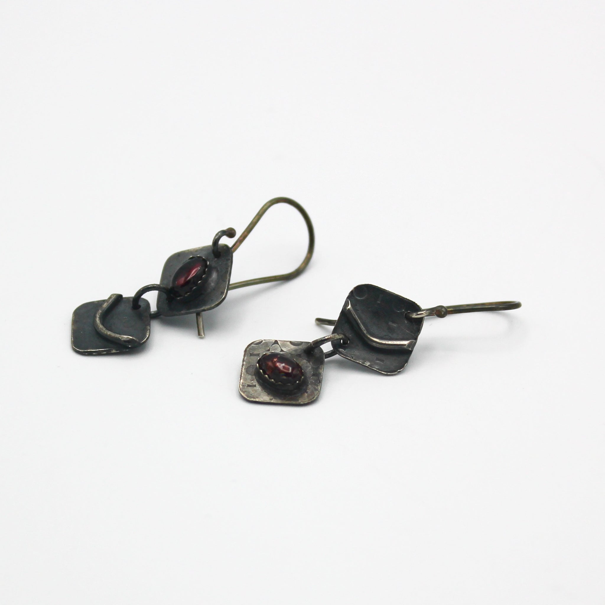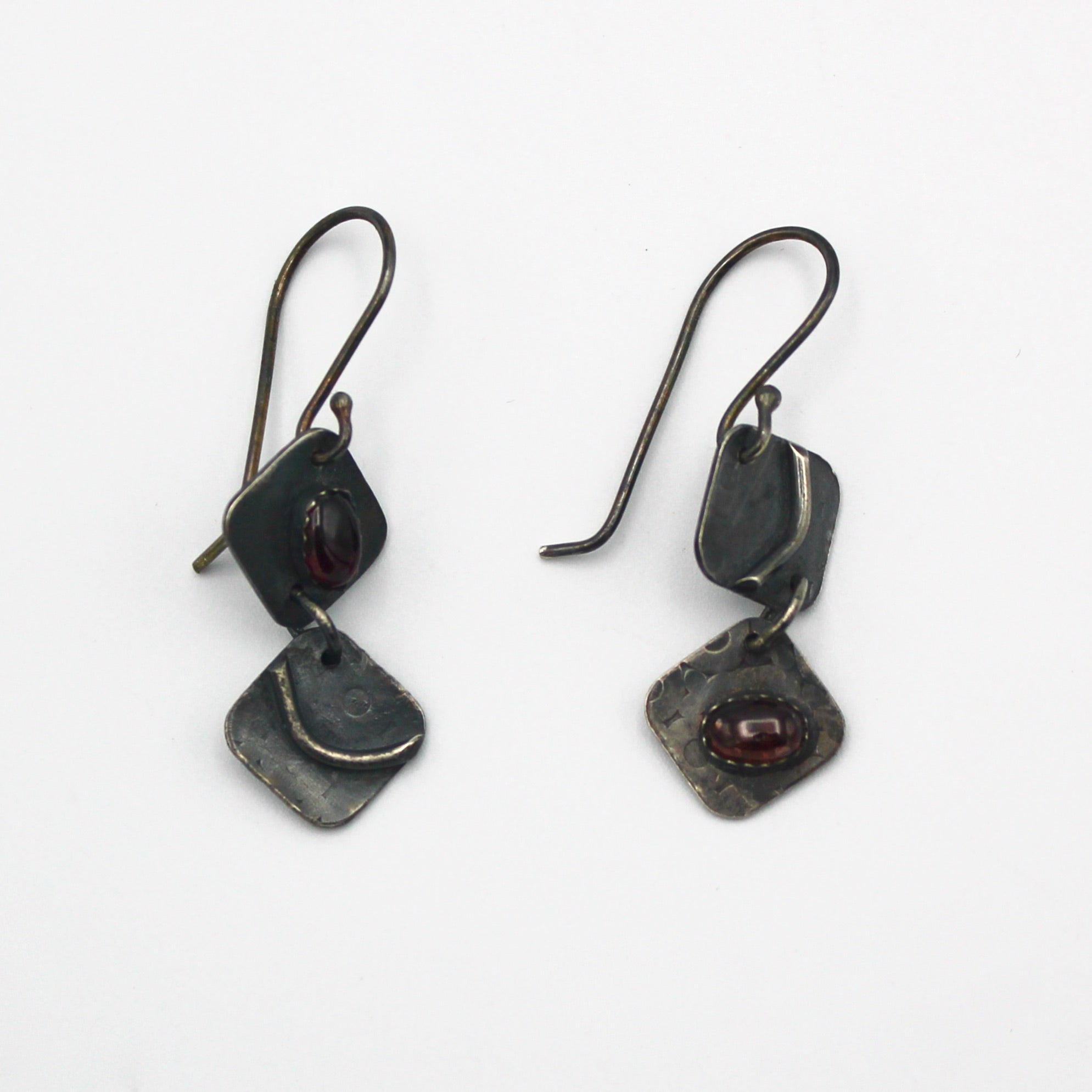 Sarah Liron's masterful metalsmithing and elegant design sense are expressed in color, texture and sparkle. These gorgeous earrings are made oxidized sterling silver and set with assymetrical garnets. They hang 1.5" in length on silver earwires.