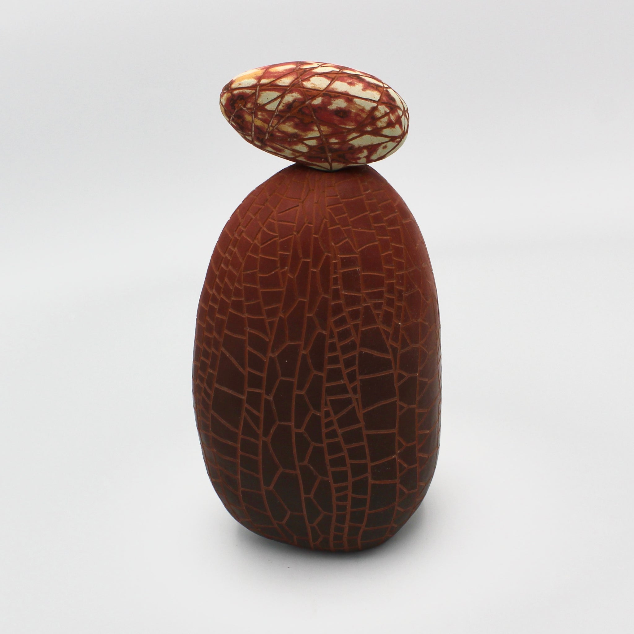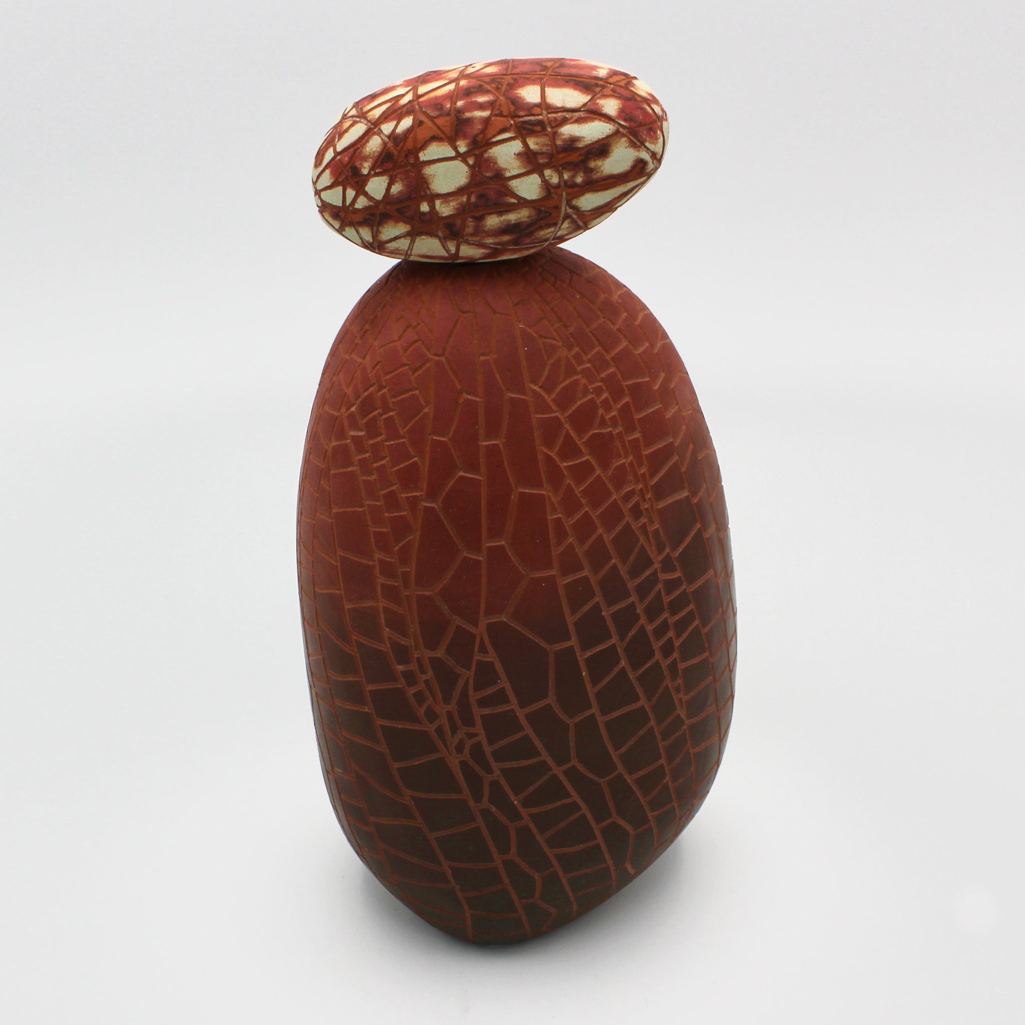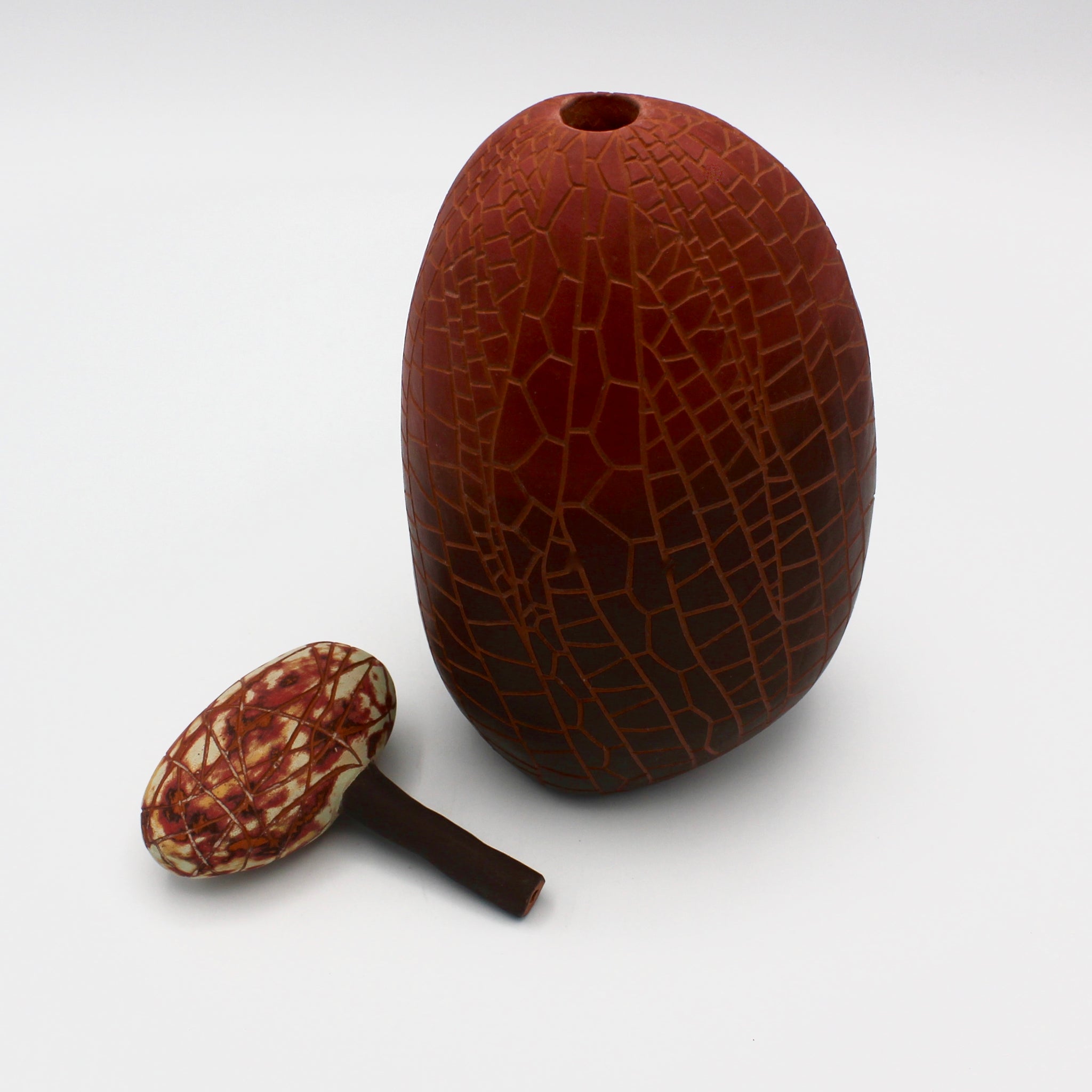 Terri Scheid's works are formed by pinch, coil, and slab construction. Layered underglazes are accented, complicated, and expanded by sgraffito into the clay. Once fired, the pieces are wet sanded to reveal the multiple layers of color, then sometimes drawn onto, and then fired again with clear glaze. Her work is primordial, vibrant, and ocassionally gravity-defying. This vessel features a stunning rusty gradiant, asymmetrical, organic shape, and measures 8" in height.