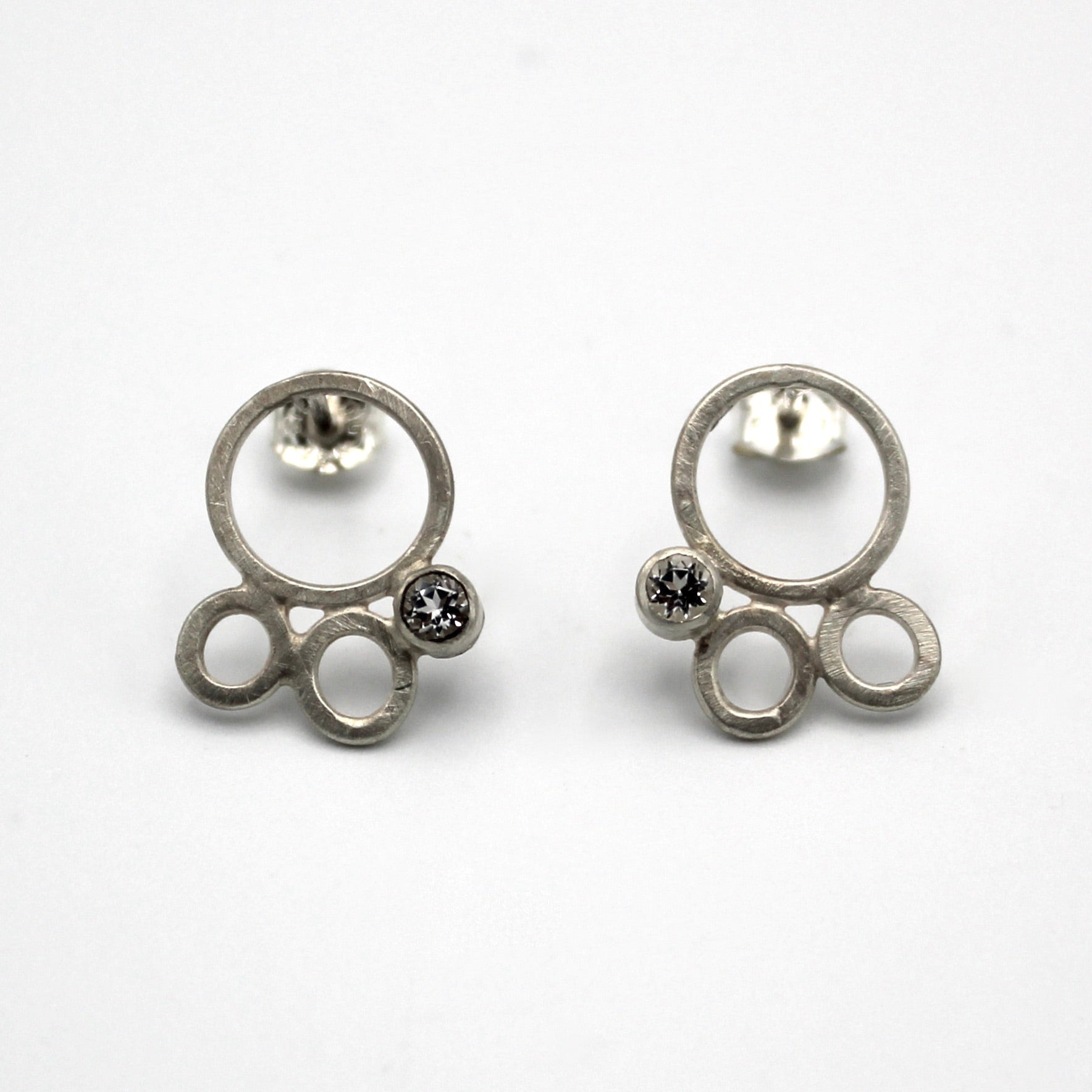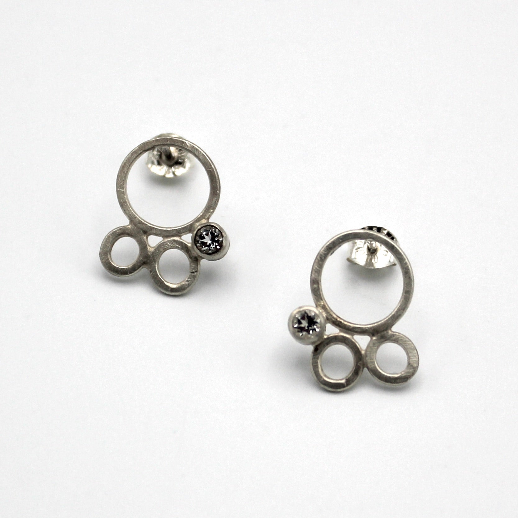 Eko Wright's minimalistic pieces are influenced by the Japanese concepts of nature as tranquil and elegant, yet simple and imperfect. These statement earrings in sterling silver hang on posts and are formed from repeated circles and each set with a tubeset white topaz stone. Each measures a little over half an inch in length.