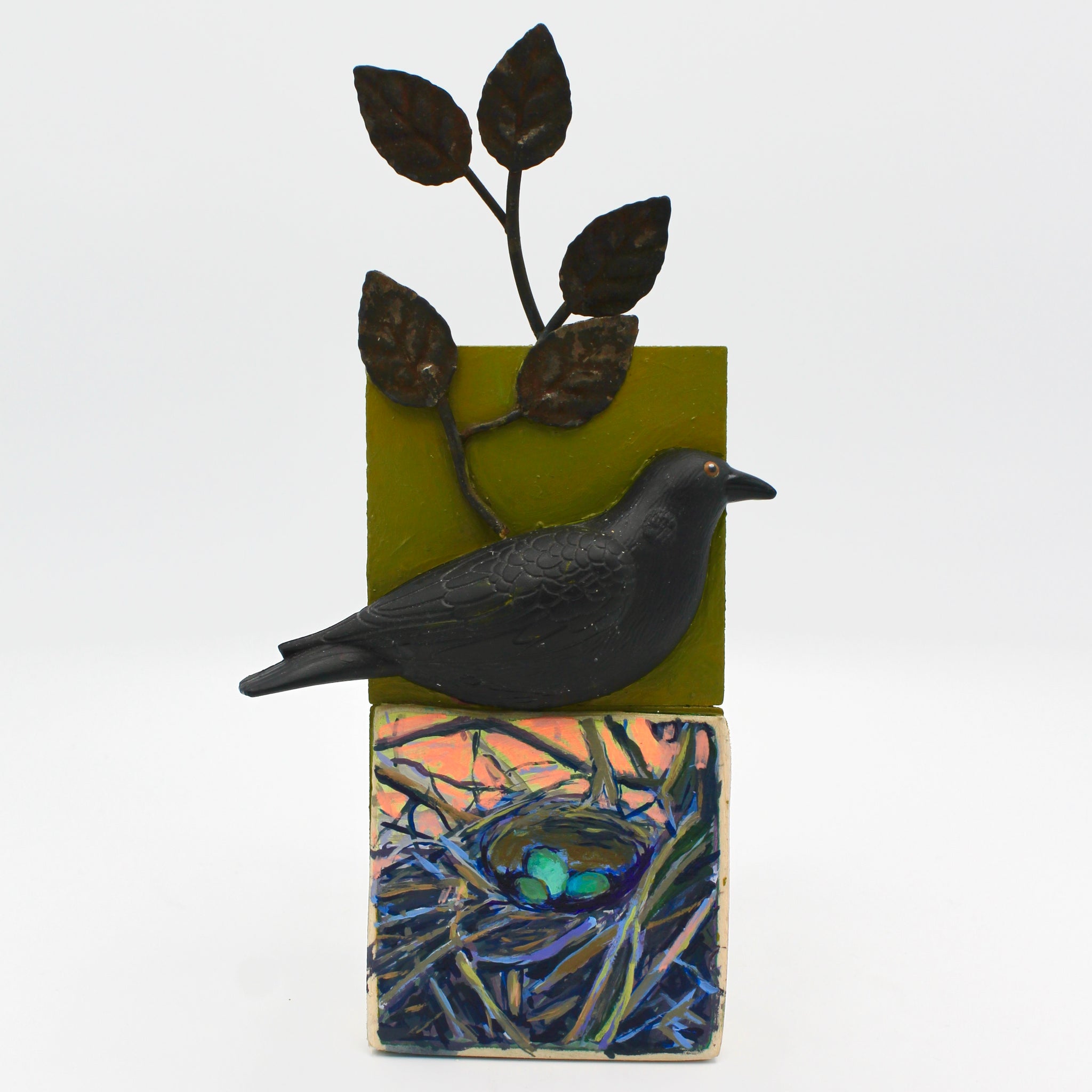 Quirky, colorful, and eclectic, Mirto Golino's sculptures are composed of equal parts whimsy, mystique, and a magpie's eye for treasures and sparkly bits. This unique piece is made with acrylic on wood and found objects, and measures 4.5" at its widest and 9.5" at its tallest. Ready to hang.