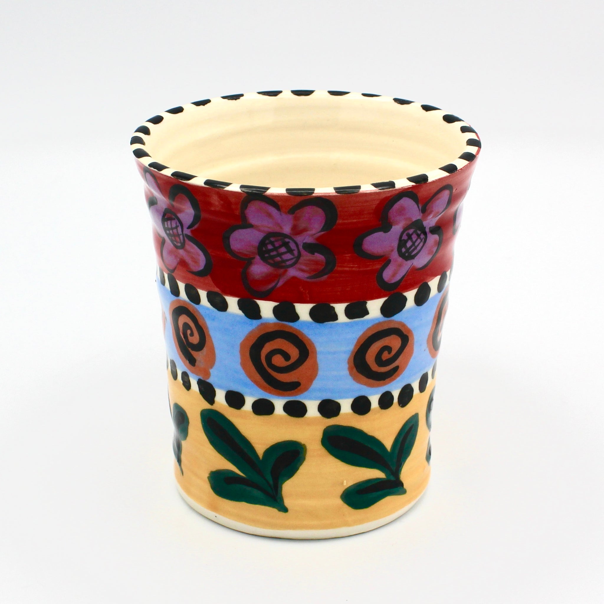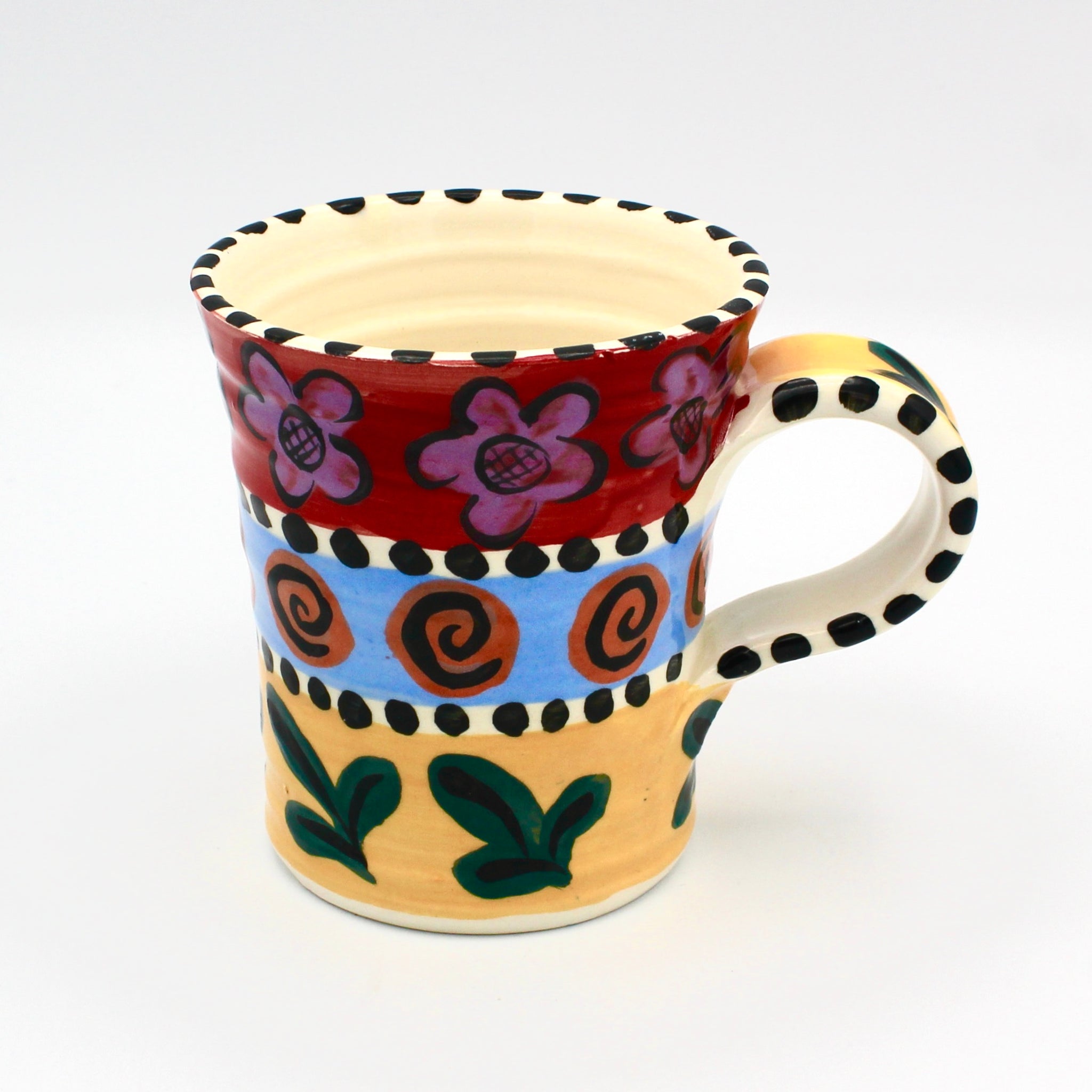 Bold and whimsical, Jacqueline Thompson's hand painted pottery is a longtime favorite of ACCI visitors. This floral mug features Jacqueline's signature folk art style in a full rainbow of colors . It measures about 4" in height and 3.5" in diameter.