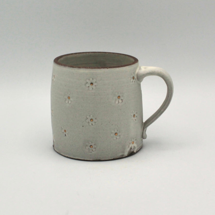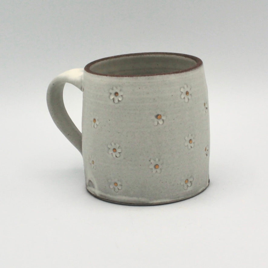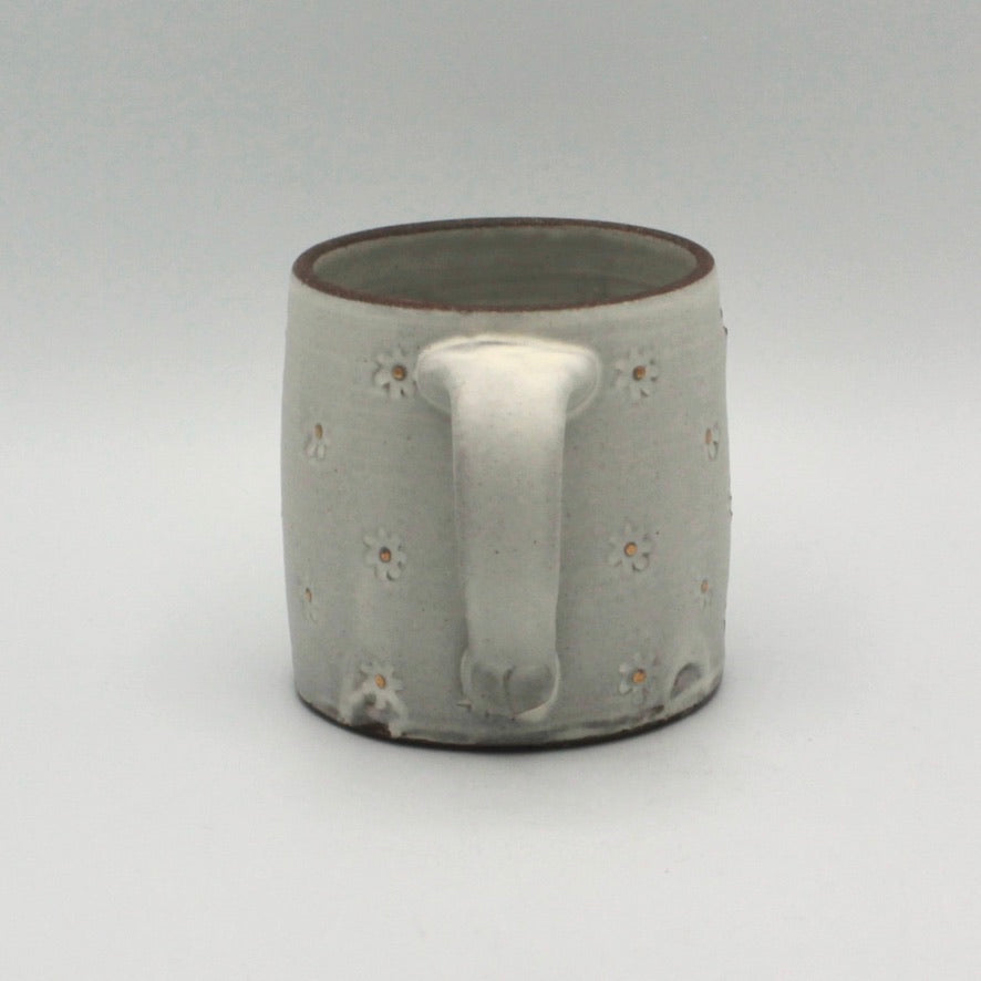 Dania Lukey's ceramic work is inspired by her interests in architecture, Japanese poetry, contemporary art, and ancient textiles. Her style is elegant and clean, at home in any environment. These mugs feature a matte white glaze and a pattern of gold and white flowers. They measure about 3.5" in diameter and 3.5" high. Please note: every handmade item is unique and may vary slightly in shape and exact color placement. Do not microwave due to gold dots, handwashing recommended.