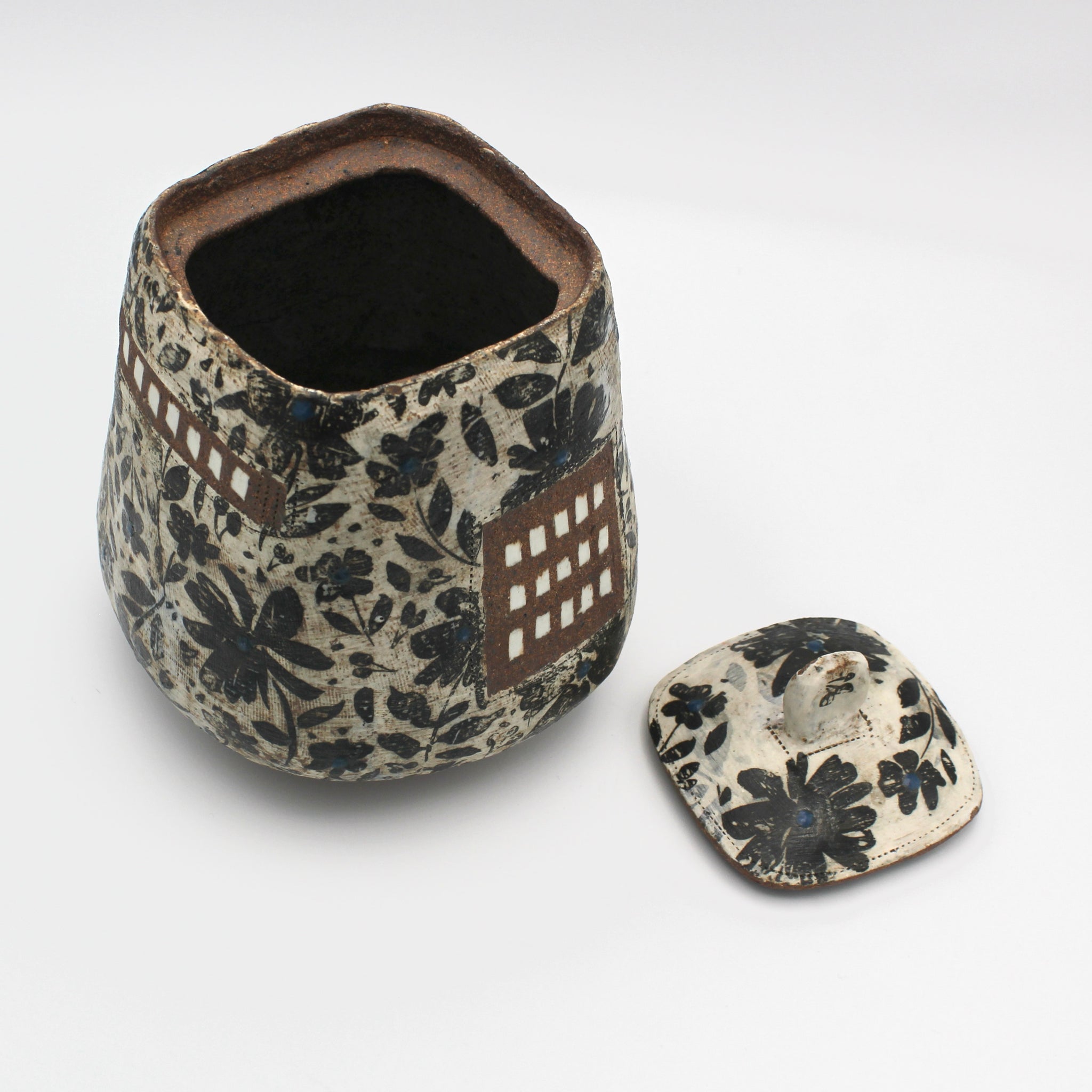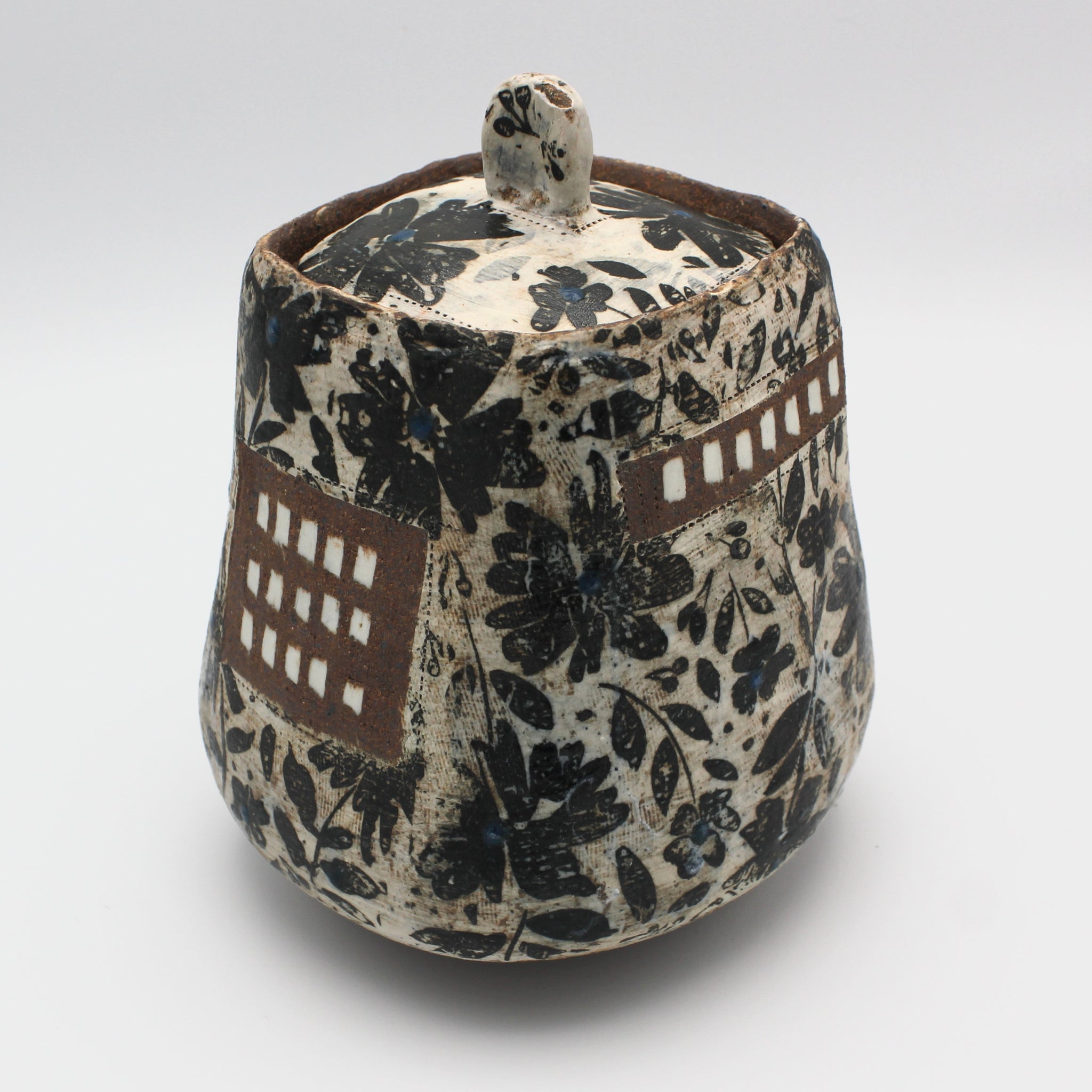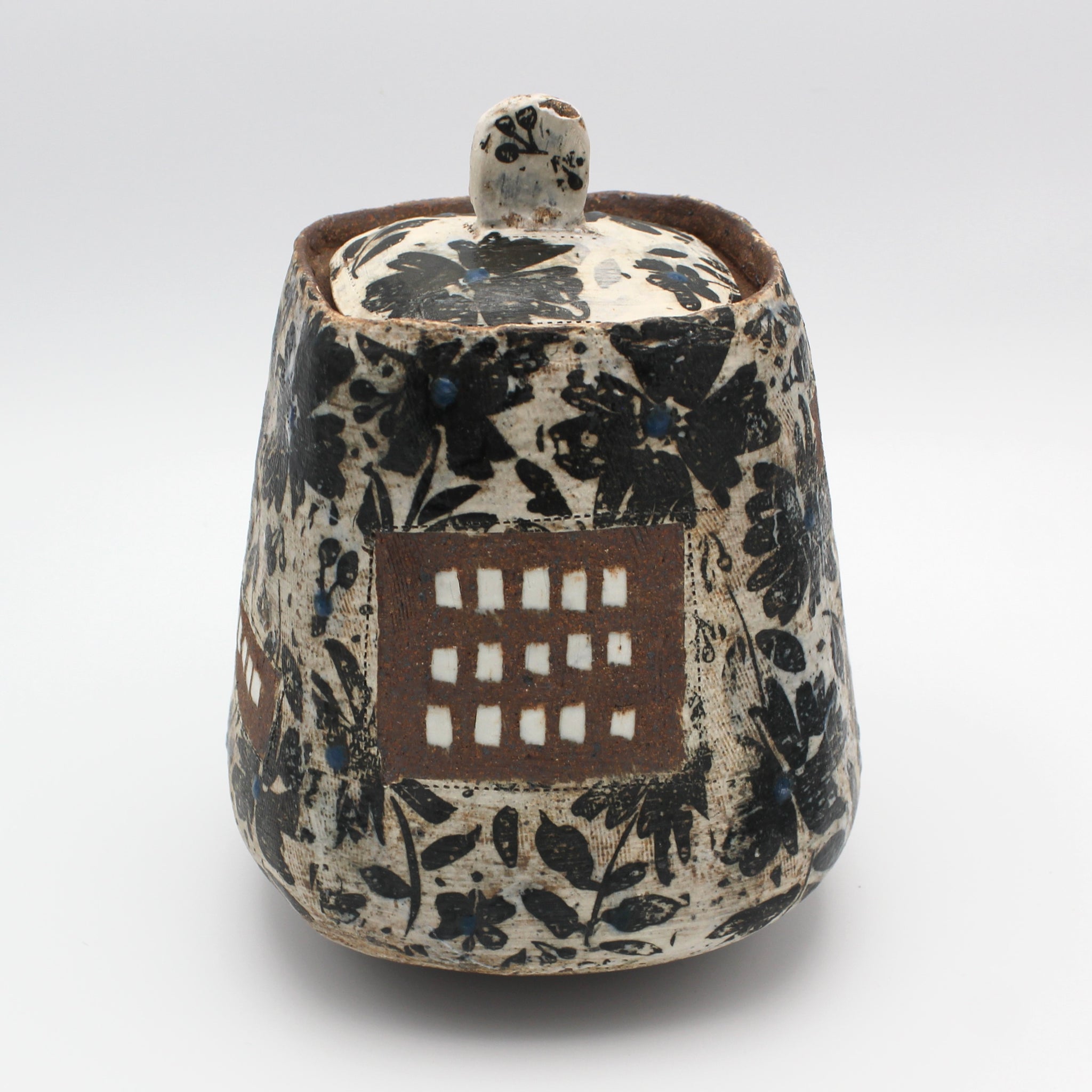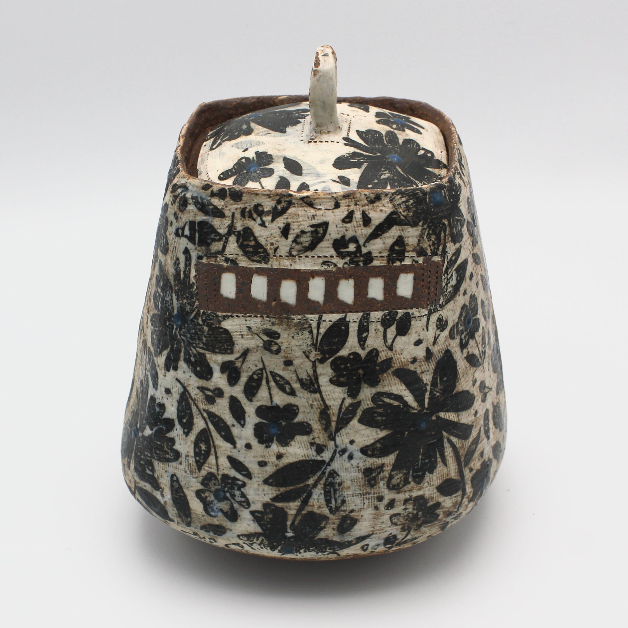 Gail Miles uses a variety of beautiful finishing techniques on her porcelain and stoneware pottery. Earthy, matte clays are enhanced by the contrast of soft, luxurious jewel-toned glazes and printed patterns. This piece features silhouetted black flowers with blue centers on white painted slip. The piece measures 8" in height and 5.5" in diameter.