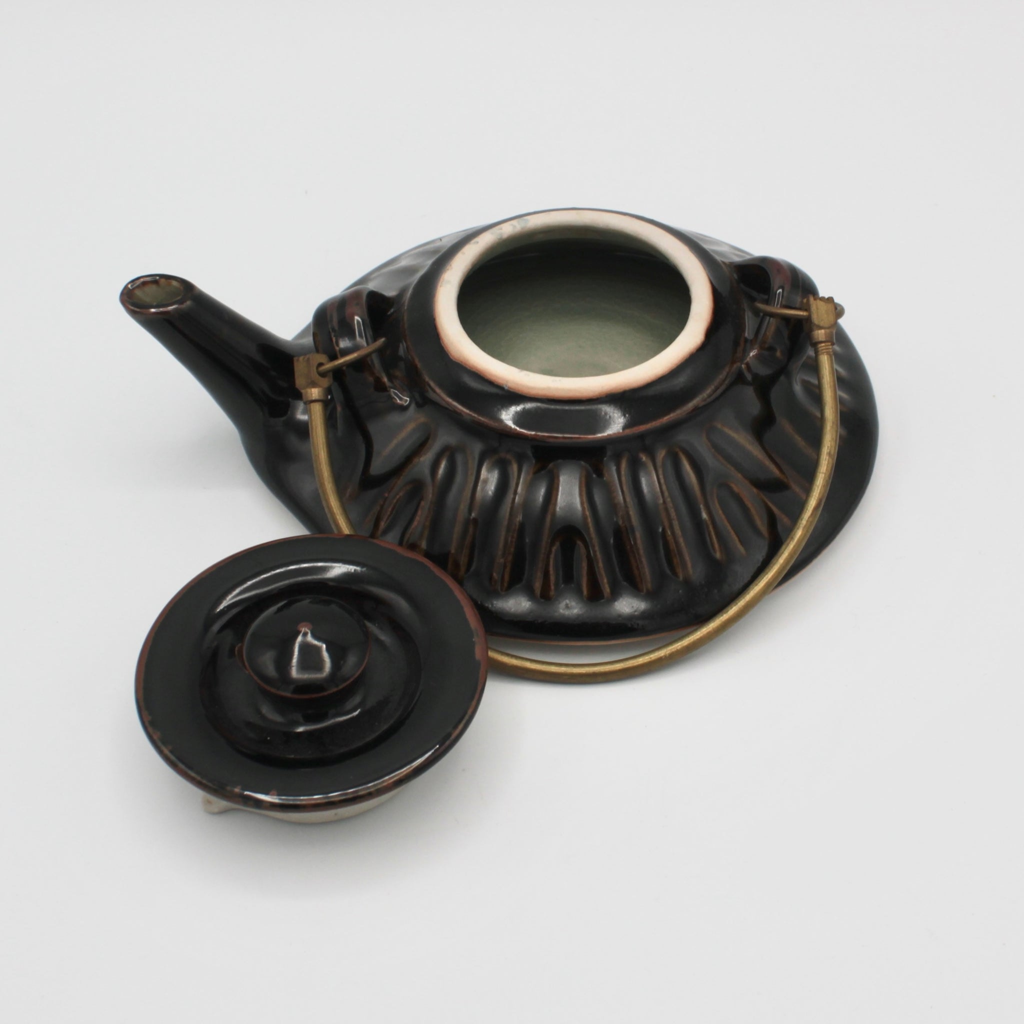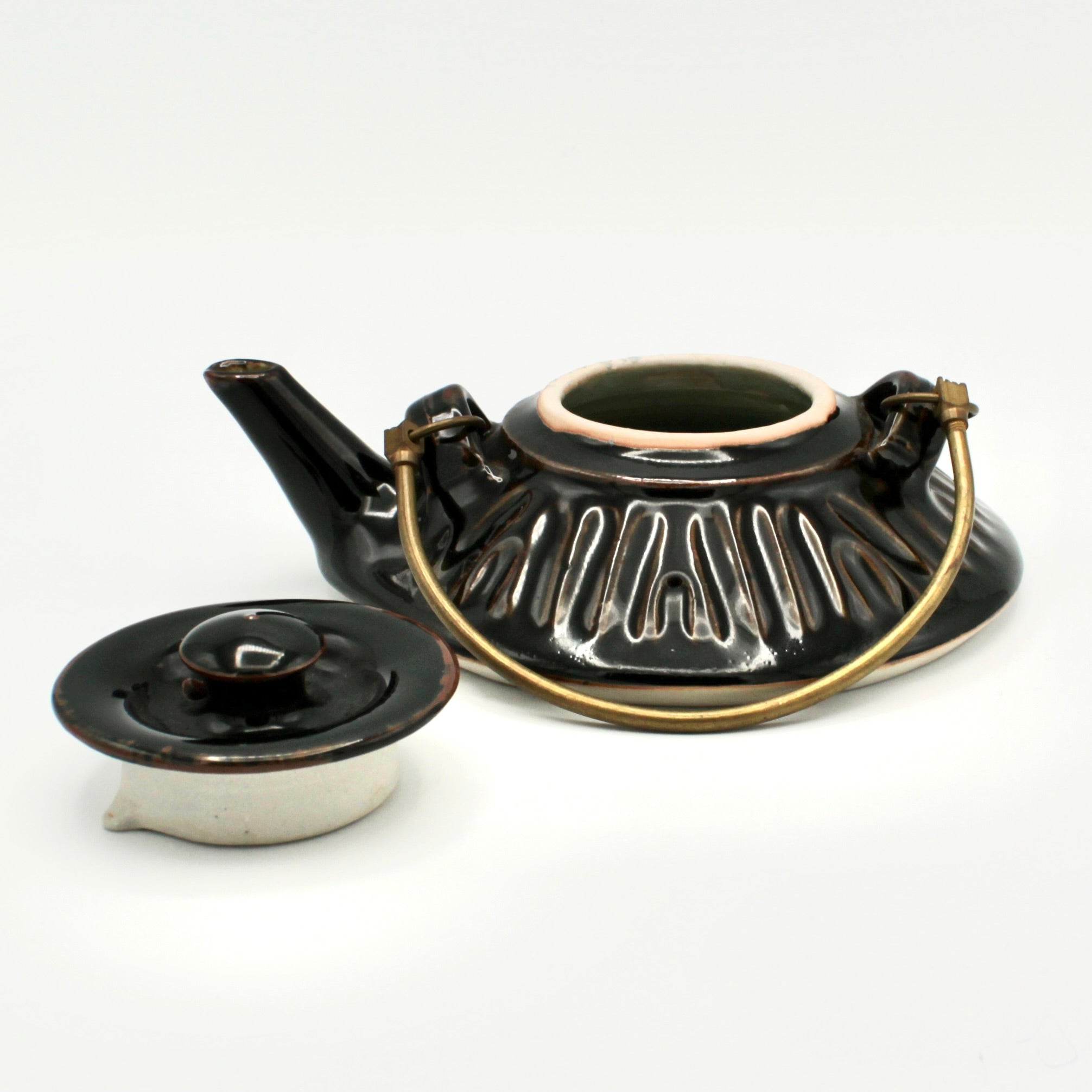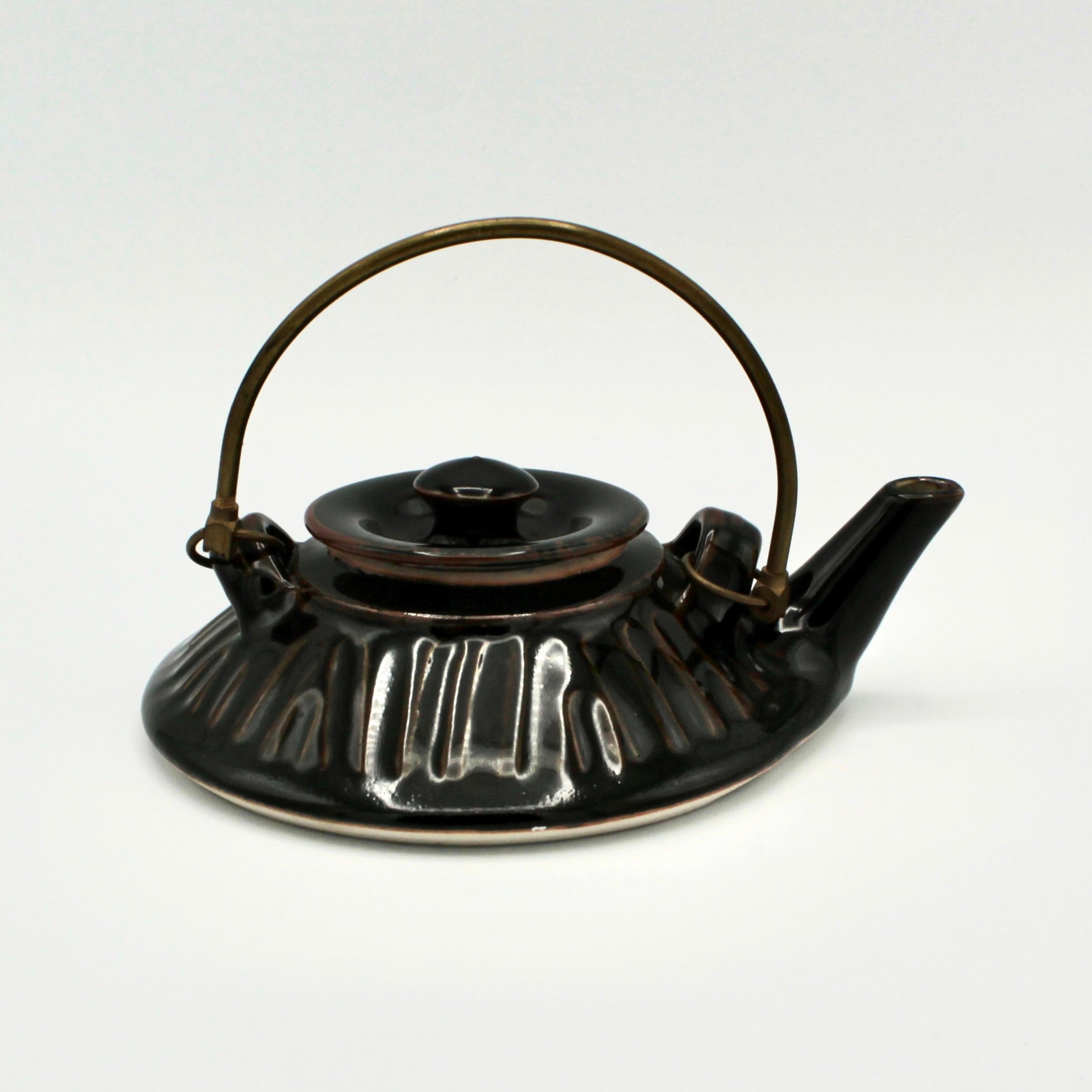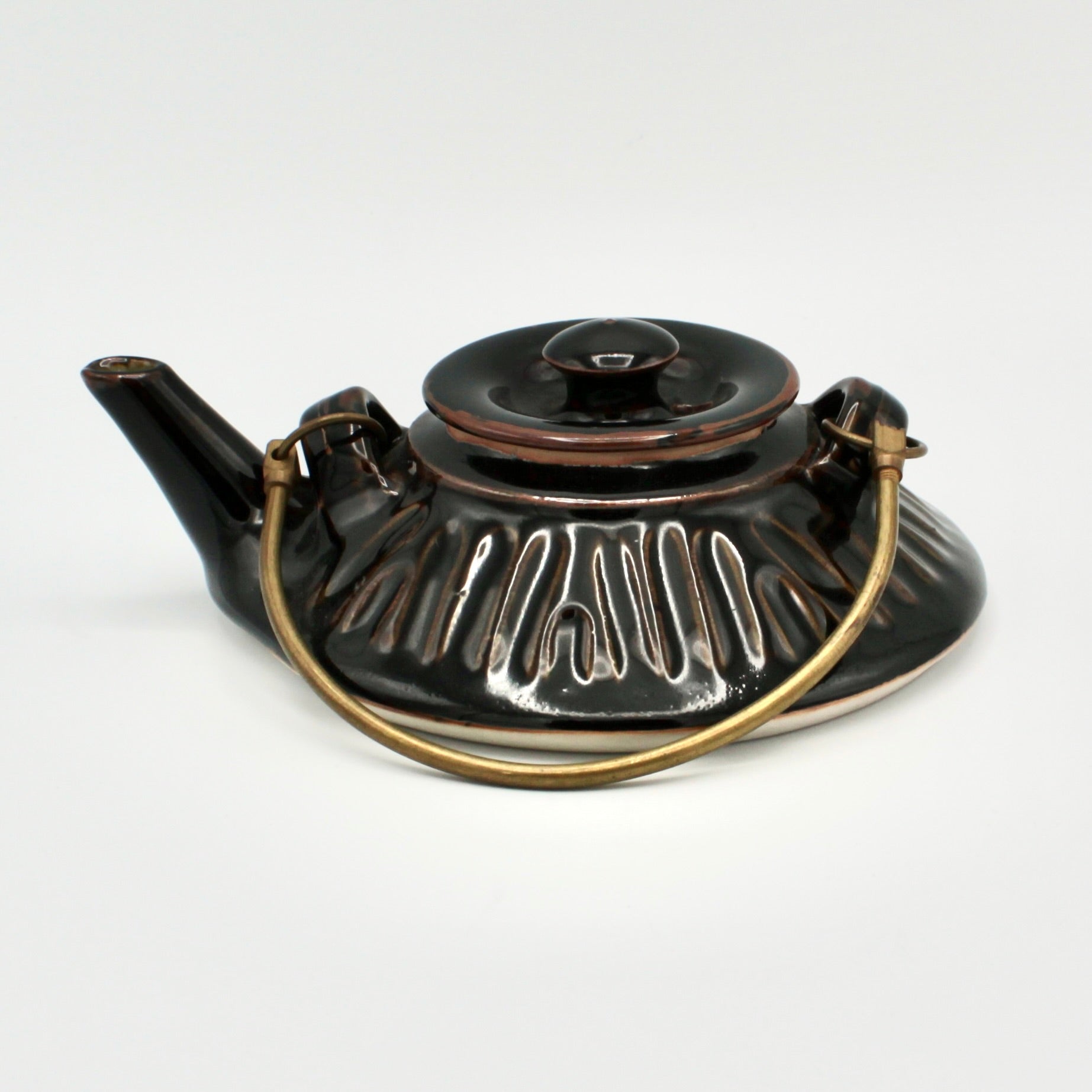 Longtime ACCI artist Susan Brody is back as a Holiday Guest Artist for the end of 2025! As ever, Brody's work is elegant, solid, and functional. This teapot has a beautiful, flat silhoutte and brass metal handle. It features a classic glossy black and brown glaze over angular, fluted marks in the body of the teapot. It measures approximately 2.25" in height and 5" in diameter. Its handle reaches about 4.5" in height.