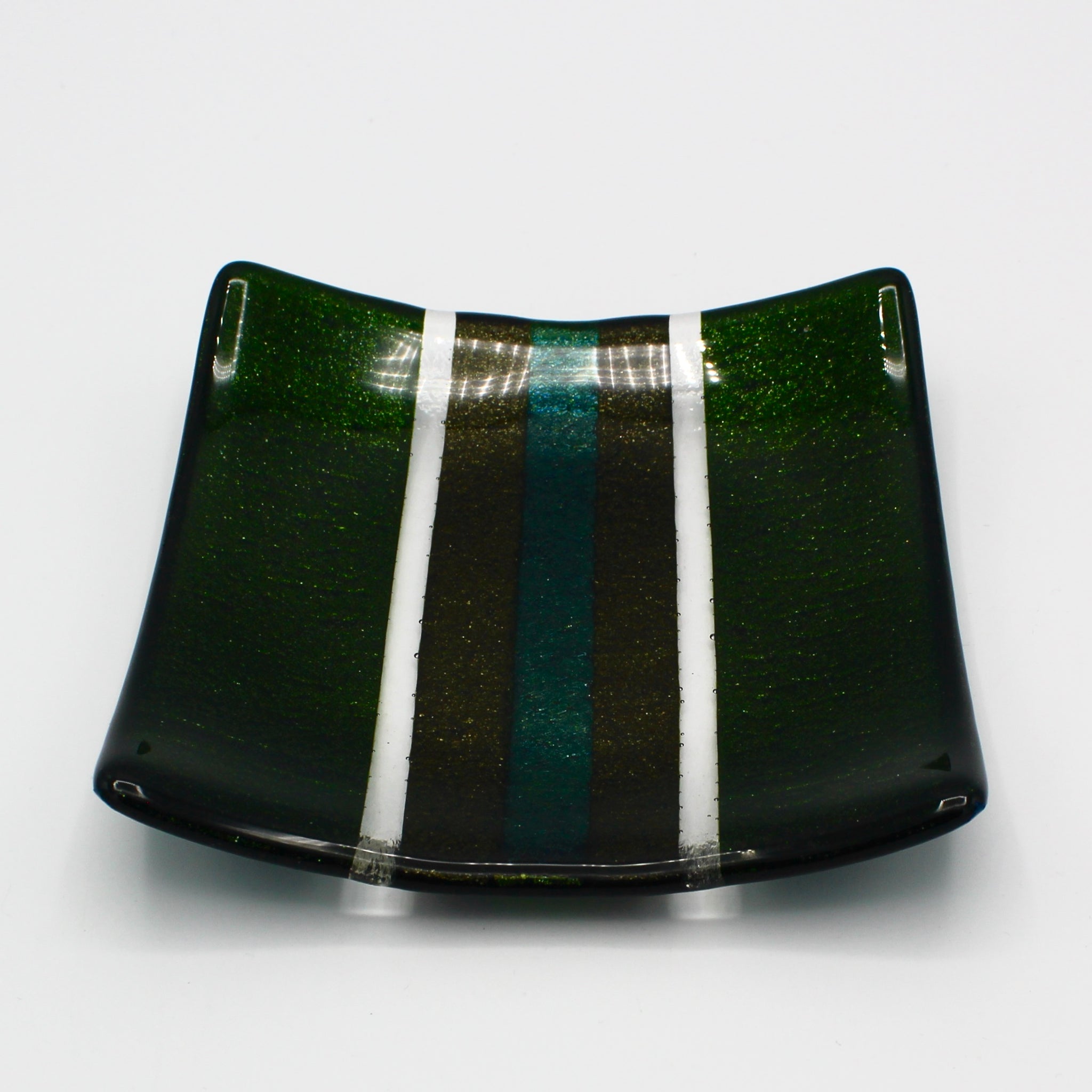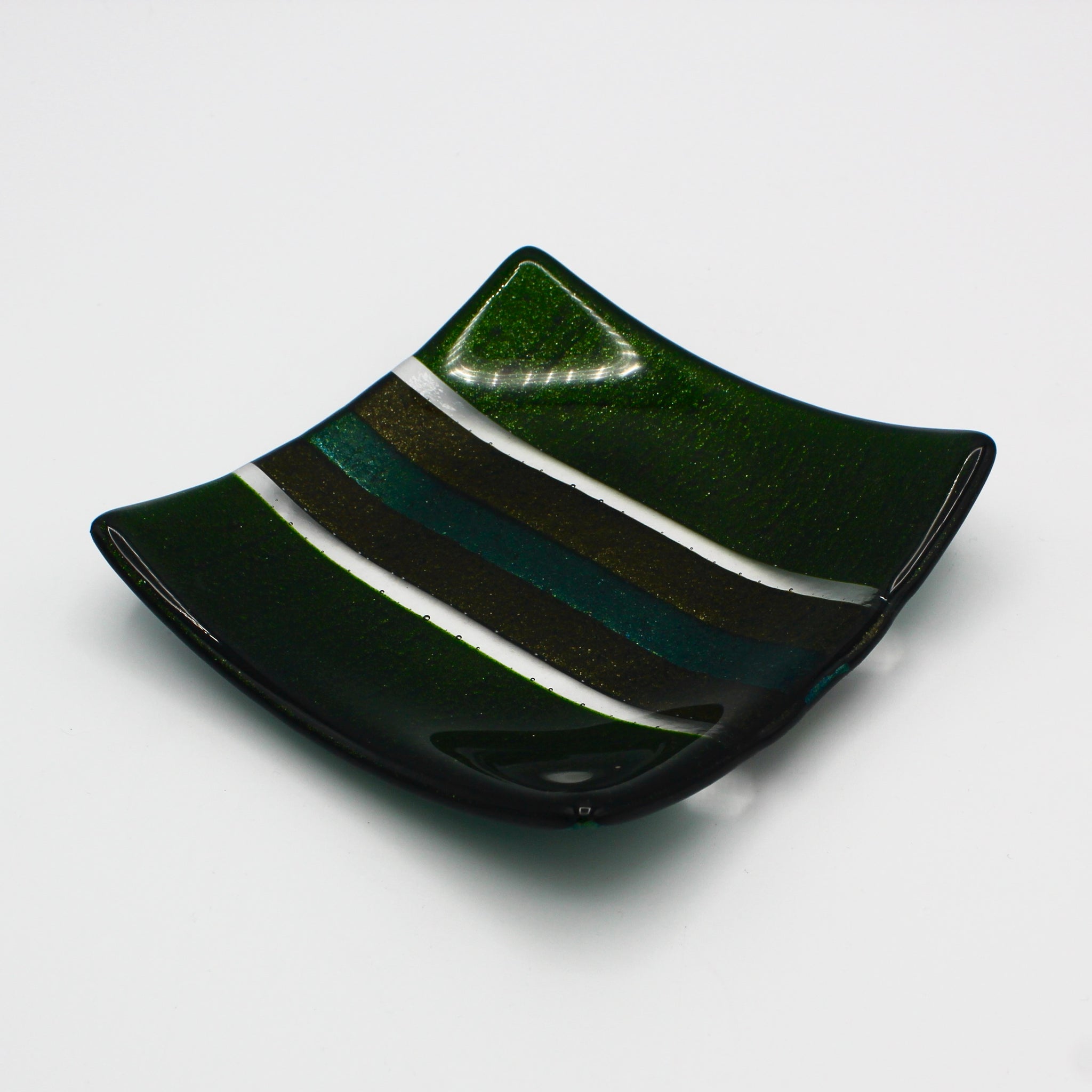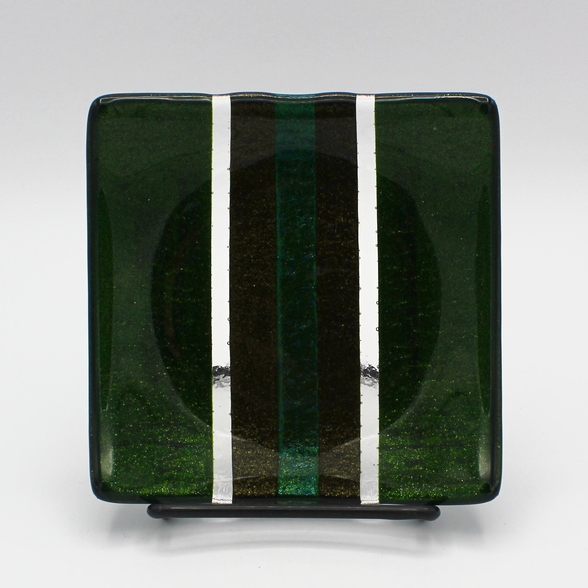 Mark Schatz's career in architecture really shines through his elegant and intricately assembled fused glass creations. This beautiful fused glass accent plate measures 5" square with just about 1" of height at its corners. This dish, along with many of Mark's beautiful pieces, can serve equally well as a tapas or hors d'oeuvres plate, nut/olive dish, or trinket holder for keys and rings.