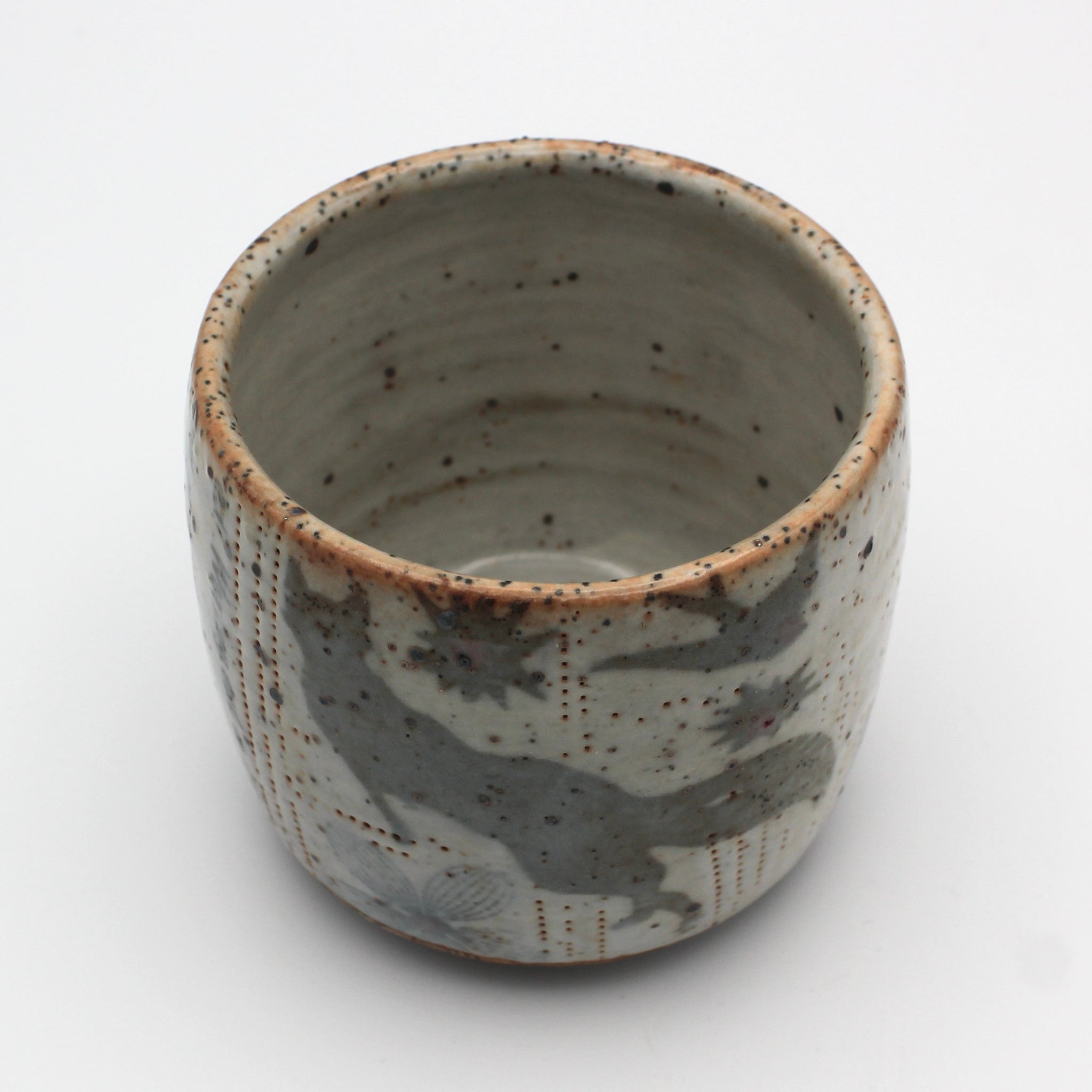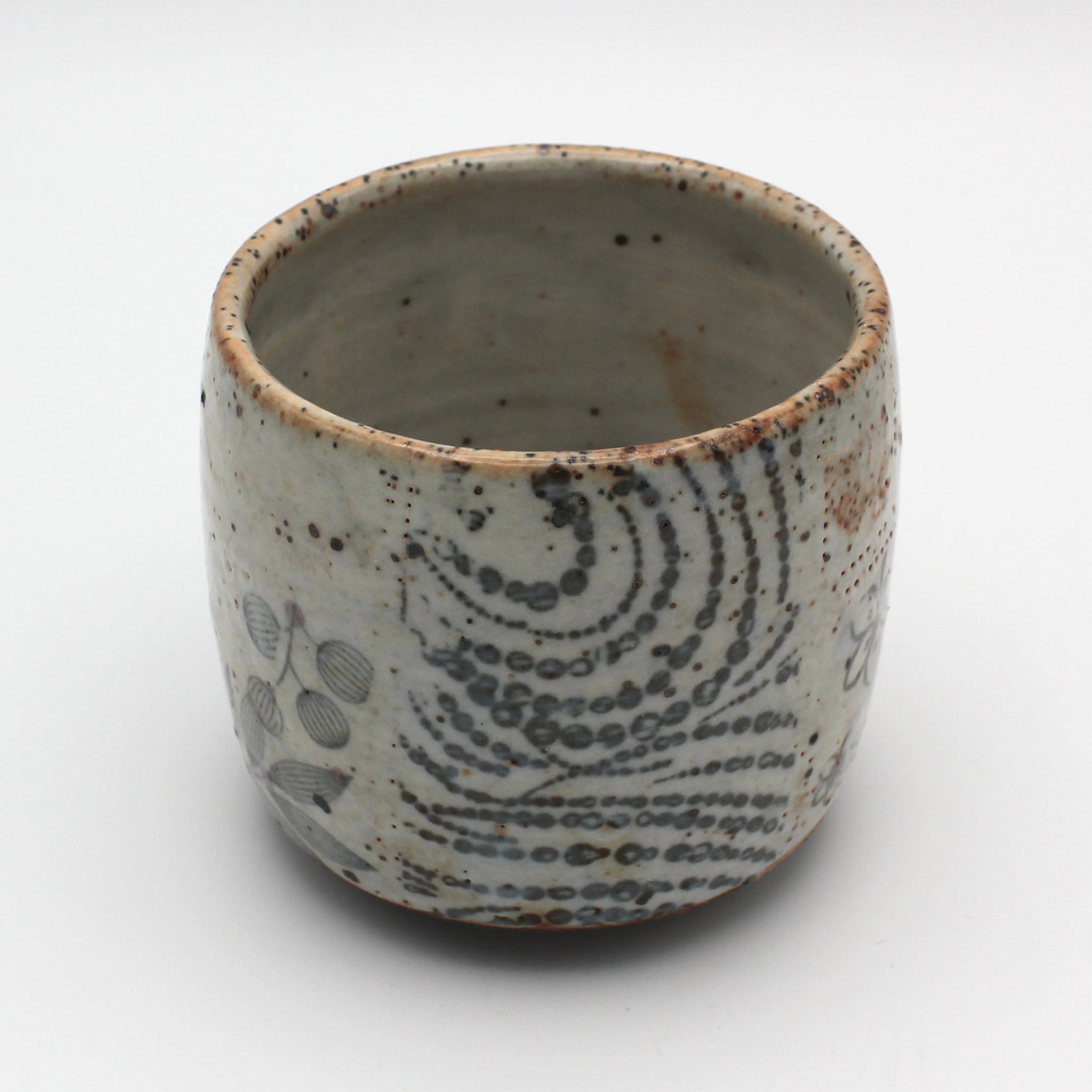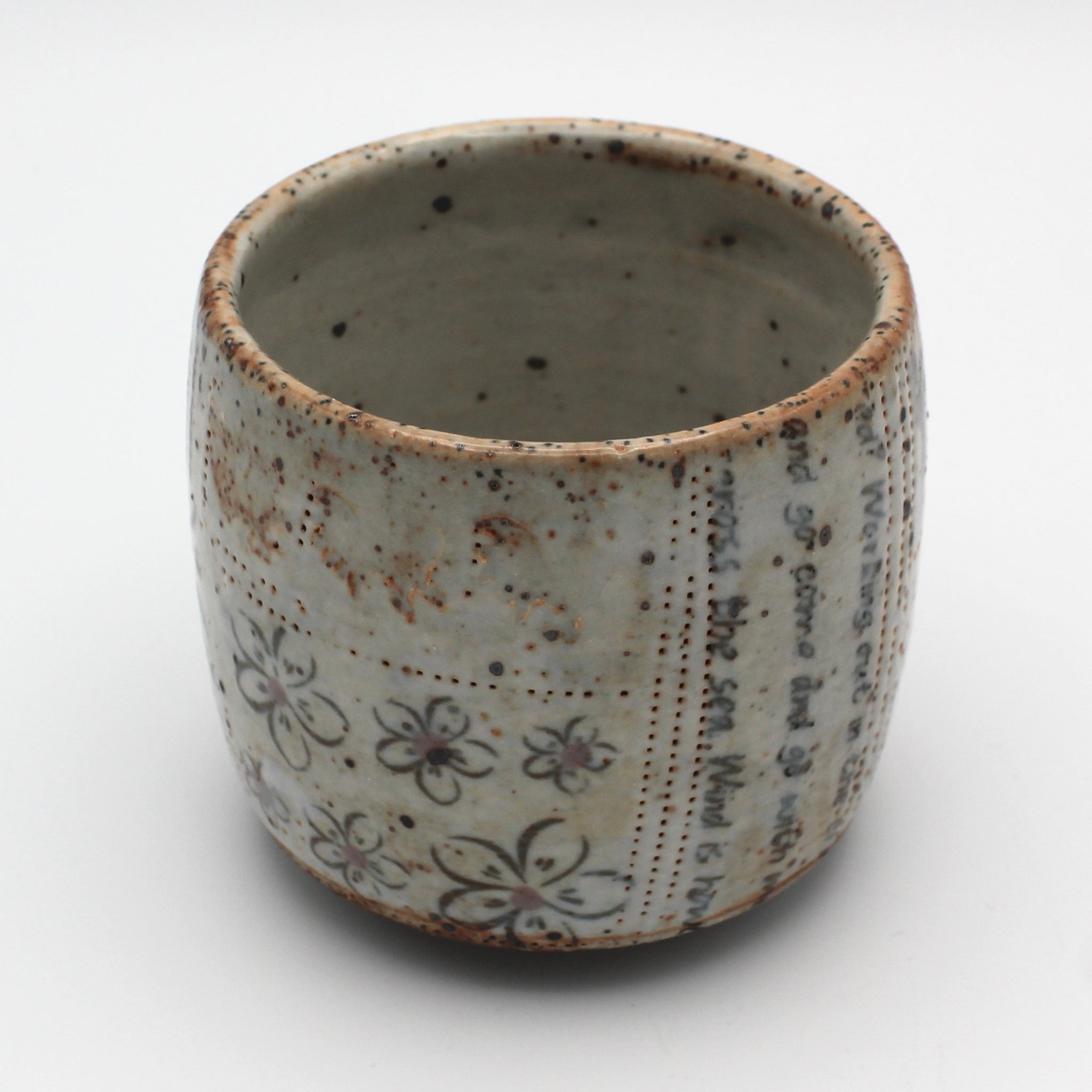 Gail Miles uses a variety of beautiful finishing techniques on her porcelain and stoneware pottery. Earthy, matte clays are enhanced by the contrast of soft, luxurious jewel-toned glazes and printed patterns. This tumbler features an amalgamation of Miles' signature aesthetic--printed botanical patterns, bluegrass lyrics, and a silhouetted fox showing through a complex shino glaze. It measures about 3.5" in height and diameter.