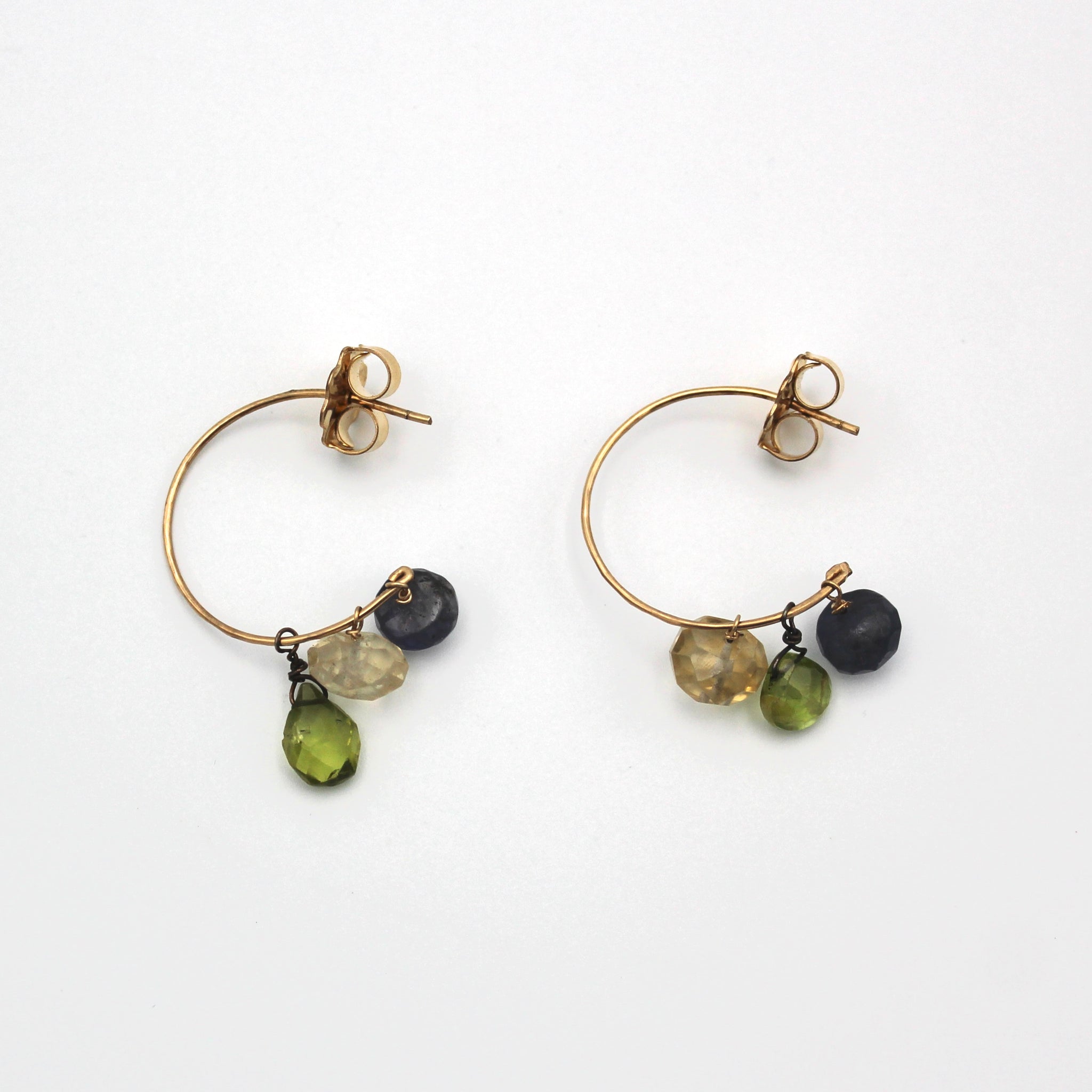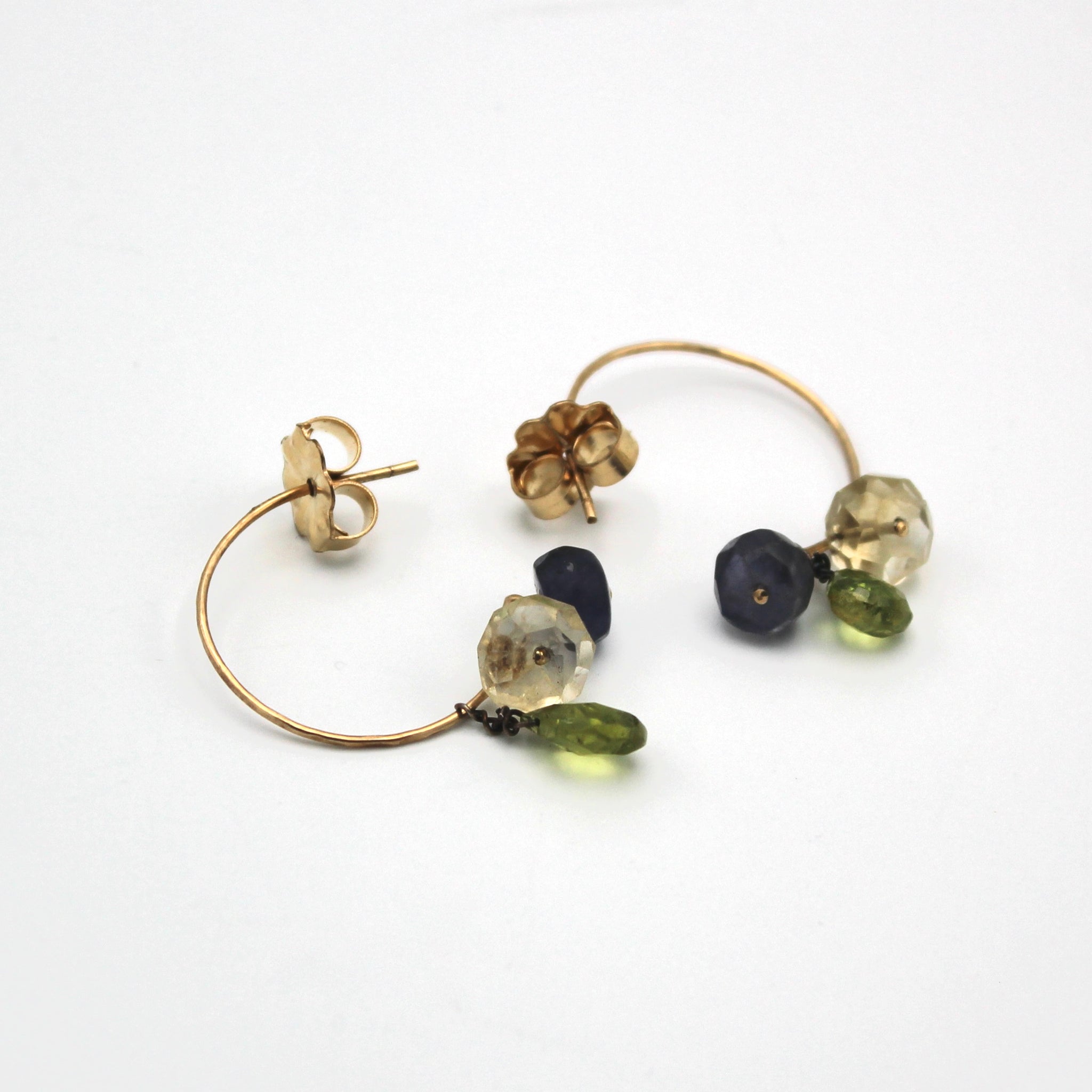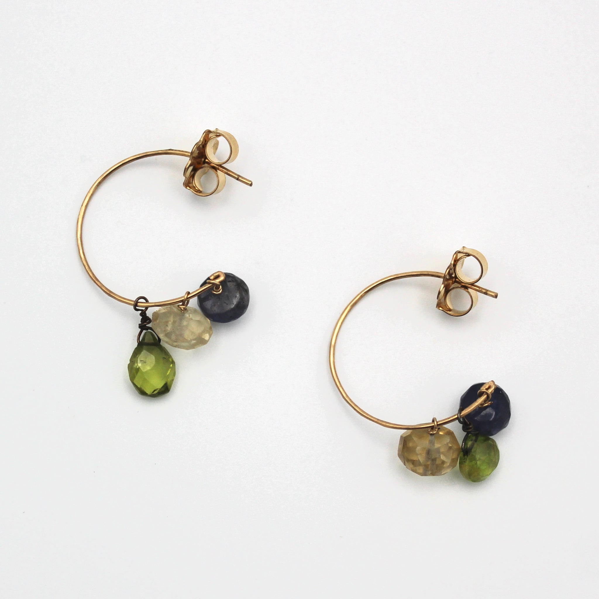 Janet Kaufman combines pearls, gems, silver and silk into delicate, artful and unique jewelry. With a boost of color from alcohol inks, her fanciful work is sure to catch the eye. These gold filled hoops are adorned with citrine, iolite, and peridot gemstones. They measure about 1.25" long.