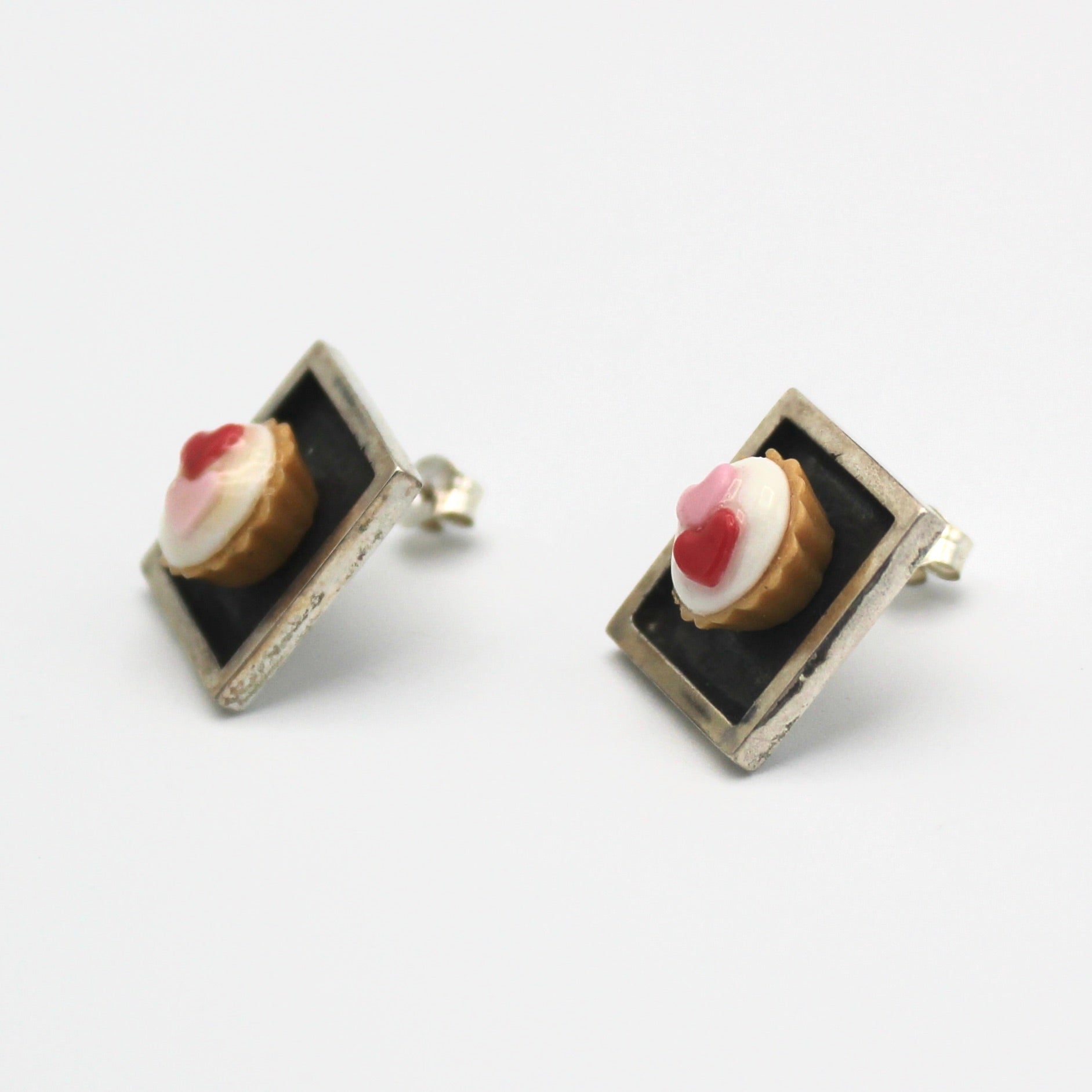 Carolyn Tillie's unique jewelry reflects her love of history, antiques, and whimsical miniatures. These "heart tart" stud earrings feature sterling silver posts set with miniature tarts. Each stud measures 0.5" square.