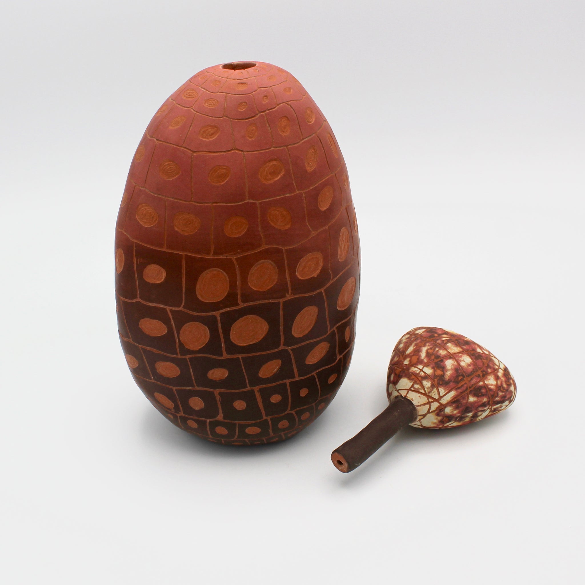 Terri Scheid's works are formed by pinch, coil, and slab construction. Layered underglazes are accented, complicated, and expanded by sgraffito into the clay. Once fired, the pieces are wet sanded to reveal the multiple layers of color, then sometimes drawn onto, and then fired again with clear glaze. Her work is primordial, vibrant, and ocassionally gravity-defying. This vessel features a stunning rusty gradiant, asymmetrical, organic shape, and measures 9.5" in height.