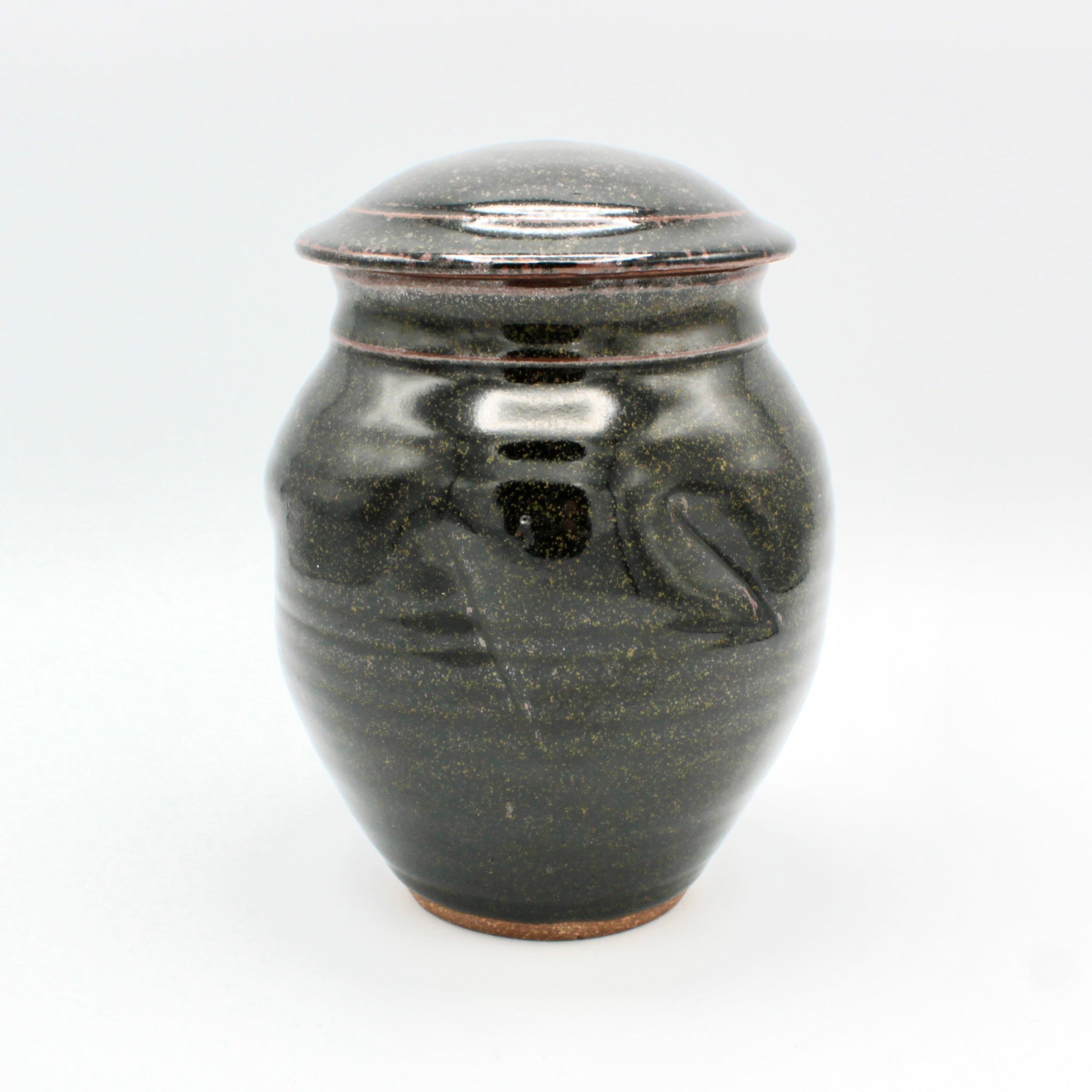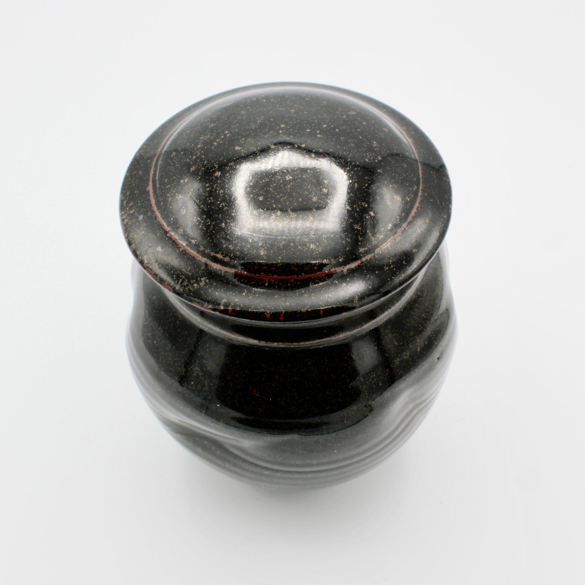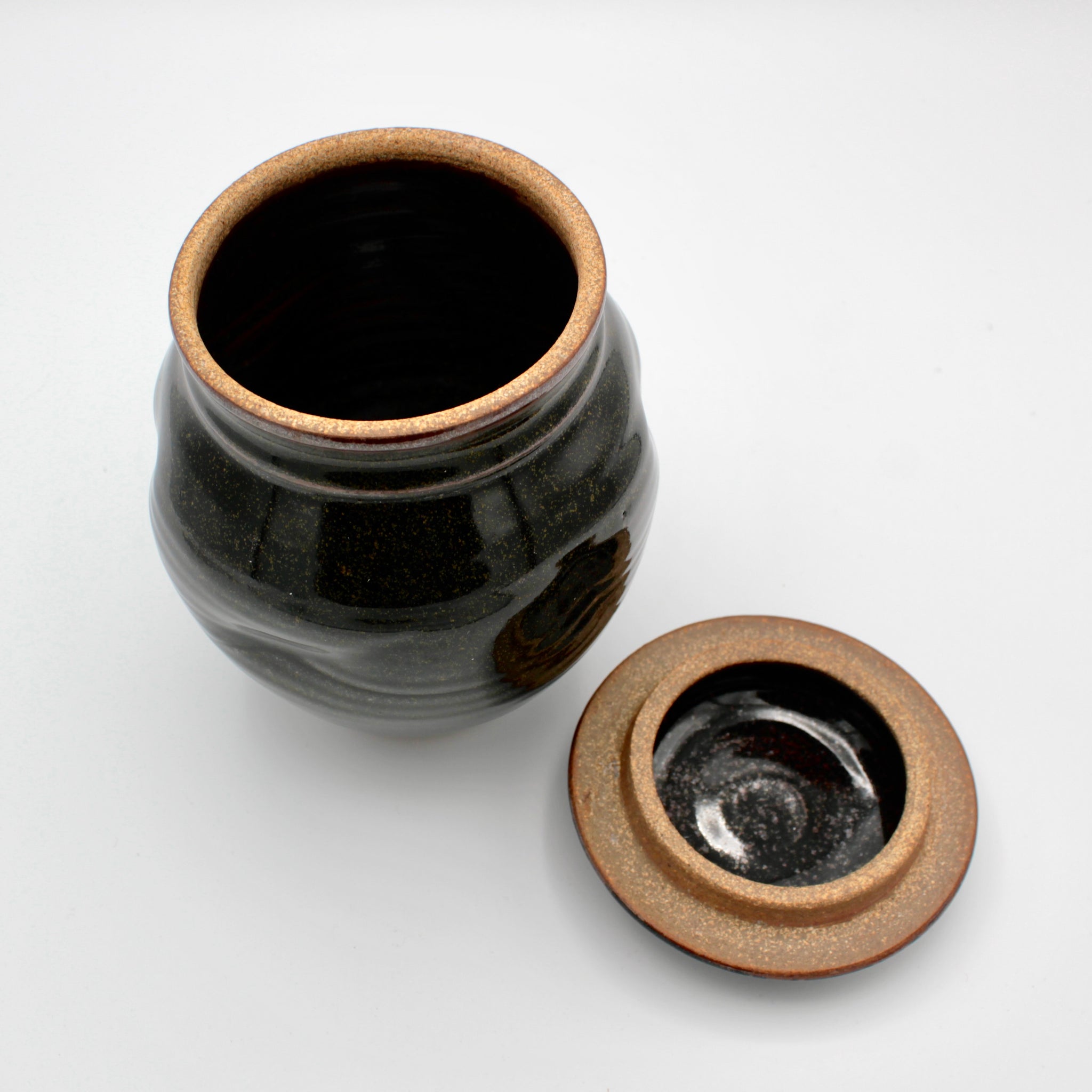 Longtime ACCI artist Susan Brody is back as a Holiday Guest Artist for the end of 2025! As ever, Brody's work is elegant, solid, and functional. This lidded jar has a beautiful, full silhoutte with decorative indentations around its circumferance. It features a classic speckled black and brown glaze. It measures approximately 7.5" in height and 3" in diameter at its opening.