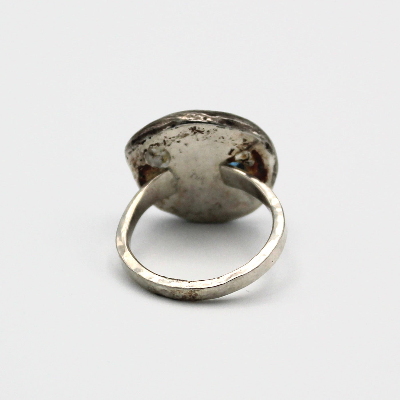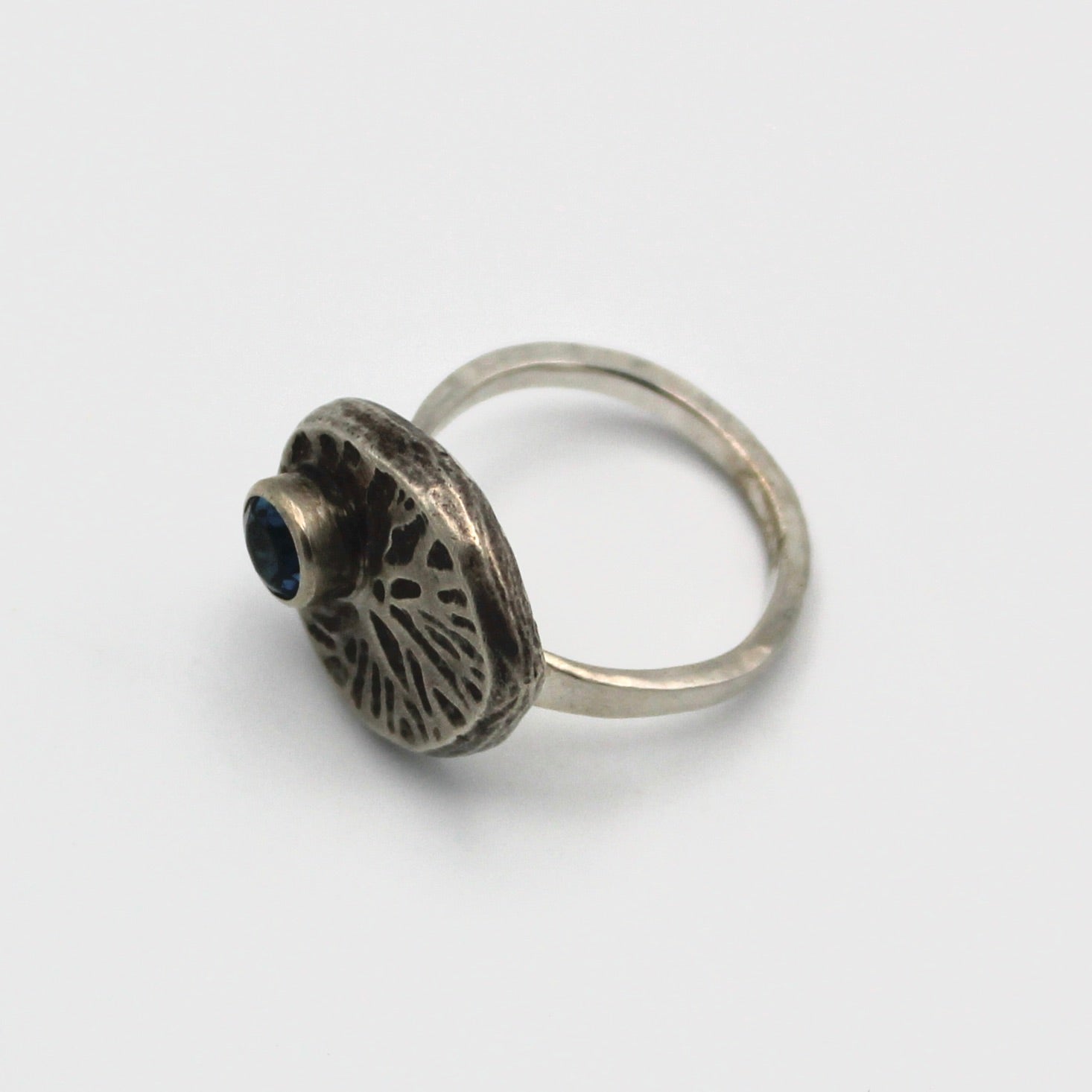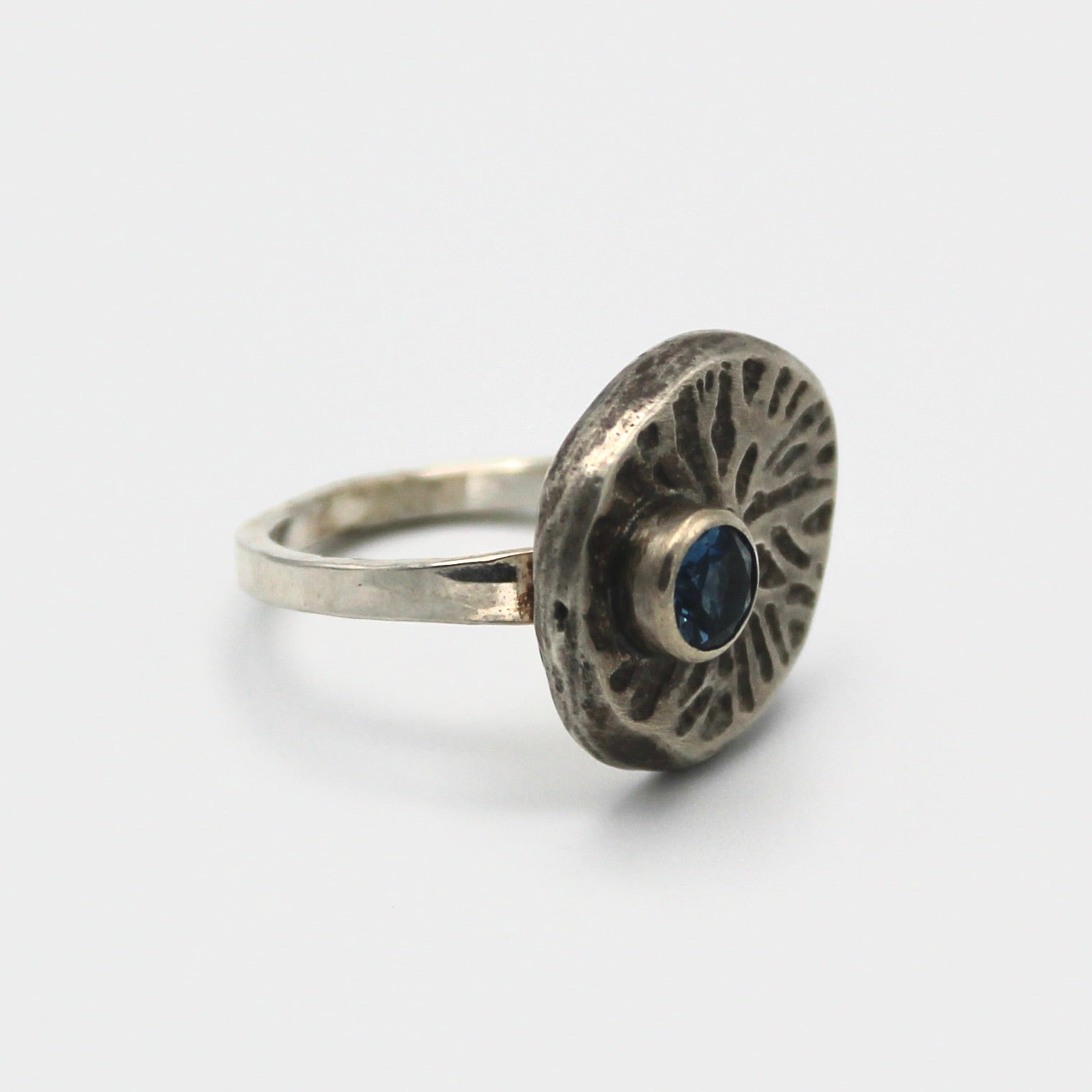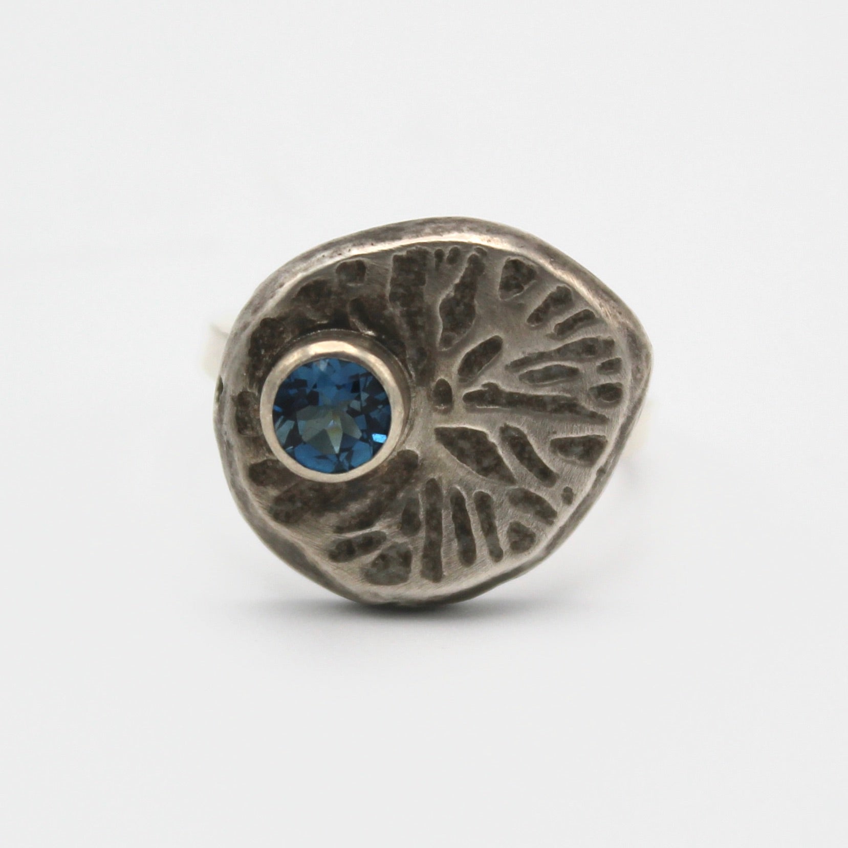 Jenny Windler's work combines artistic enamel work with precious metals and gemstones. This gorgeous statement ring combines organic patterned sterling silver with a london blue topaz stone. The ring face measures about 5/8" in diameter and the ring is approximately a size 7-8.