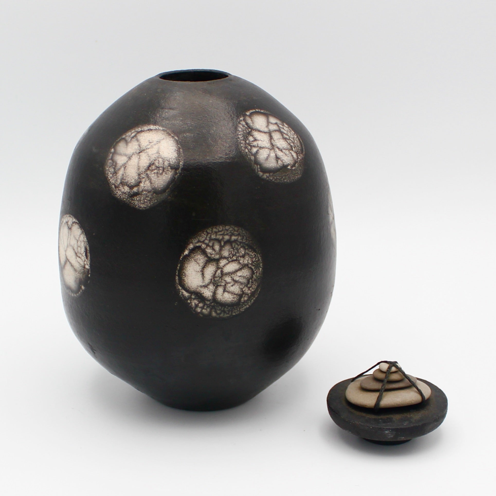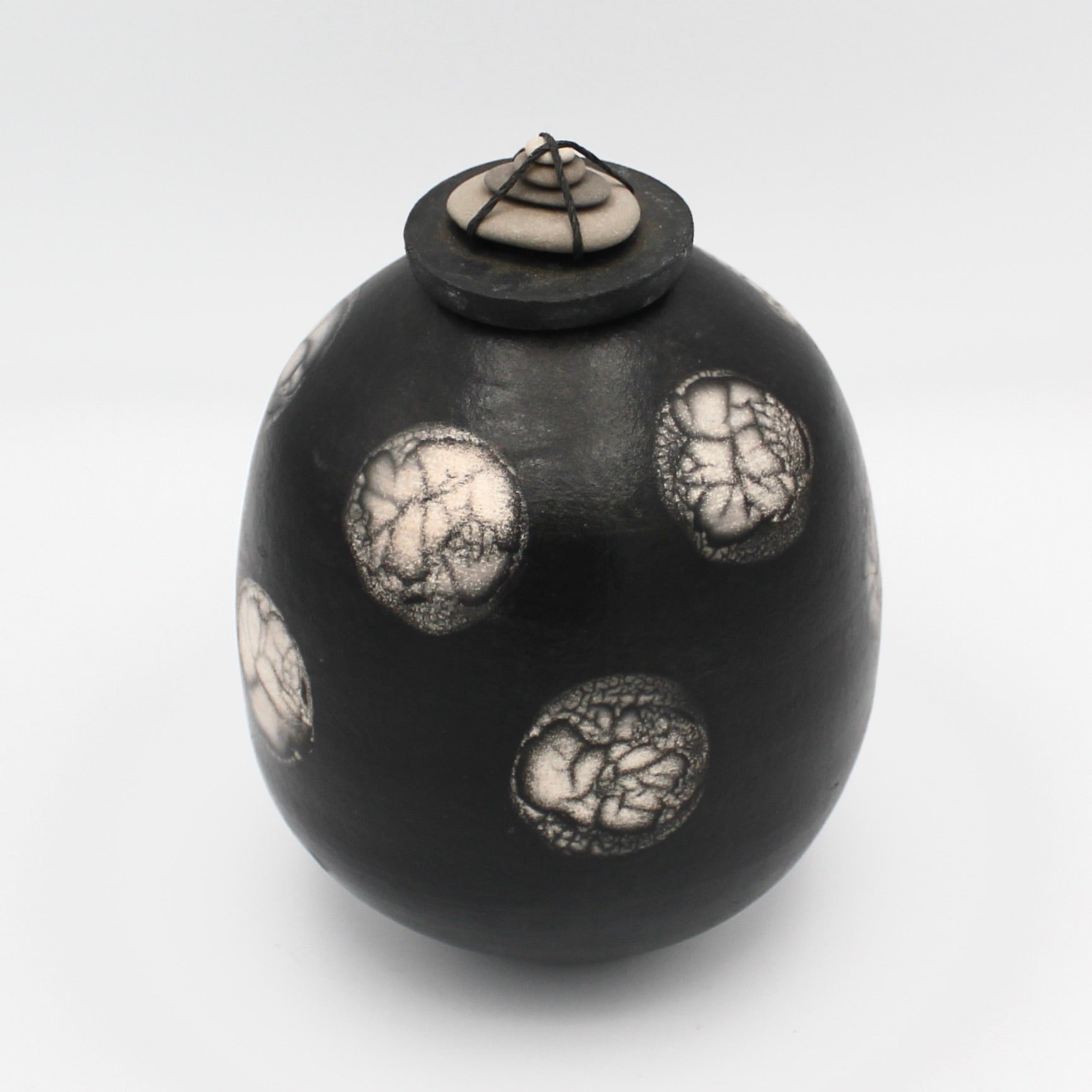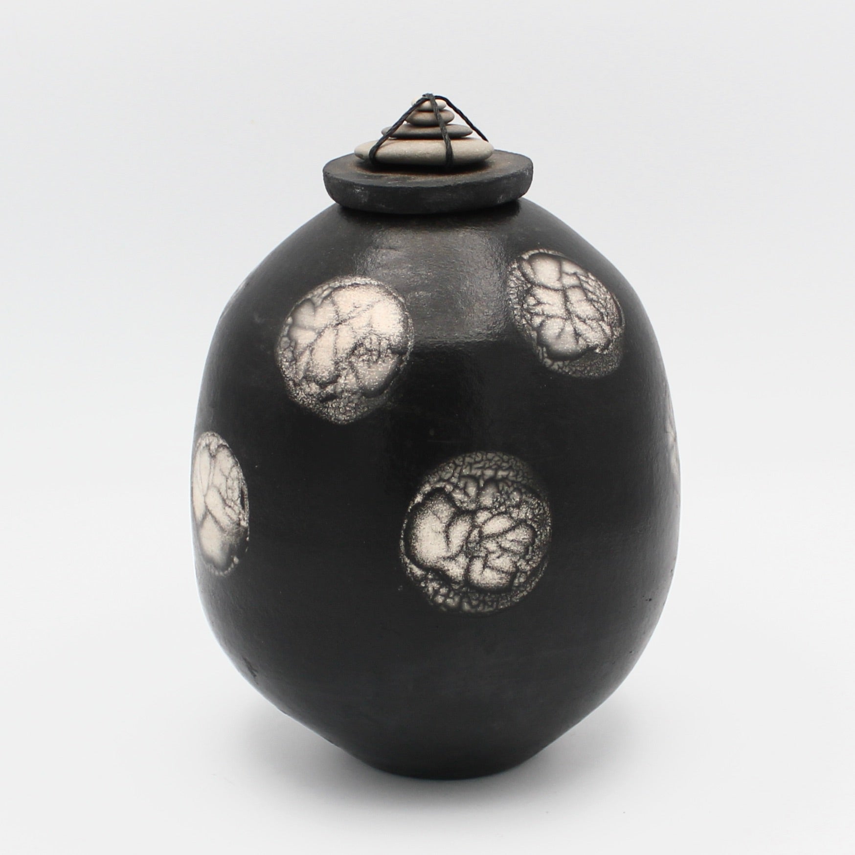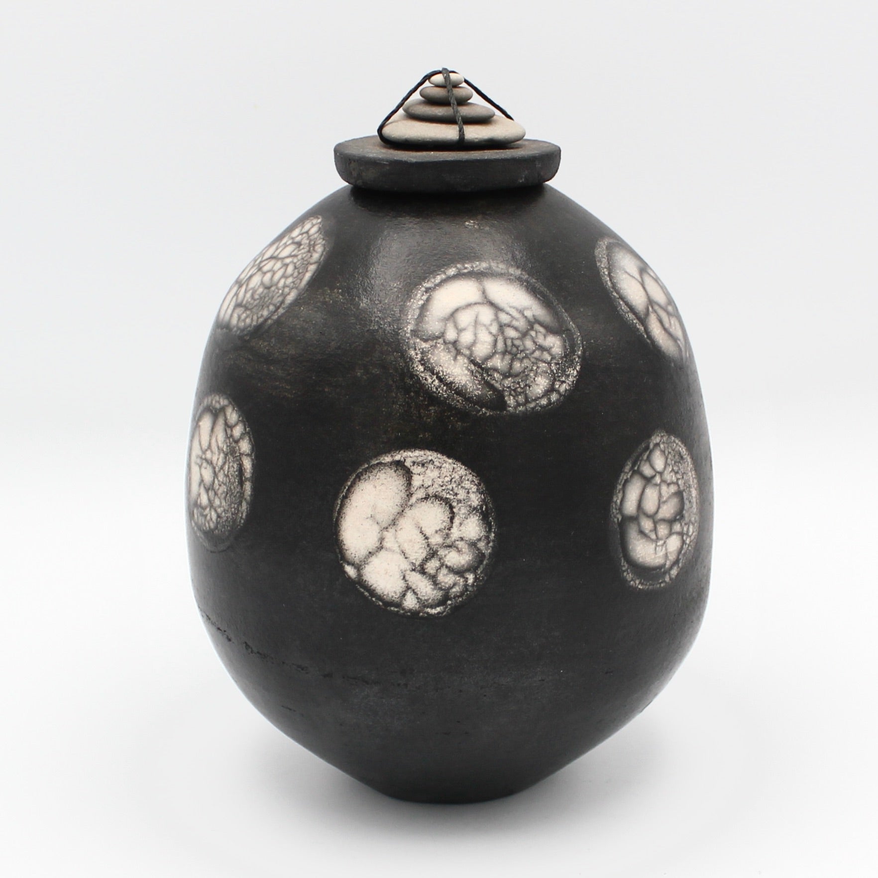 Ruth Ehrenkrantz is a ceramic artist specializing in naked raku, a technique that embraces the unpredictable nature of the firing process to create one-of-a-kind vessels adorned with timeless patterns. This vessel is an ideal wishing jar: an organic receptacle for your deepest hopes. Picture your intention, lift the lid, and whisper your wish into the depths and spend a moment touching the vessel. This piece features a stacked stones gathered near water, and measures about 7" tall and 5" in diameter.
