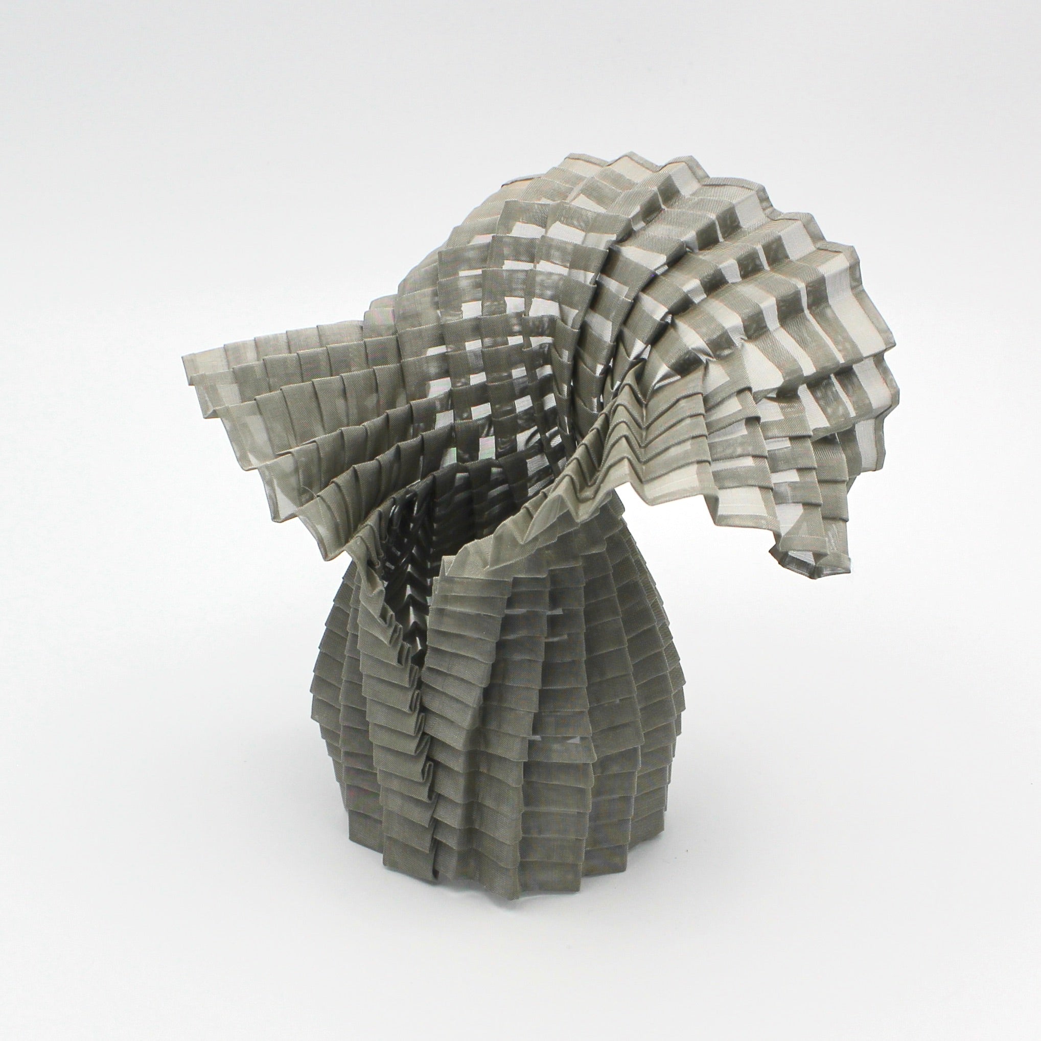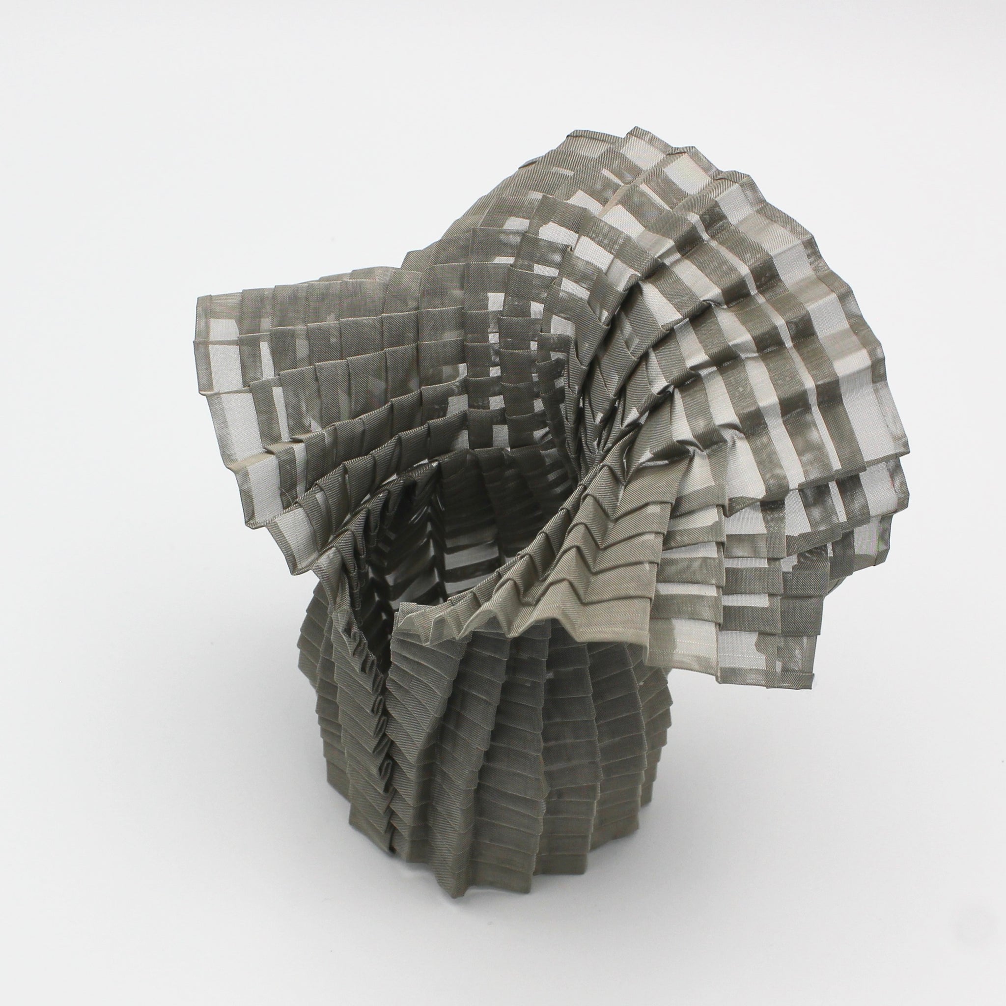 Goran Konjevod's sculptures transform encaustic paper—wax-infused for enhanced texture and durability—into organic, three-dimensional abstract forms through simple straight-line folds and pleats, drawing inspiration from origami, bamboo basketry, ceramics, and weaving. An expansion of Goran's usual work in paper, this sculpture is folded from woven stainless steel mesh and measures about 5" x 4" x 5". PLEASE NOTE: this piece is currently being shown in our collaborative show with the Metal Arts Guild, "Bridging the Bay." It will be available to be shipped or picked up in store after the show closes on November 9th, 2025.