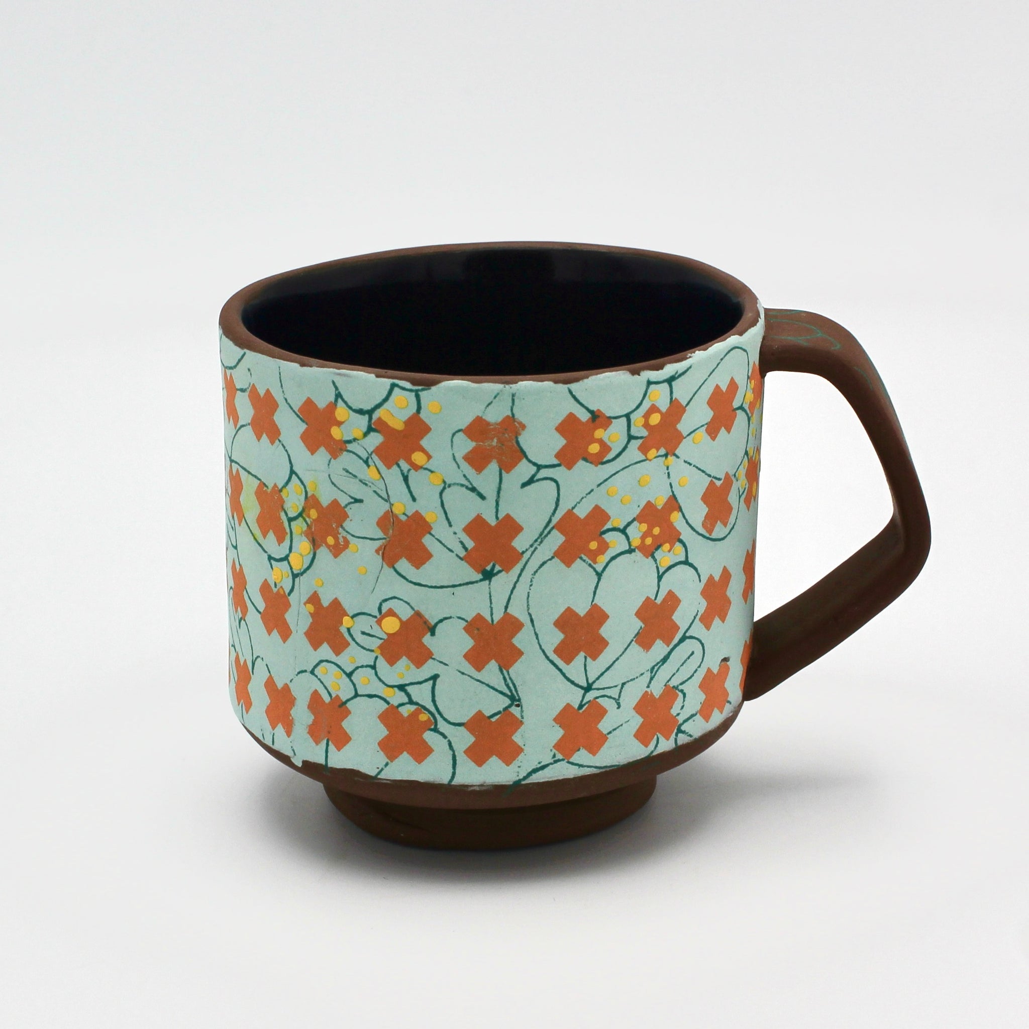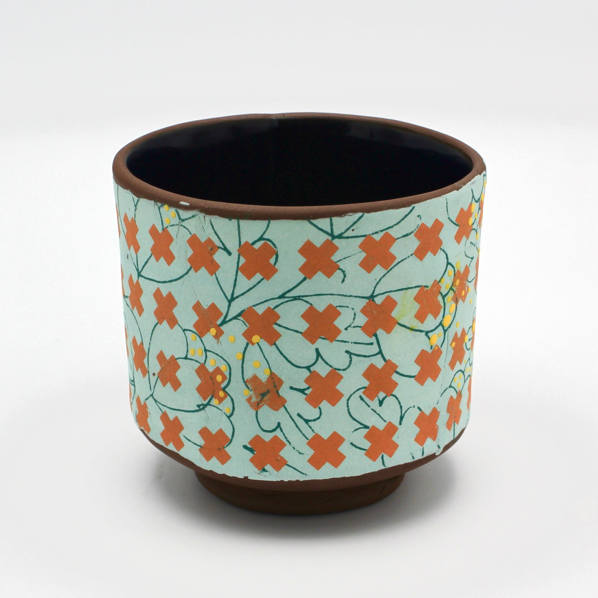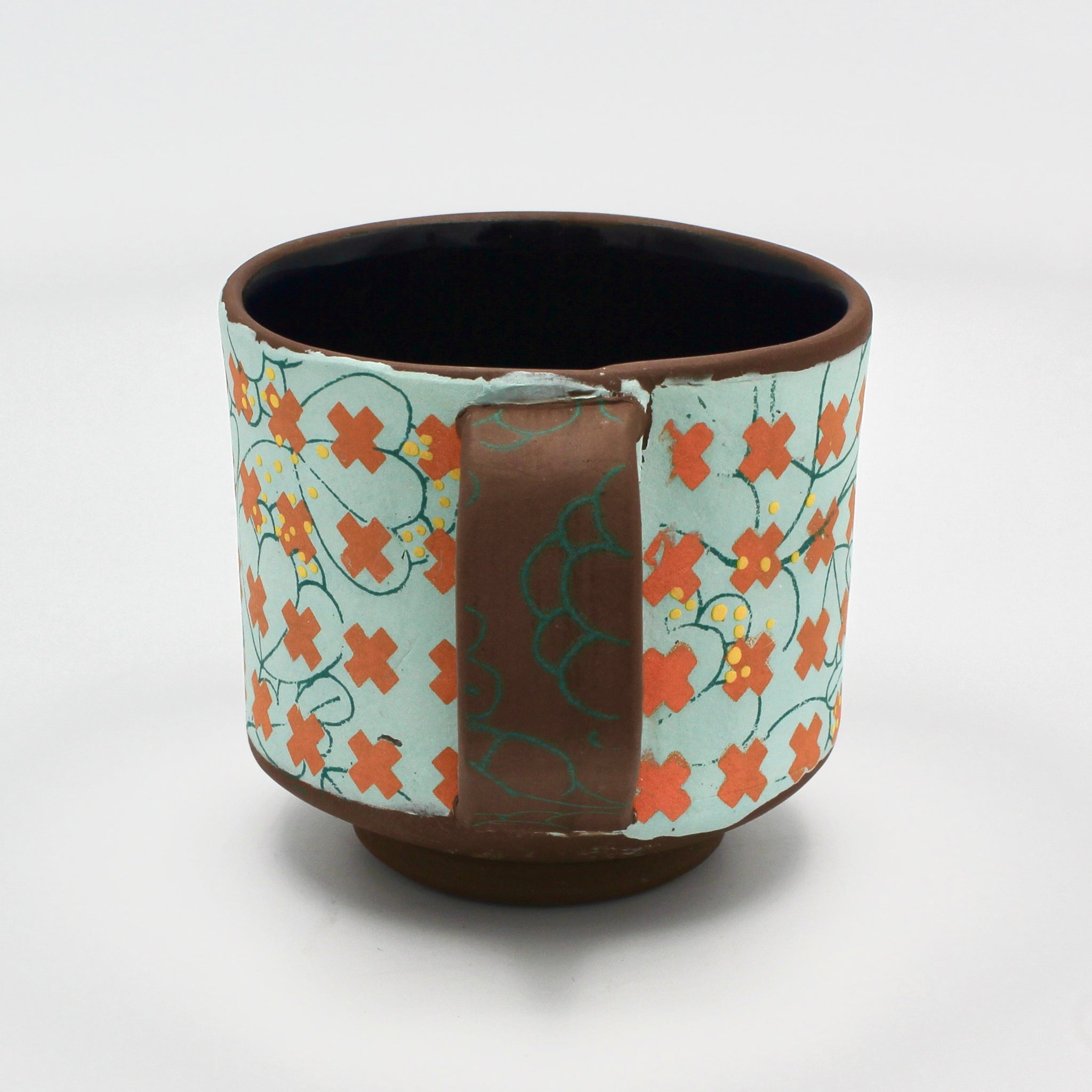 Deb Sullivan strives to create at the intersection where function meets art. Her vibrant pottery begins with a hand-rolled slab of clay. Each slab is textured with one of a kind stamps and rollers. After each slab is formed into a vessel, the vessel is adorned with newsprint transfers, underglazes, washes and glaze. The forms of the vessels reference California landscapes, and to further this, much of the vitrified clay is left bare - without glaze. All cone 6 pottery is lined with glaze and is food, dishwasher and microwave safe. This sweet mug is decorated with a bright orange and blue mixed pattersn and measures 3.5" in height and diameter.