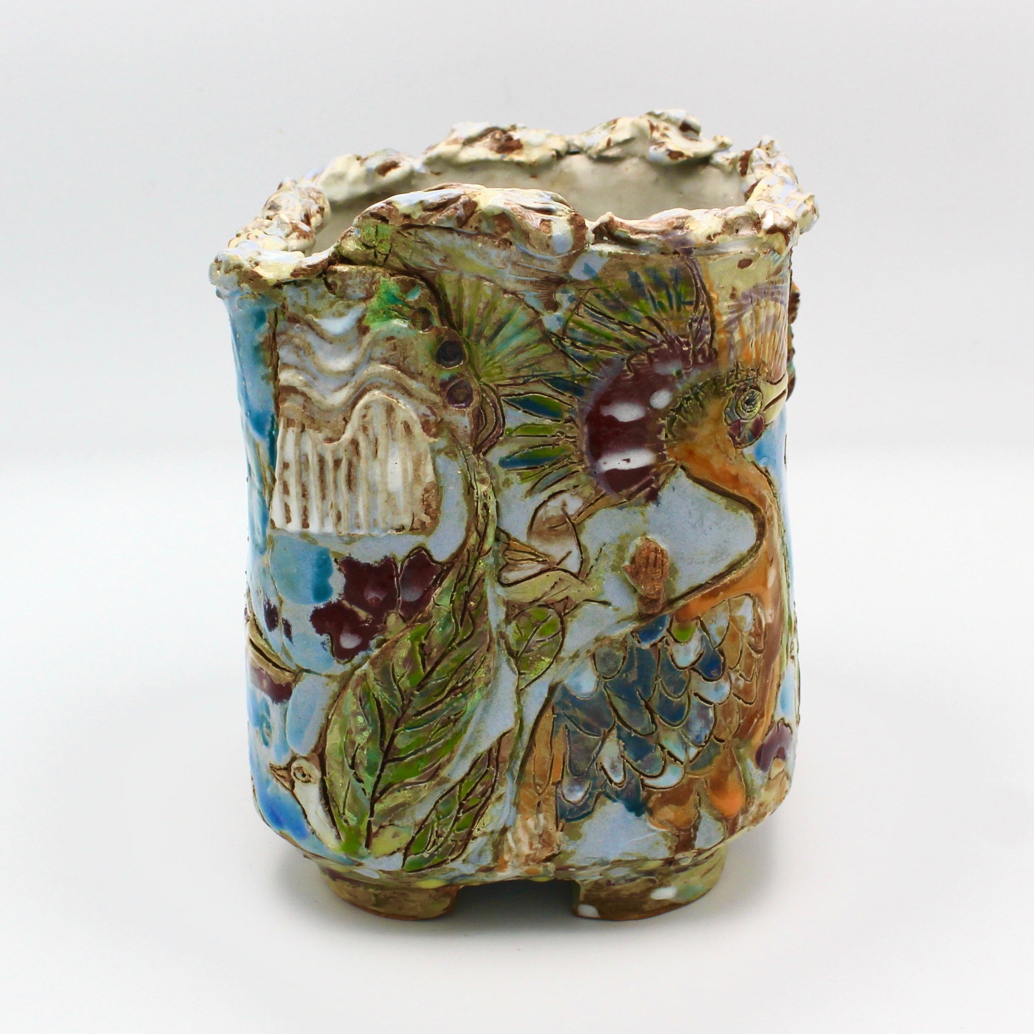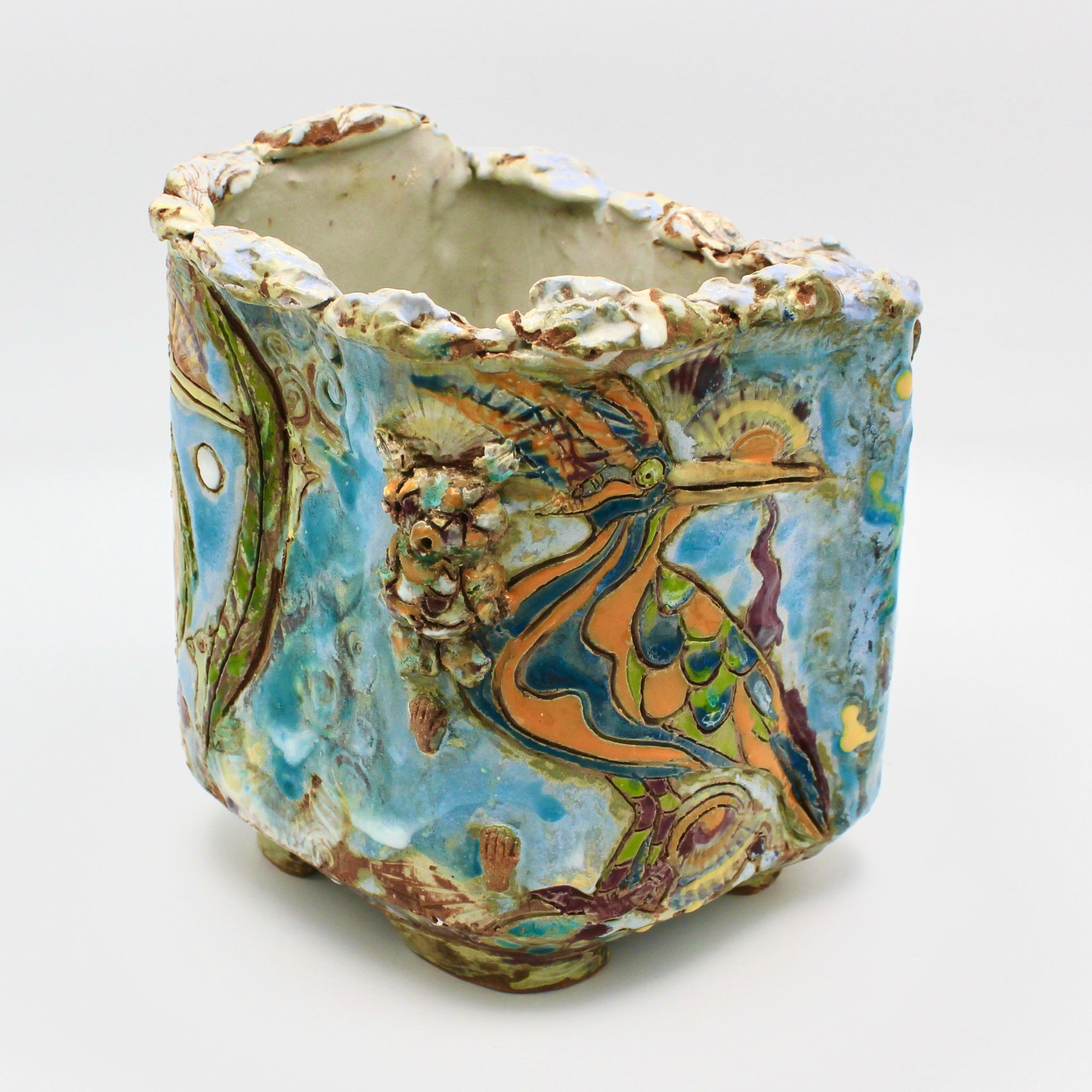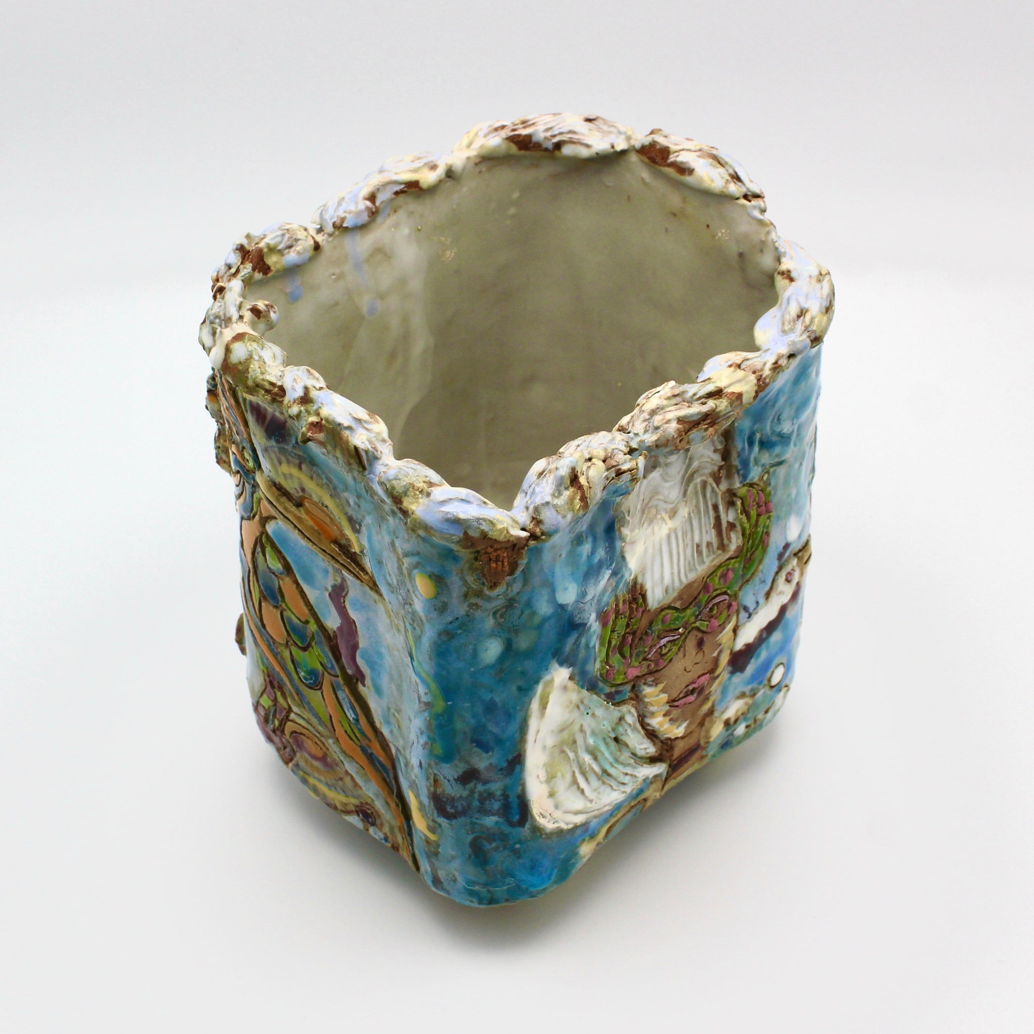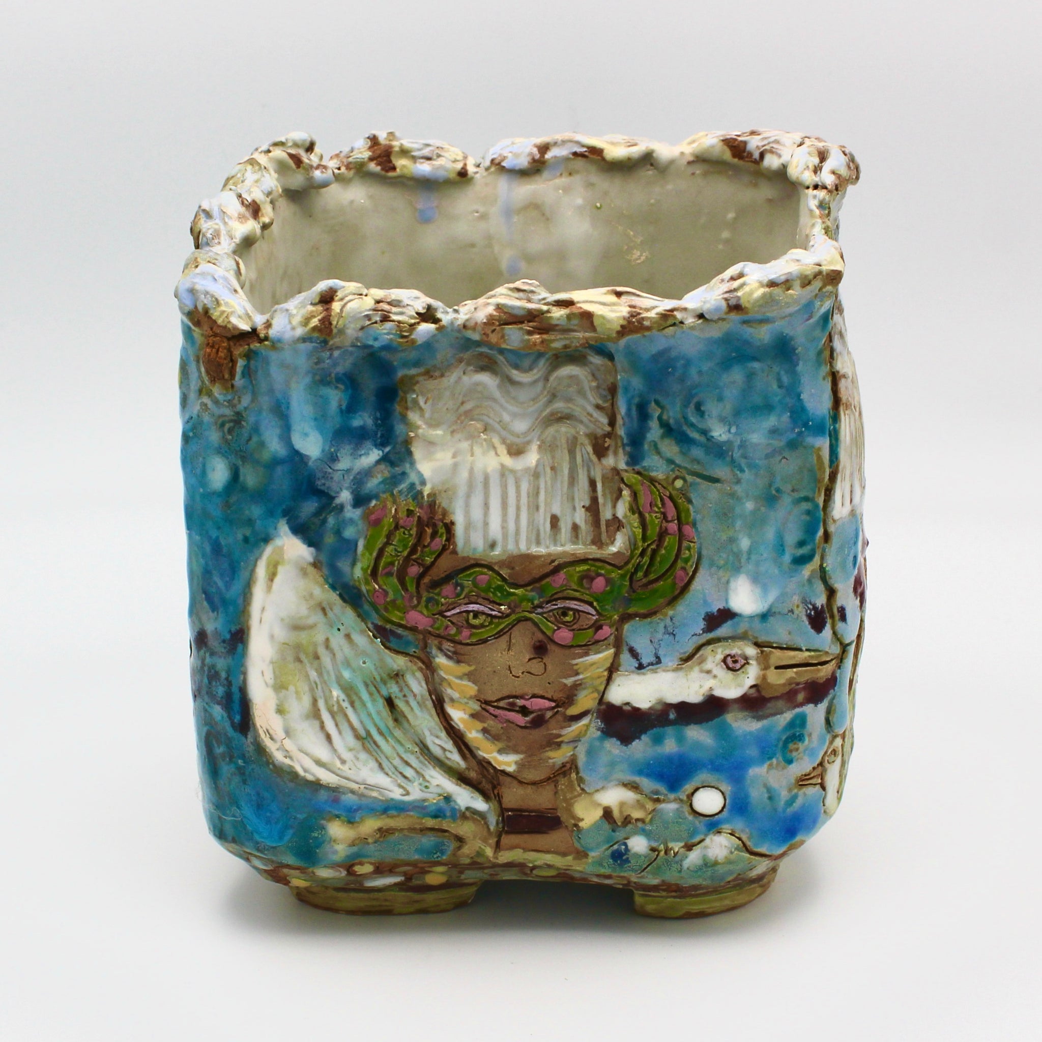 Nora Sarkissian's dreamlike imagery pushes the boundaries of functional ceramic. She infuses her studio pottery with mystical narratives of the subconscious. This one of a kind sculptural vessel features a number of whimsical vignettes of tropical birds and witchy people along its rectangular exterior. It measures about 6.5" tall, and 6" in diameter.