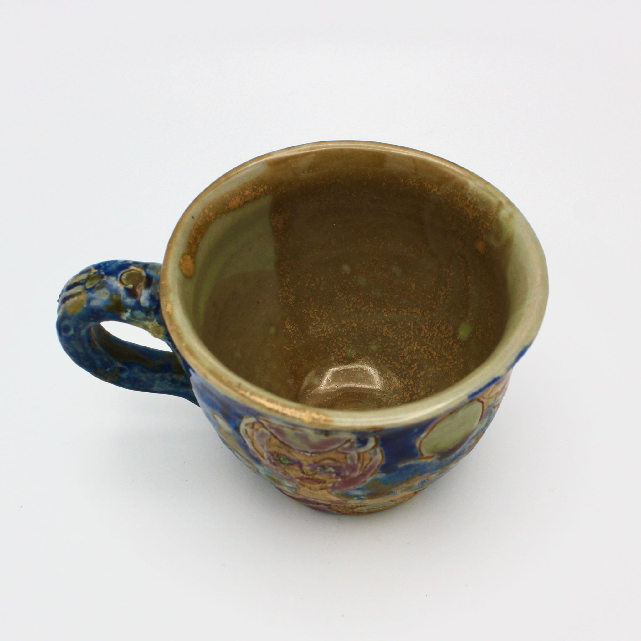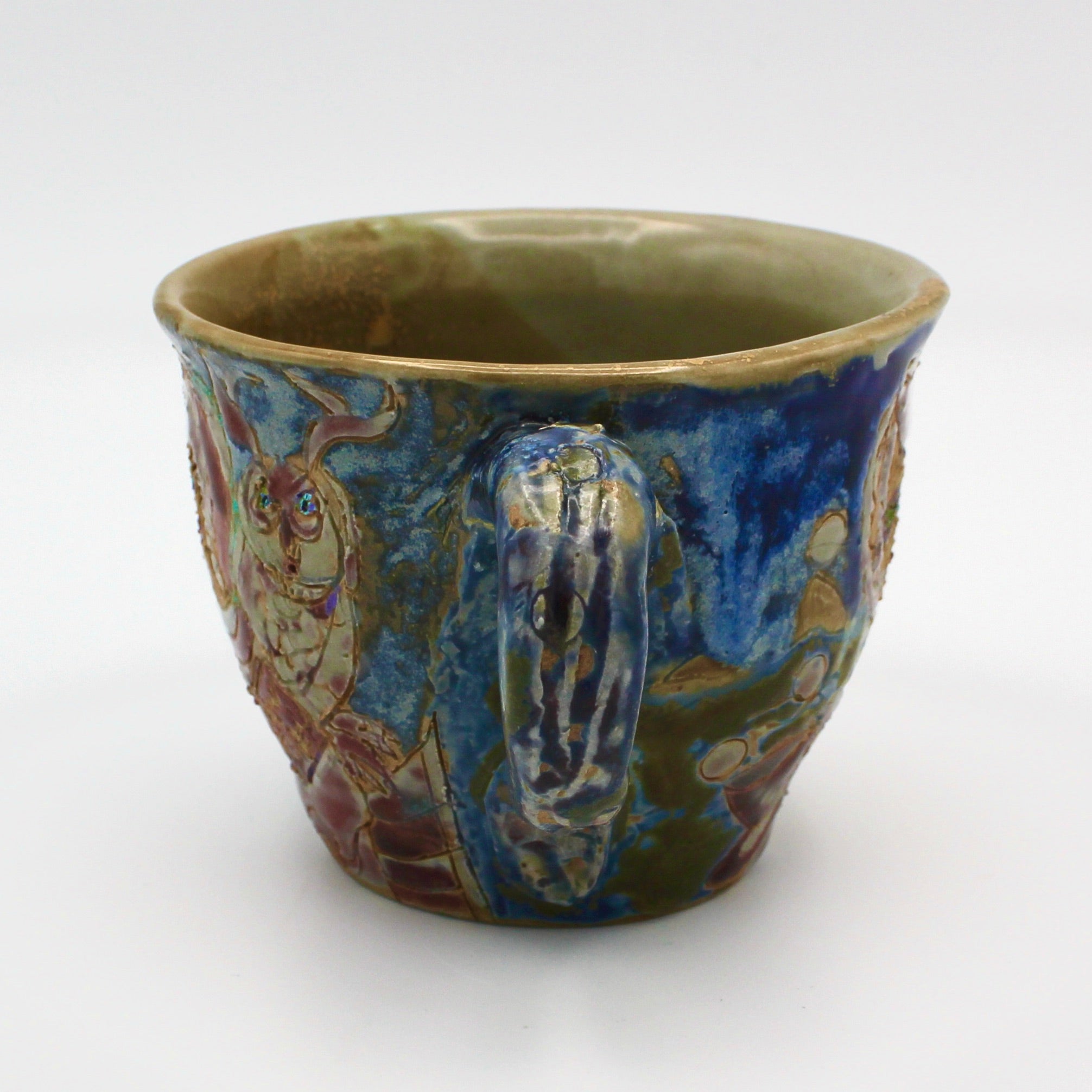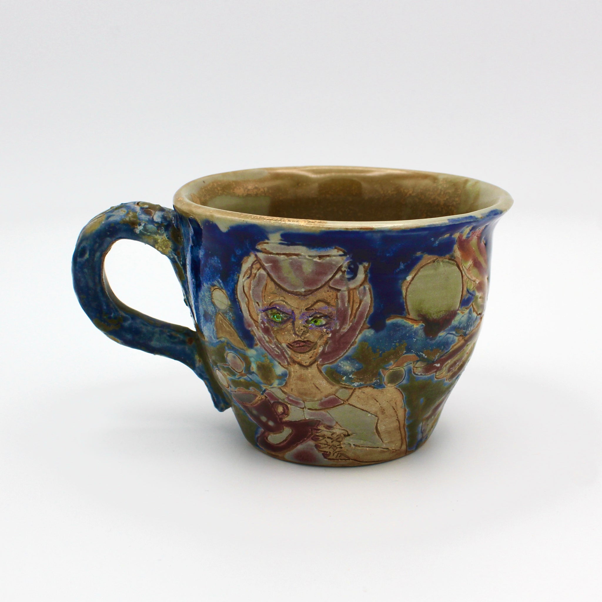 Nora Sarkissian's dreamlike imagery pushes the boundaries of functional ceramic. She infuses her studio pottery with mystical narratives of the subconscious. This one of a kind sculptural mug features a number of whimsical vignettes of birds, planets, and witchy people. It measures about 3" tall, and 4" in diameter.