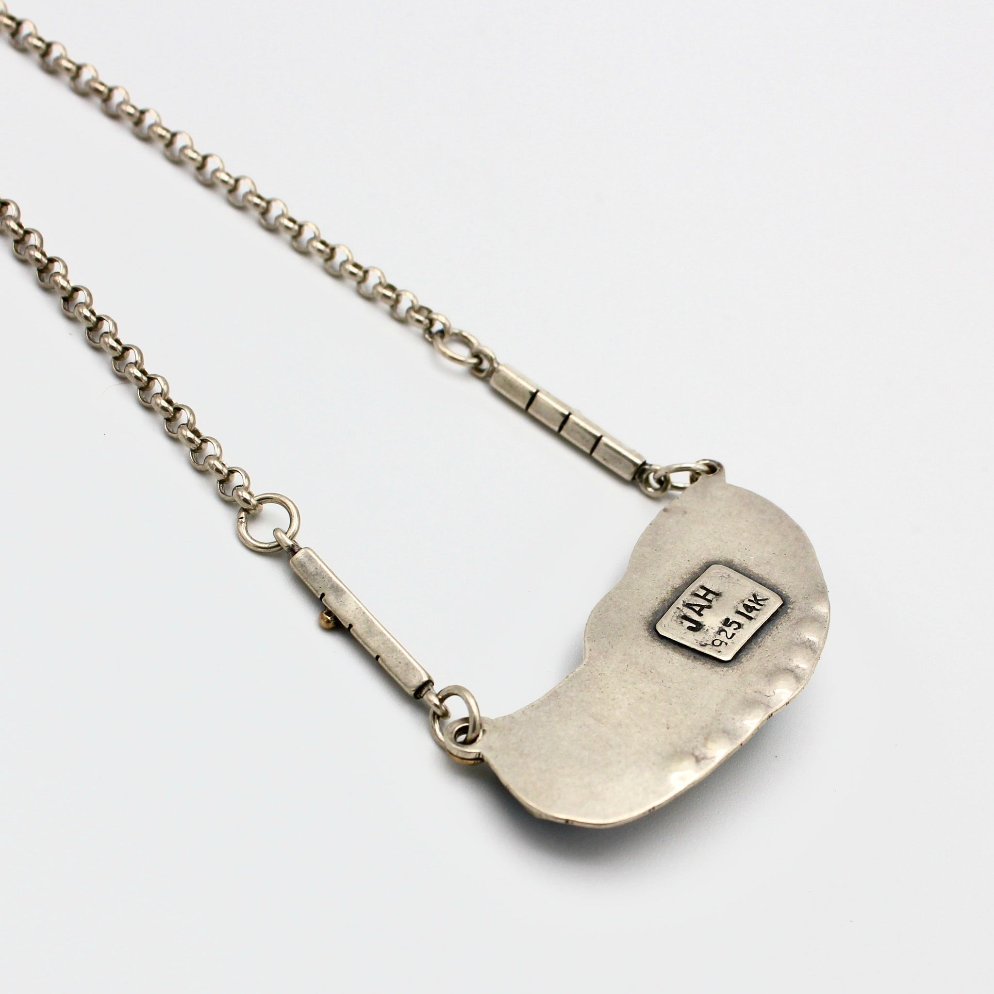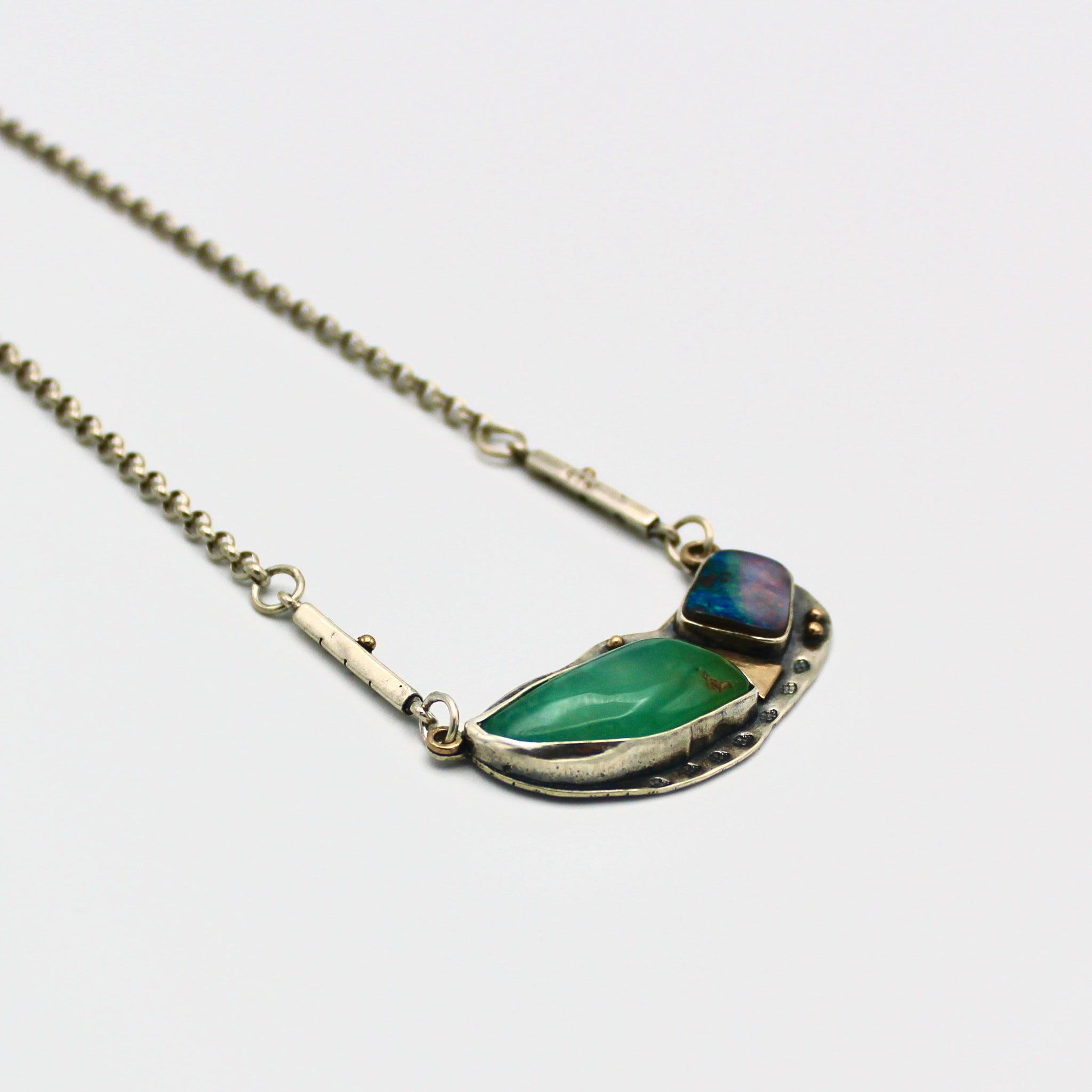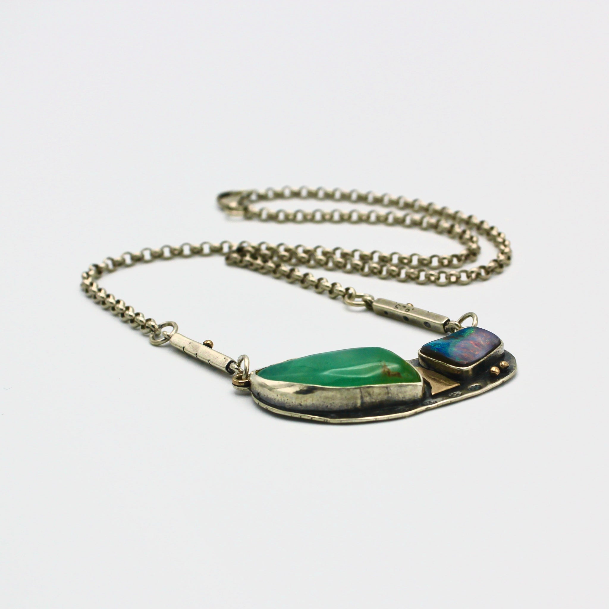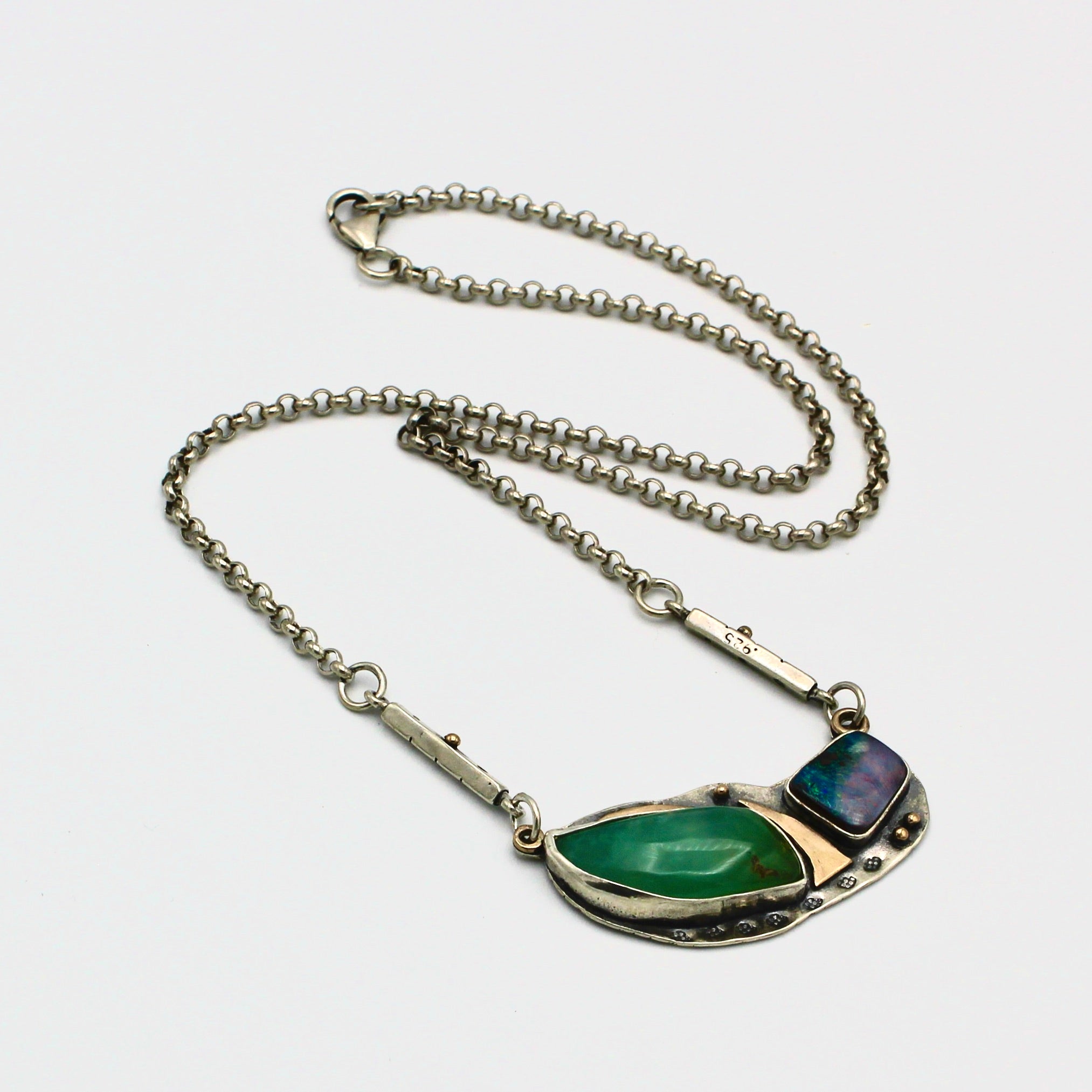 Jeannie Haydon's work is a playful mix of metals, textures, and patterns. This statement necklace blends the elegant and the industrial. It features chrysoprase and opal cabochons and are fabricated in sterling silver and 14k gold. The necklace measures about 17" long.