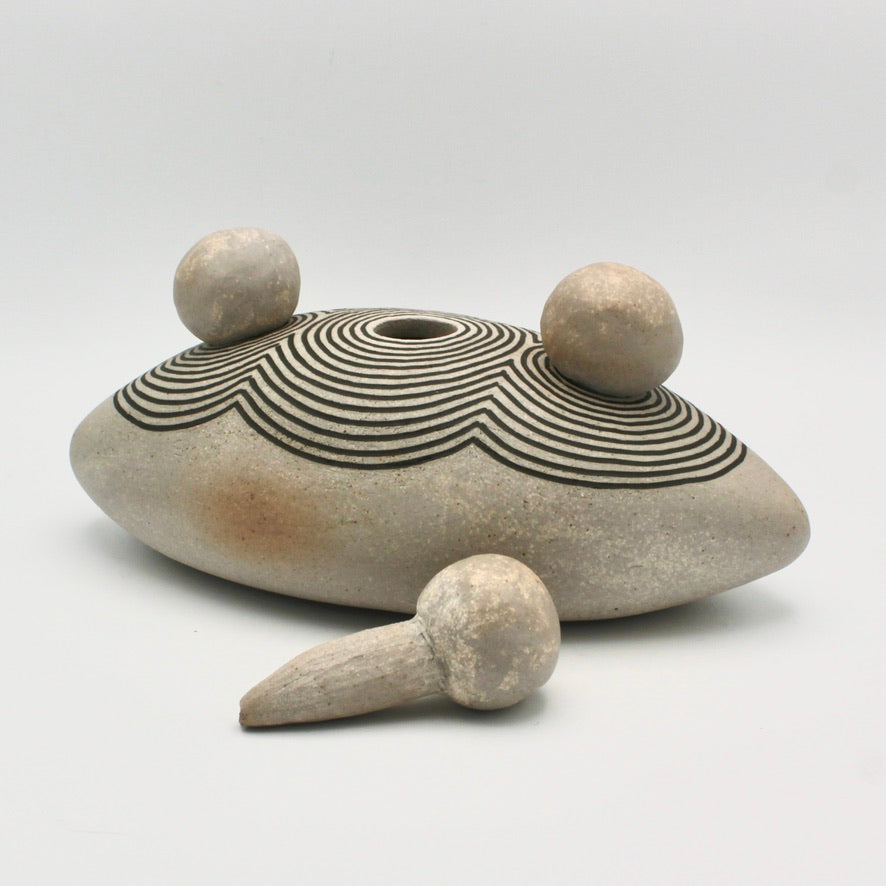Jennifer Joh's work is a fascinating combination of lines, shapes and textures in organic forms ranging from the botanical to the mineral. Cacti, rock formations and marks resembling ancient petroglyphs are her signature. This unique sculptural piece invites exploration through the three removable mushroom shapes. It measures 10" from point to point and about 5" high.
