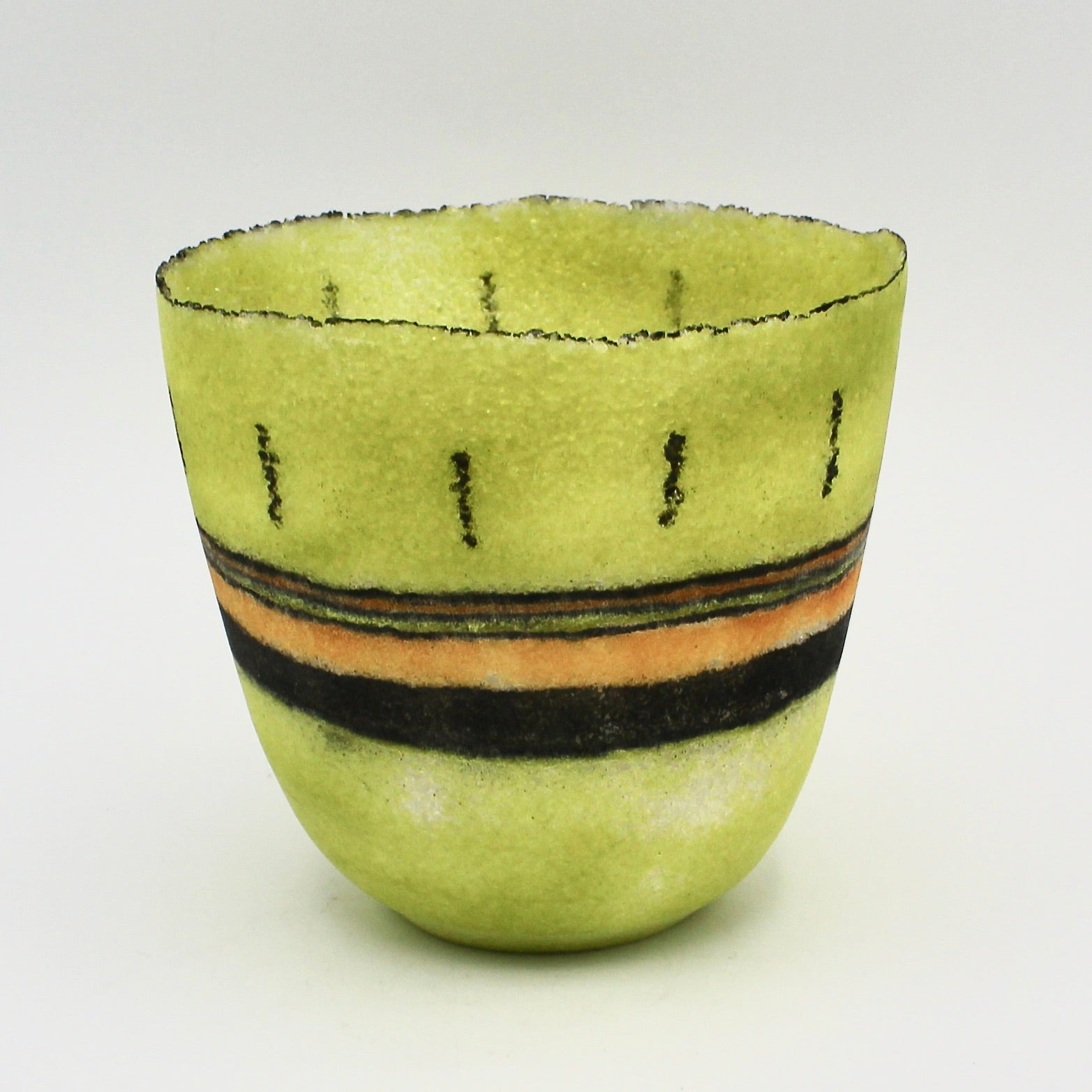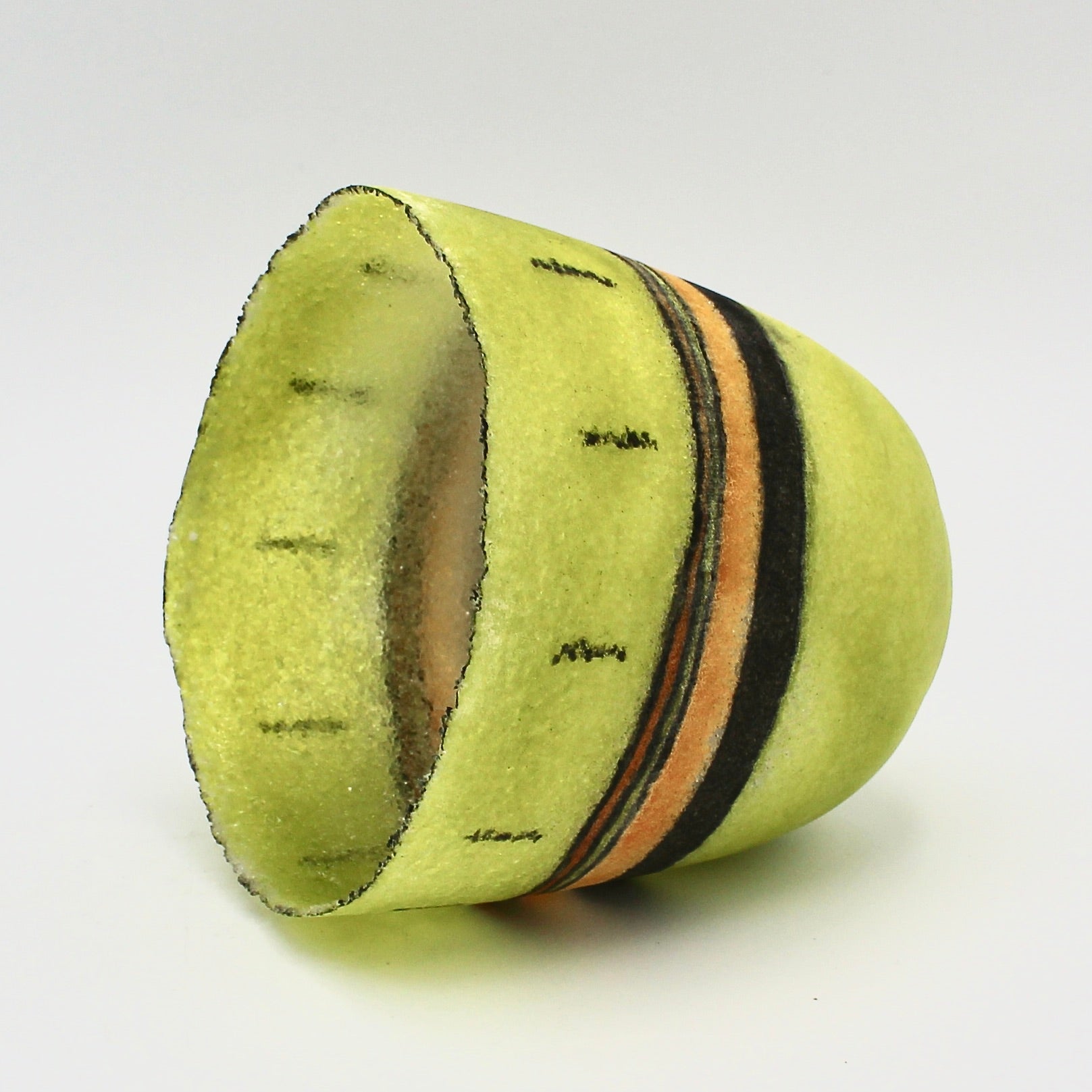 Margo Scarpulla make one-of-a-kind saggar, naked raku, horse hair and pit-fired pottery, as well as unique Pâte de verre glass vessels. Pâte de verre is a method of kiln casting glass using crushed or powdered glass with a binding agent over a plaster mold. After the firing and cooling, the mold is broken away and the fused glass piece is completed. This one of a kind vase features striking green, orange, and black stripes. The vase measures about 4.5" in diameter and 4" tall.