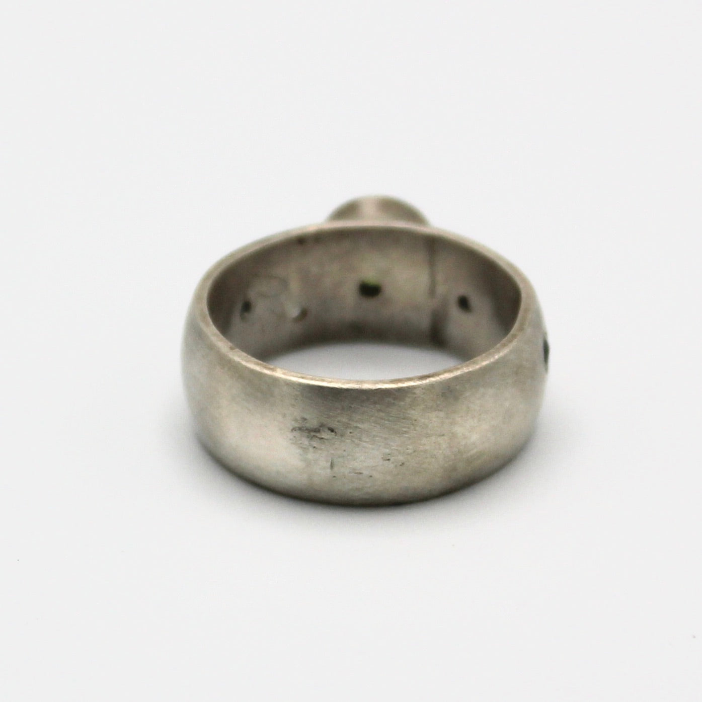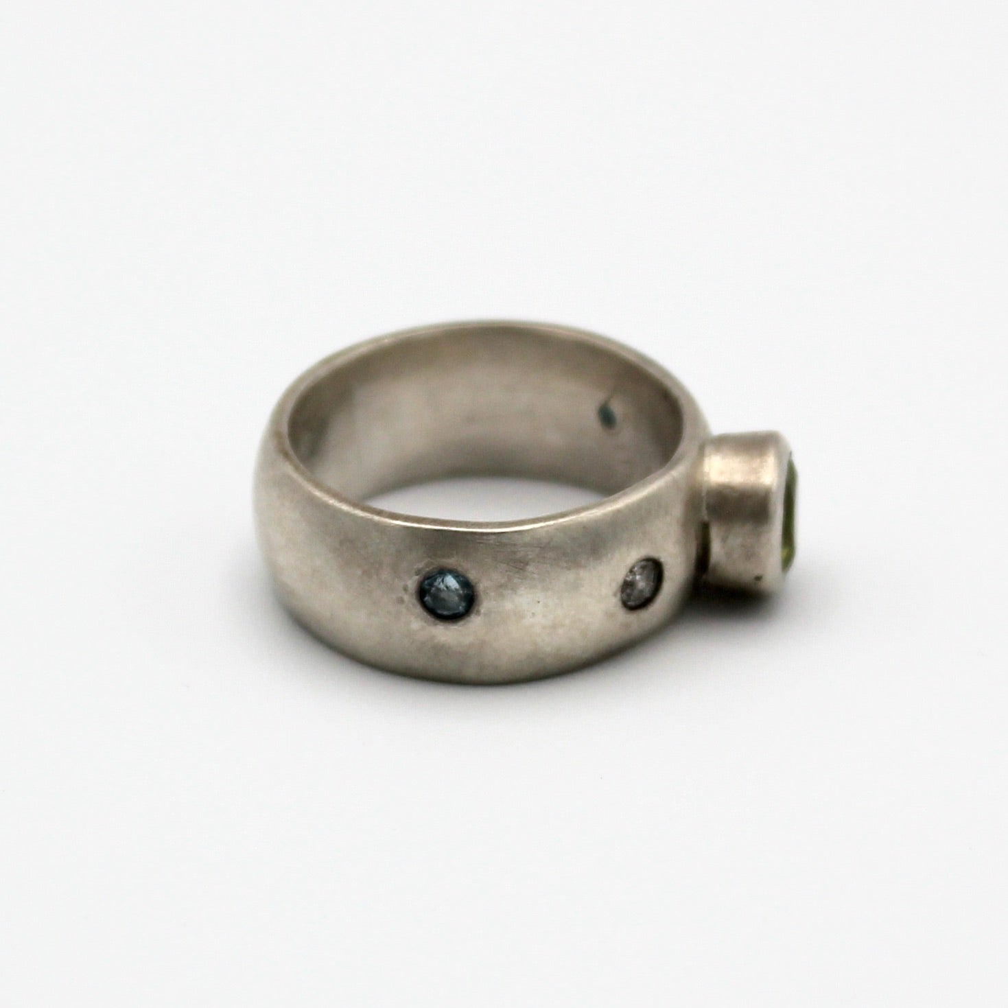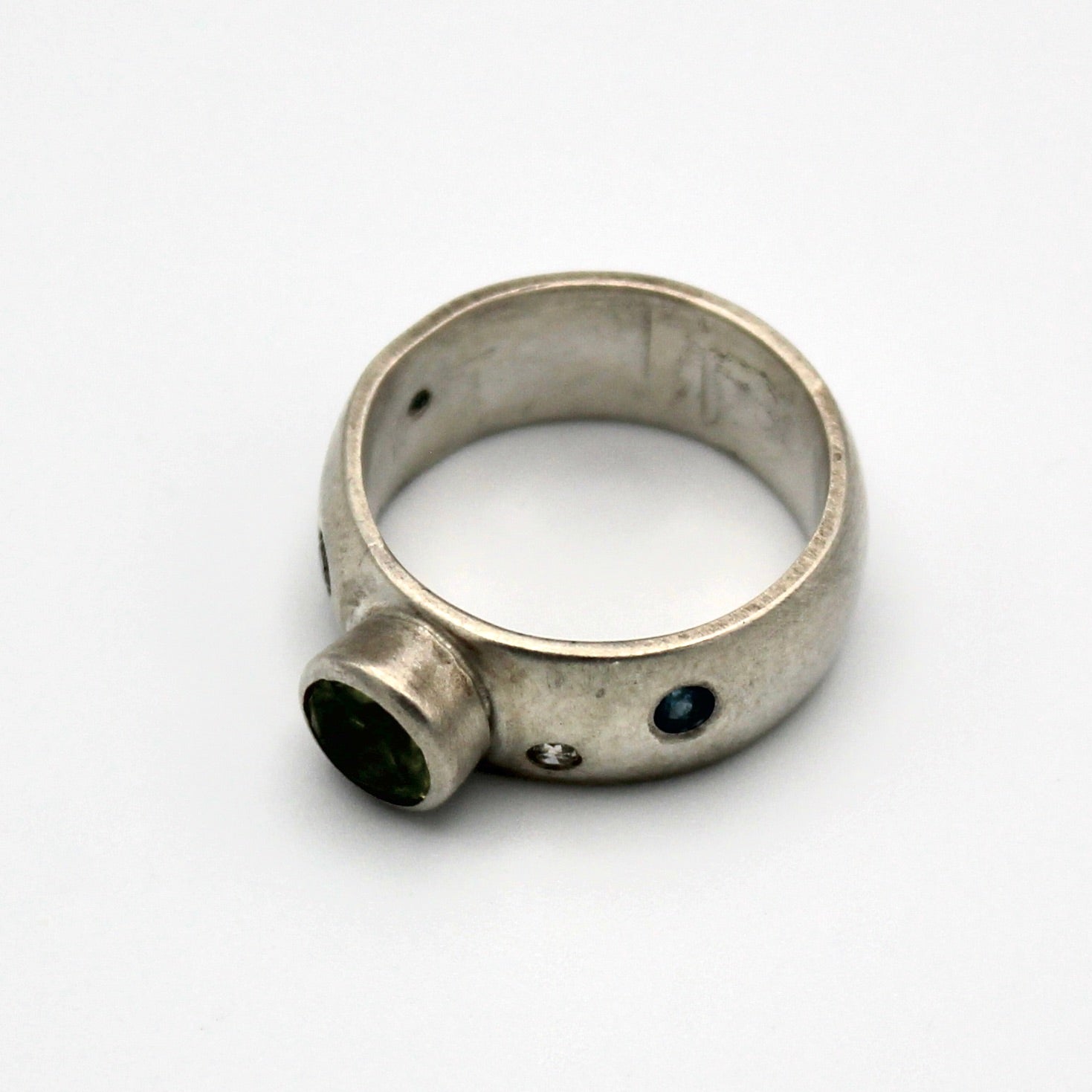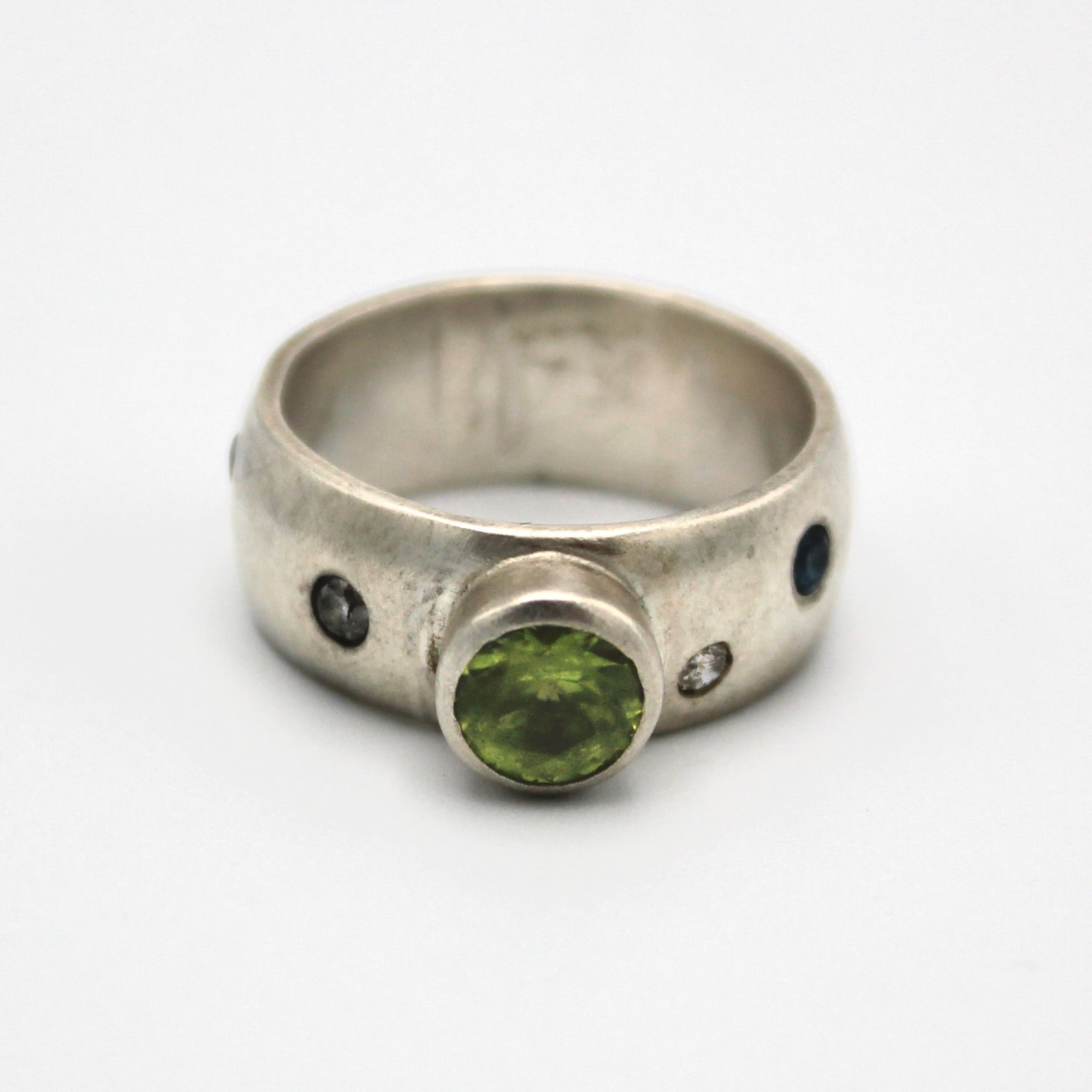 Karen Edgerly's jewelry embraces the fine artisan craft of silversmithing using various techniques and mixing silver with base metals or a touch of gold. This beautifully crafted sterling silver ring features a central, spring green peridot stone with four small inlaid topaz stones along the band. The ring is around a size 7-8.