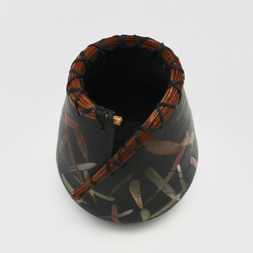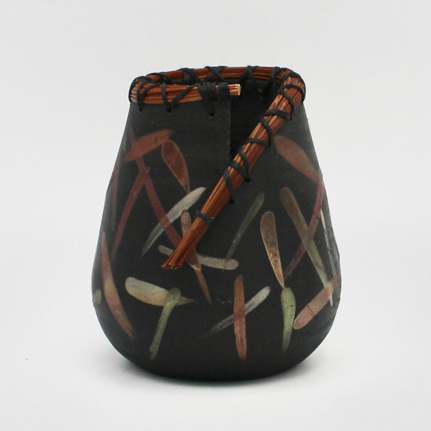 Margo Scarpulla makes one-of-a-kind saggar, naked raku, horse hair and pit-fired pottery, as well as unique Pâte de verre glass vessels. This one-of-a-kind Raku piece features woven pine needles and a unique pattern. It measures about 5" tall and 4" wide.