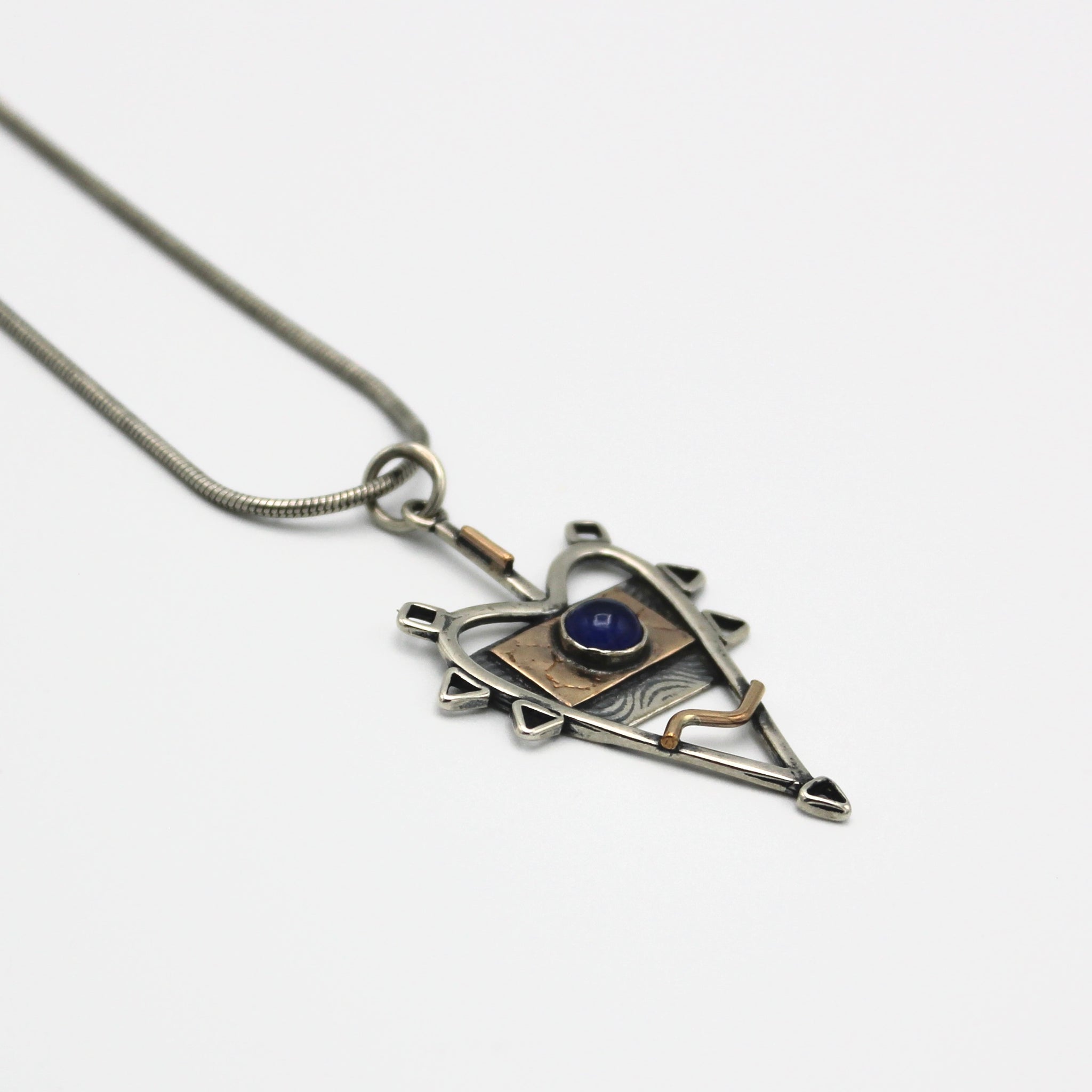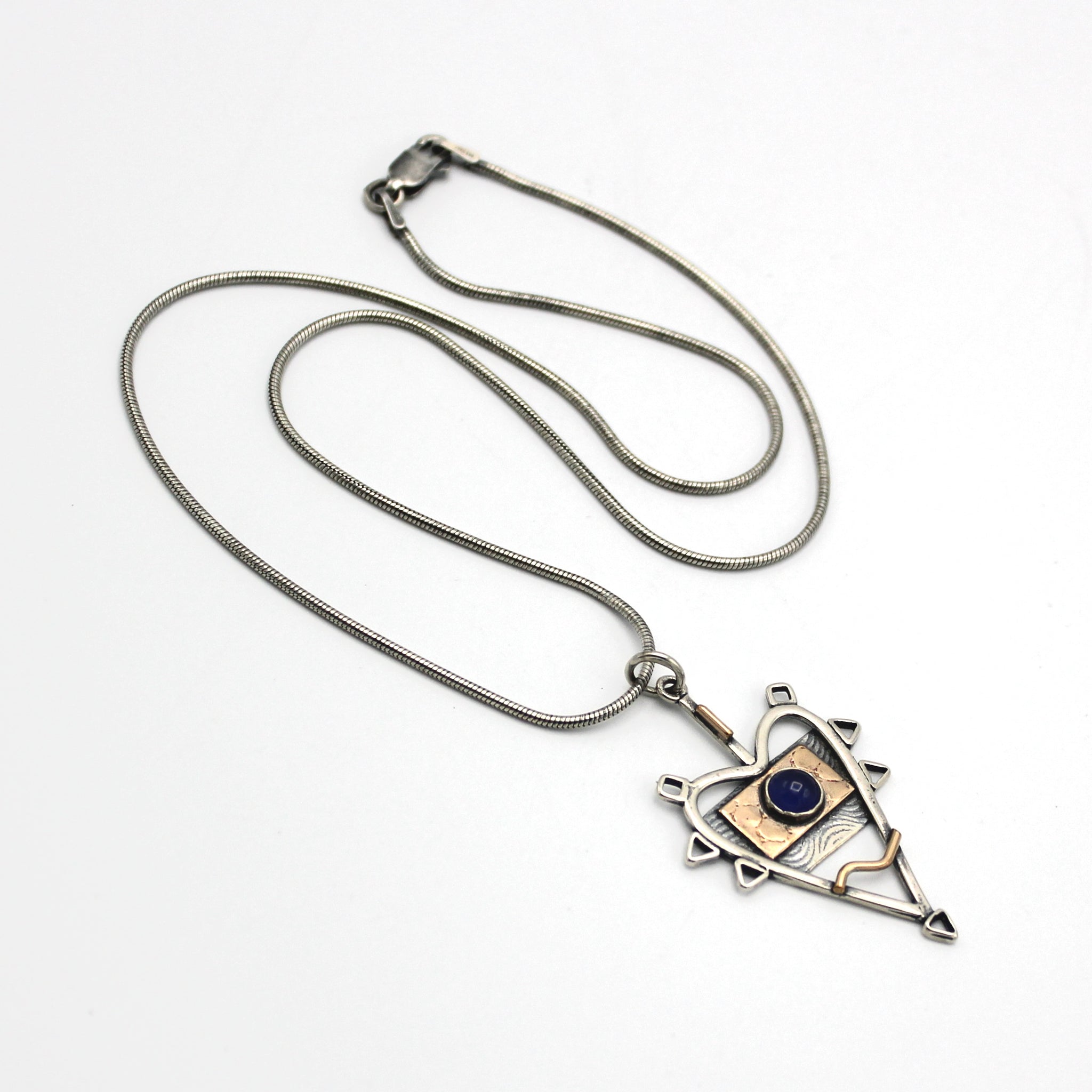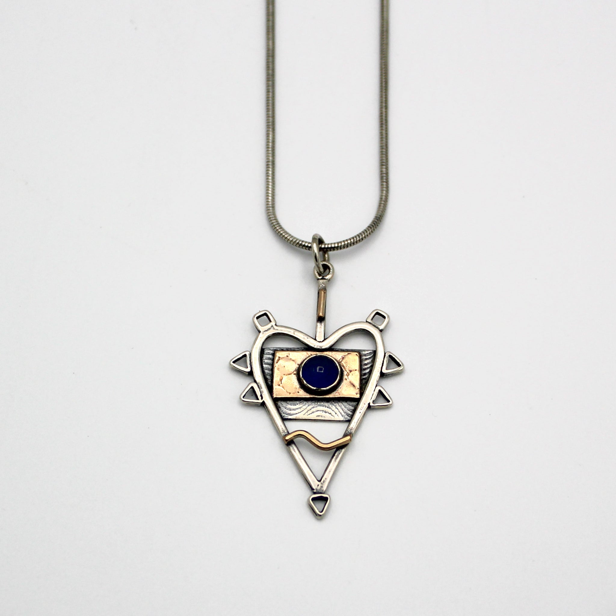 Jeannie Haydon's work is a playful mix of metals, textures, and patterns. This subtle yet eye-catching piece is fabricated in sterling silver, gold fill and set with a sapphire stone. The pendant measures about 1.5" in length and the chain is 17'.