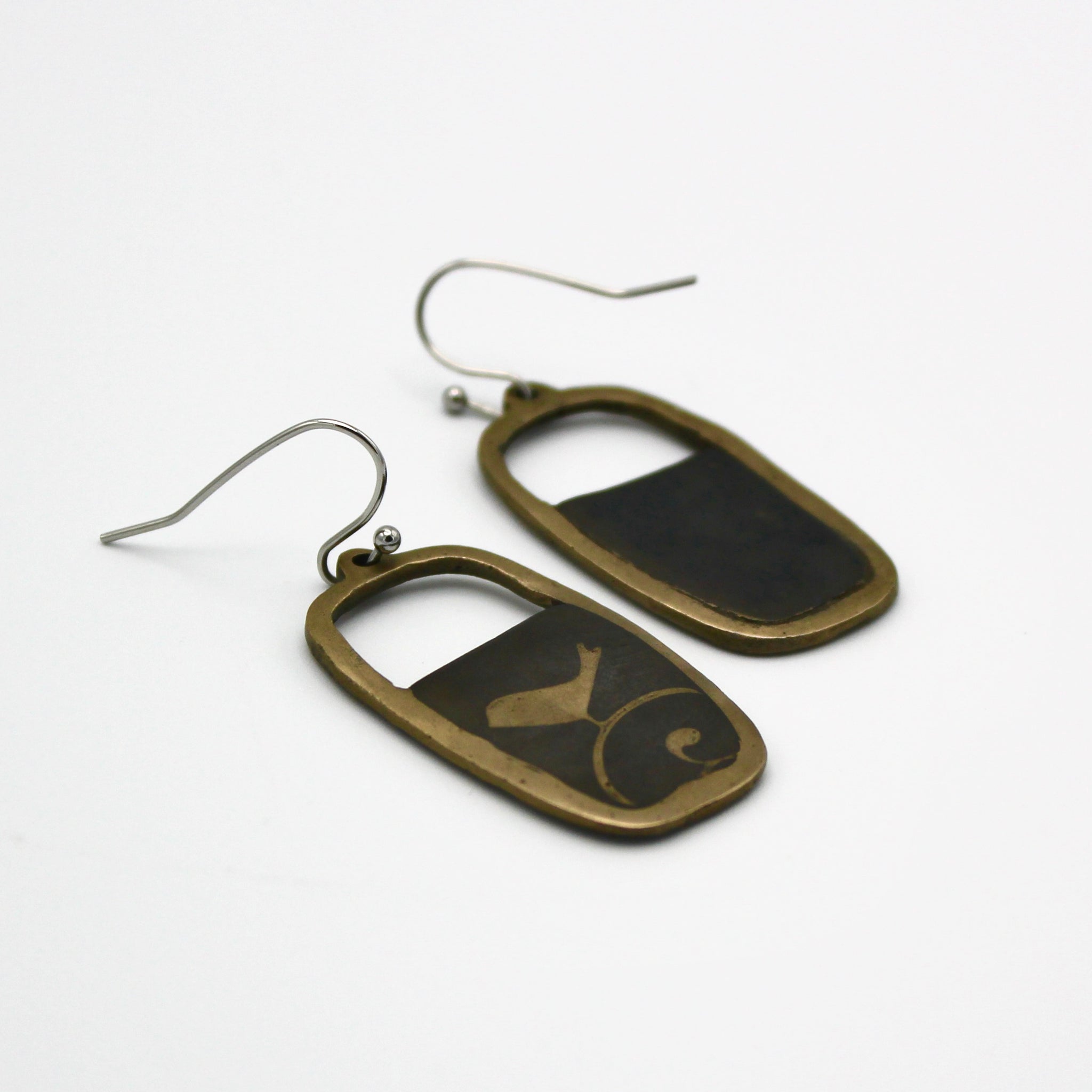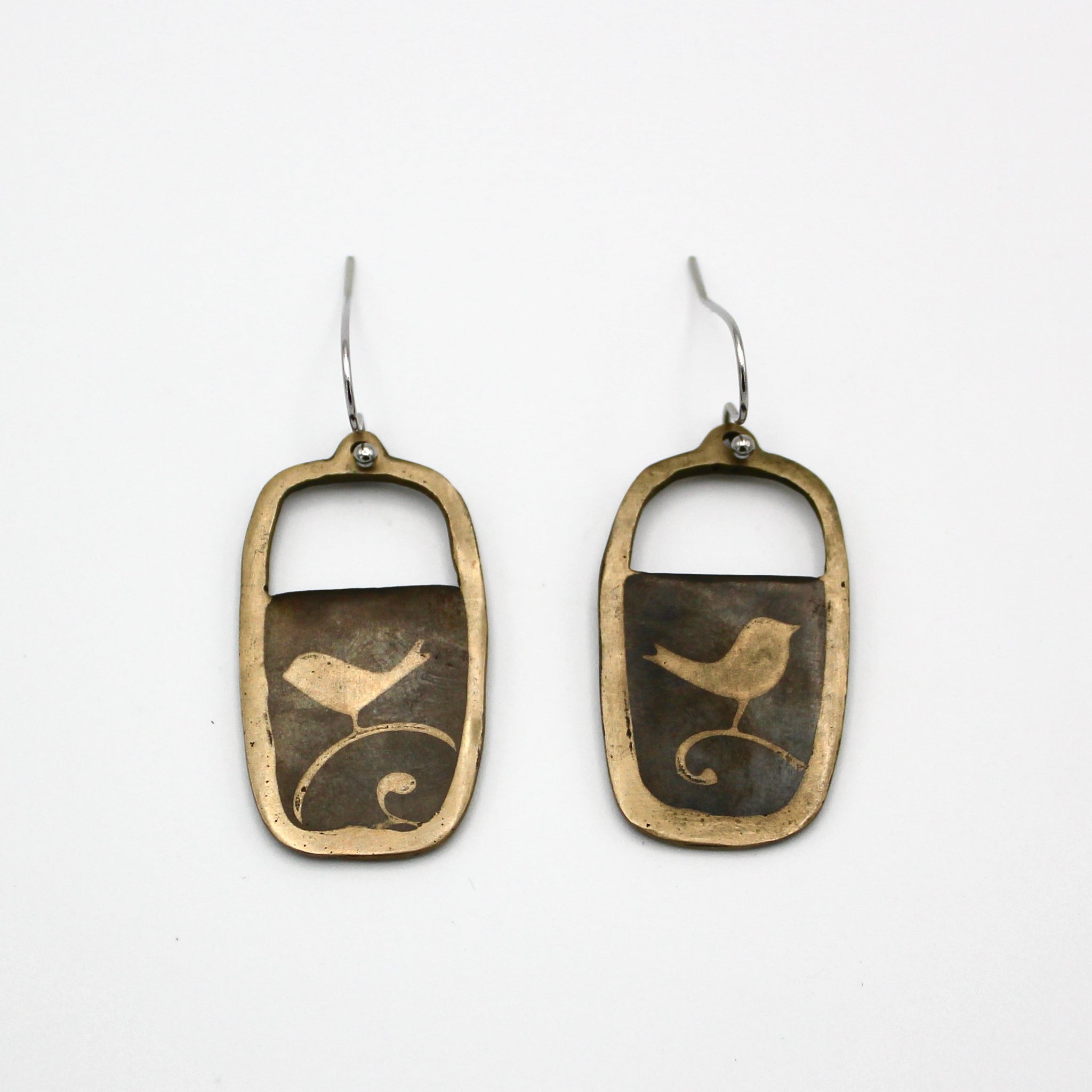 Hadar's Jewelry showcases intricate designs crafted from her unique handcrafted metal clay, transformed into pure metal through innovative techniques. Her creations feature mixed metals, textures, and architectural forms, reflecting over two decades of expertise and artistry. These earrings use the contrast between bronze and steel to depict the silhouette of a bird on a gently curling branch. They measure about 1.75" long on stainless steel ear wires.