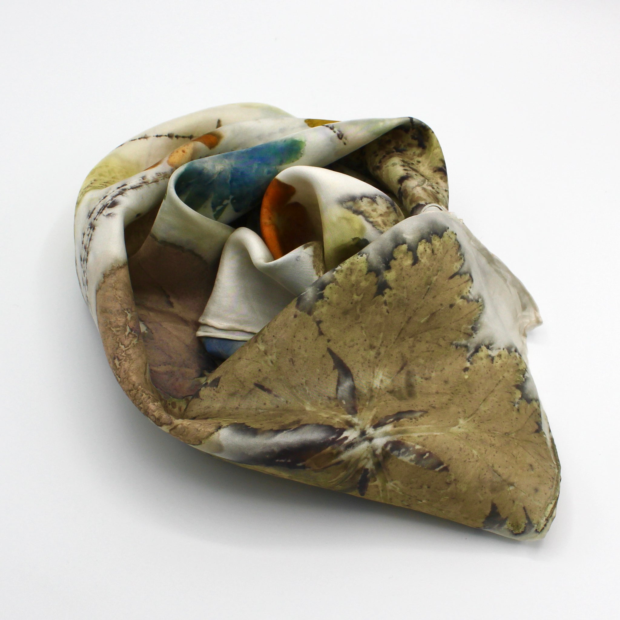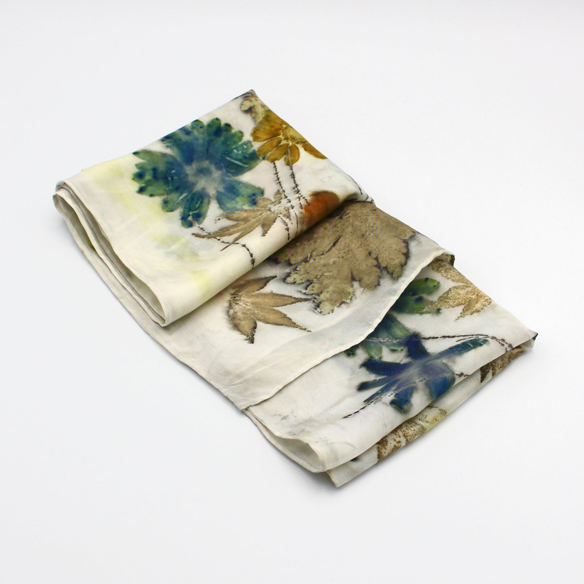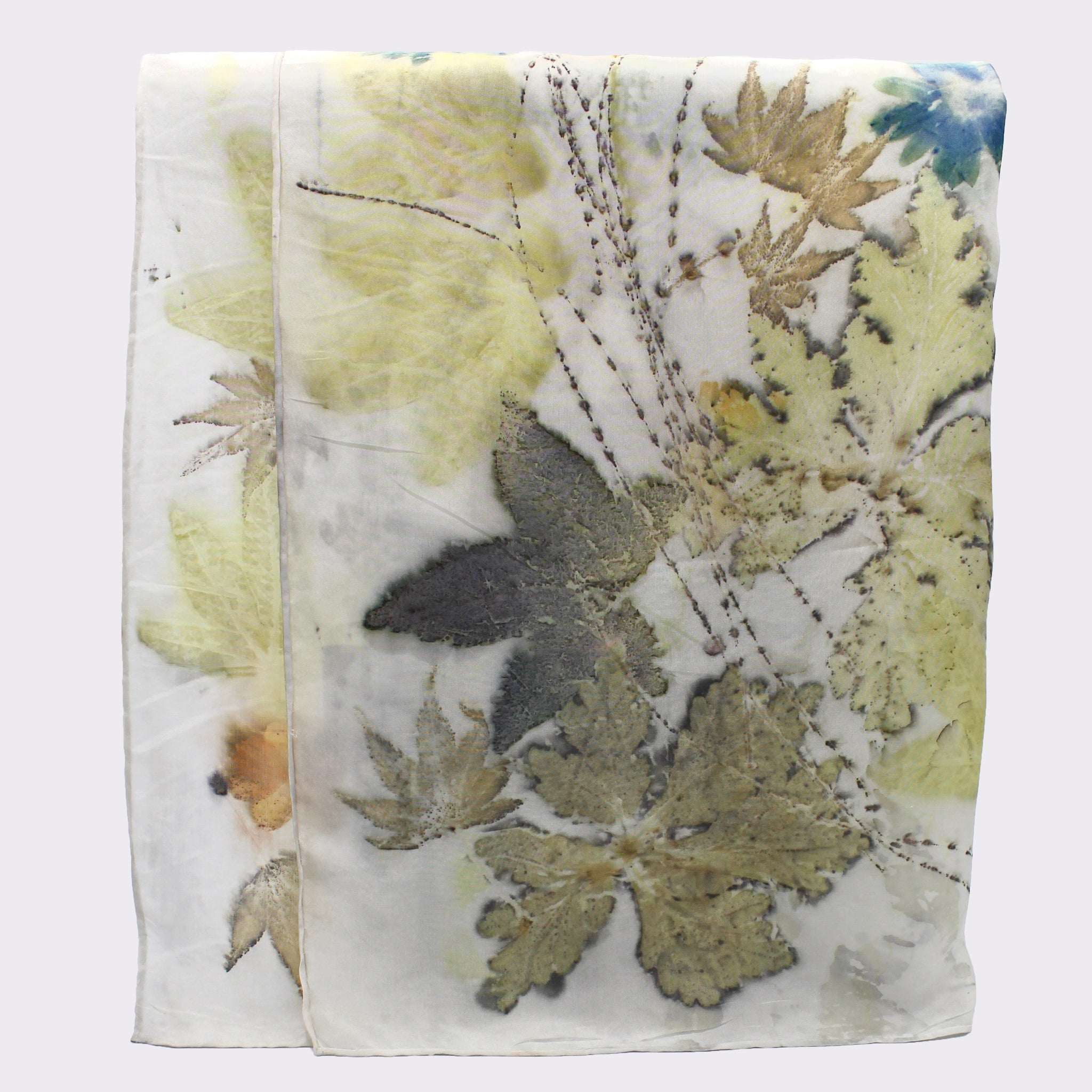 Mayumi Fujio's hand printed textiles are made with botanicals ethically harvested from the SF Bay Area, along with mineral and tannin to transfer natural color and shape from plants onto natural fiber. This beautiful 100% silk scarf features plants: cavarina, geranium, liquid amber, passionflower, Japanese maple, African daisy, crown daisy, cosmos, and African sumac. This stunning piece measures about 58" long by 11" wide.