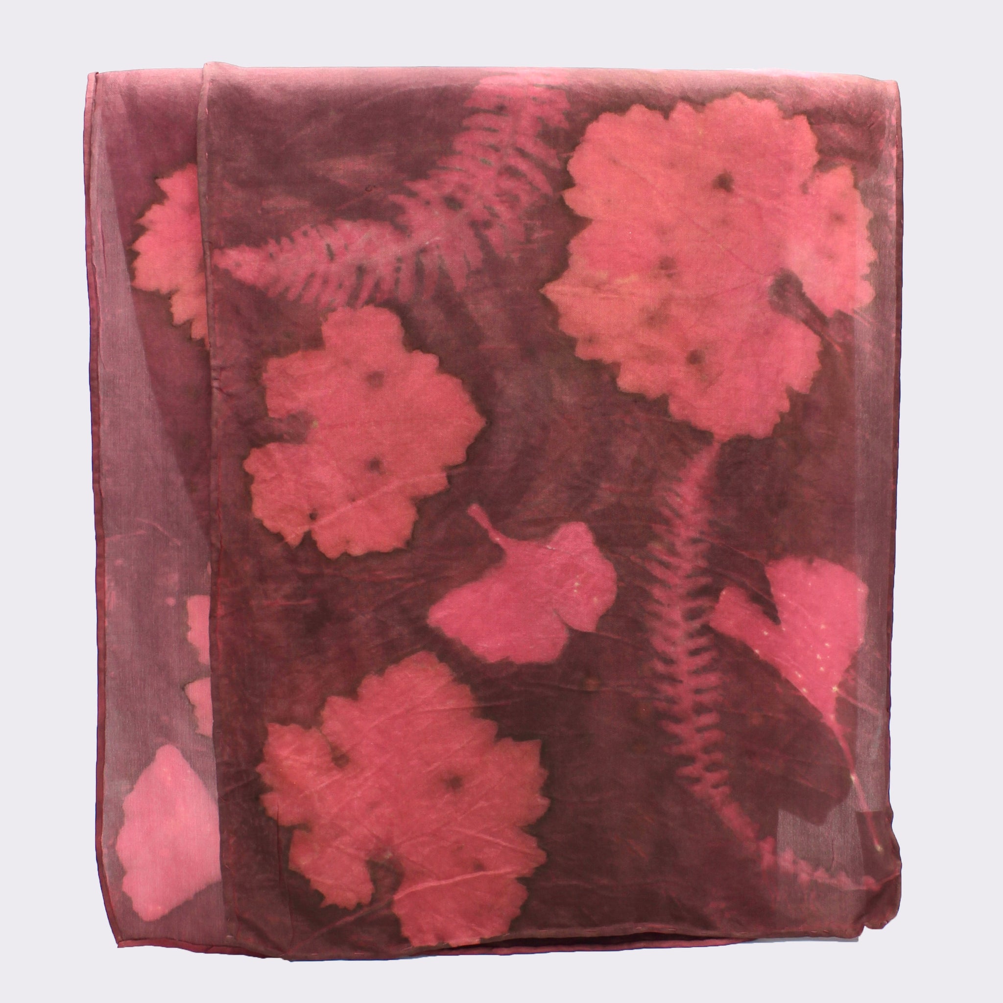 Mayumi Fujio's hand printed textiles are made with botanicals ethically harvested from the SF Bay Area, along with mineral and tannin to transfer natural color and shape from plants onto natural fiber. This beautiful 100% silk scarf features Mayumi's "madder" dye, and uses plants: fern, ginko, grape. This stunning piece measures about 58" long by 11" wide.