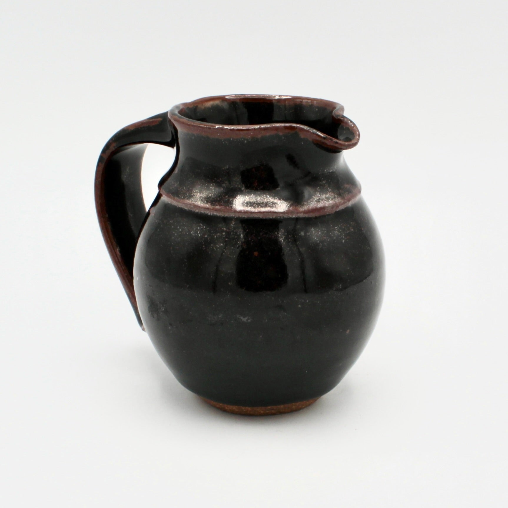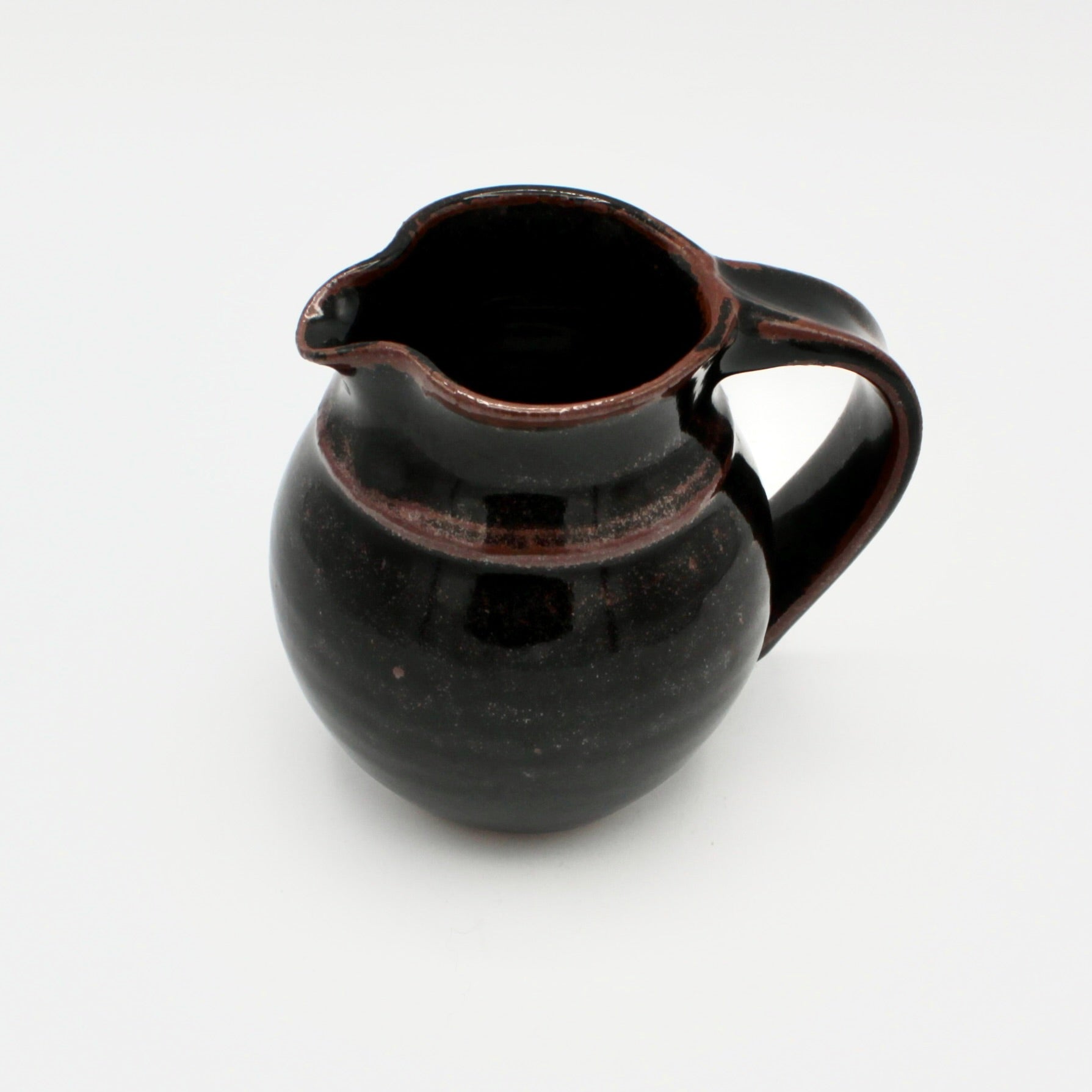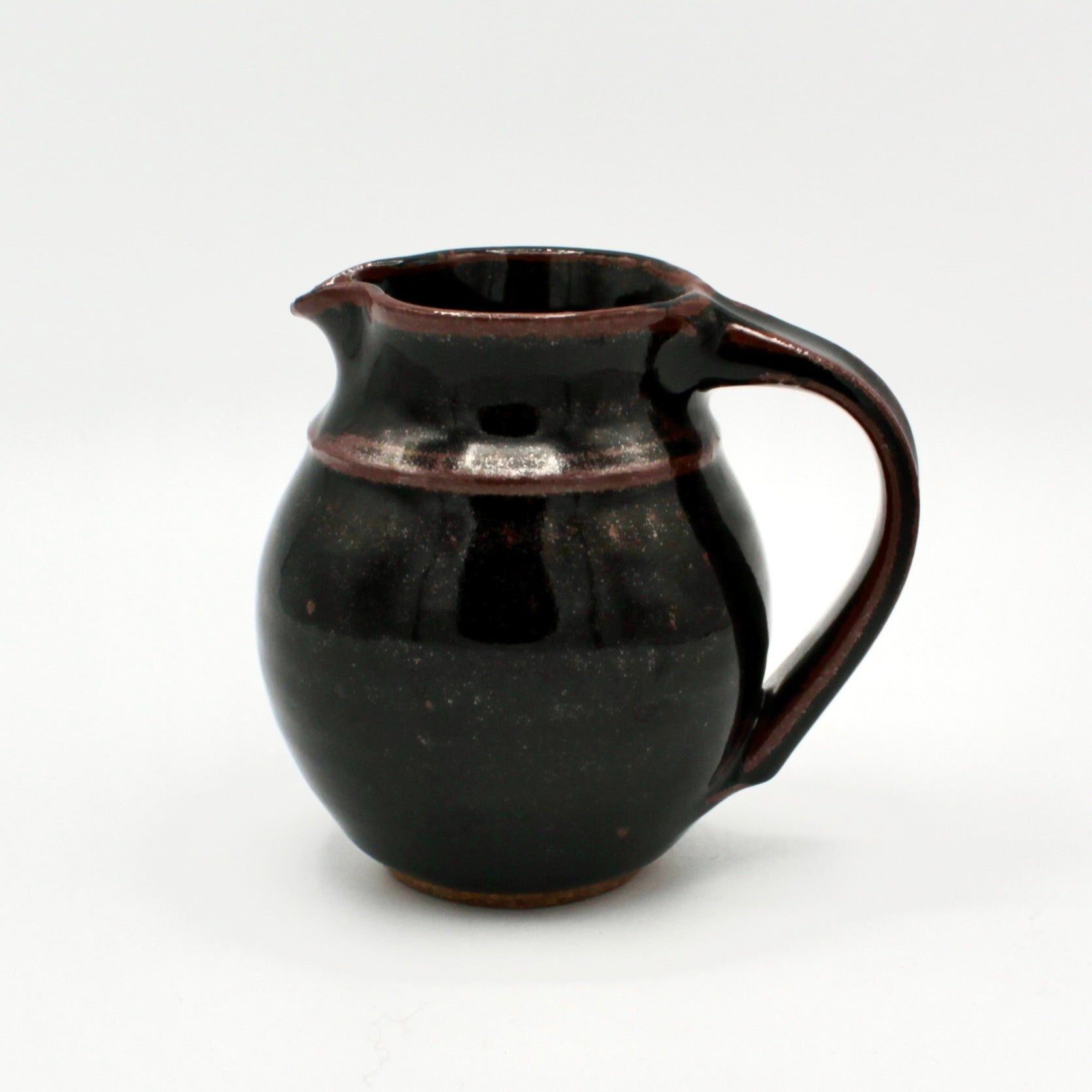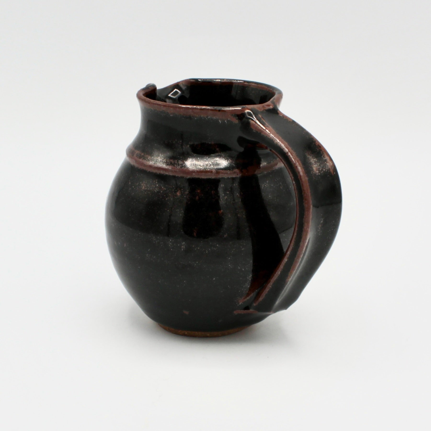 Longtime ACCI artist Susan Brody is back as a Holiday Guest Artist for the end of 2025! As ever, Brody's work is elegant, solid, and functional. This pitcher features a classic brown and black glossy glaze, and is perfect for milk, cream, or as a dainty bud vase. It measures approximately 4" in height and 2.25" in diameter at its opening.