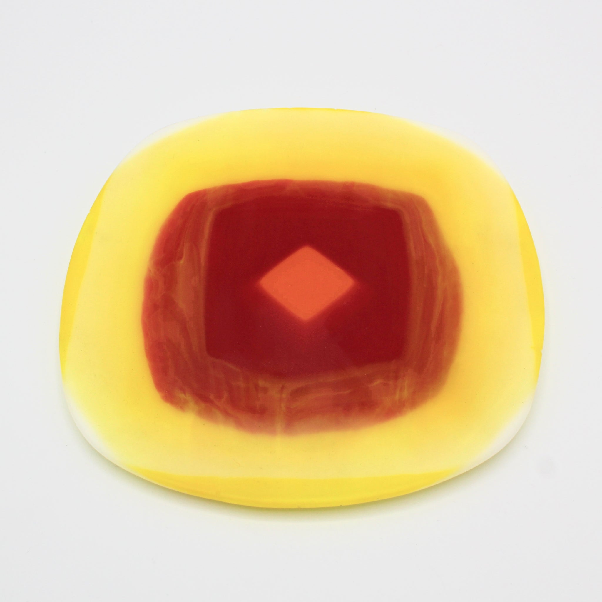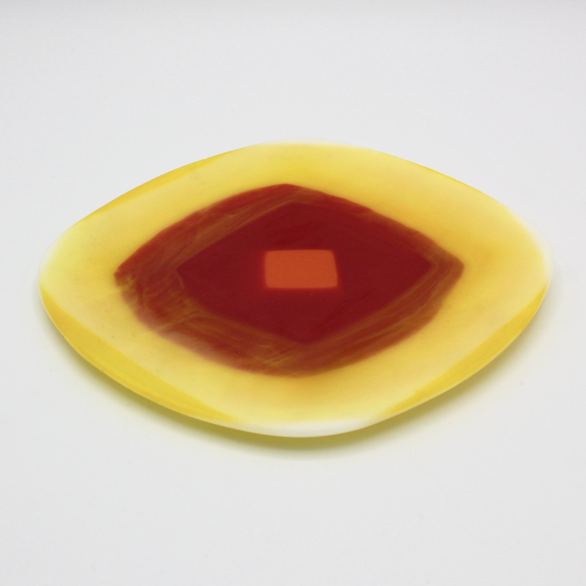 Mark Schatz's career in architecture really shines through his elegant and intricately assembled fused glass creations. This beautiful fused glass accent plate measures 7" square. This dish, along with many of Mark's beautiful pieces, can serve equally well as a tapas or hors d'oeuvres plate, nut/olive dish, or trinket holder for keys and rings.