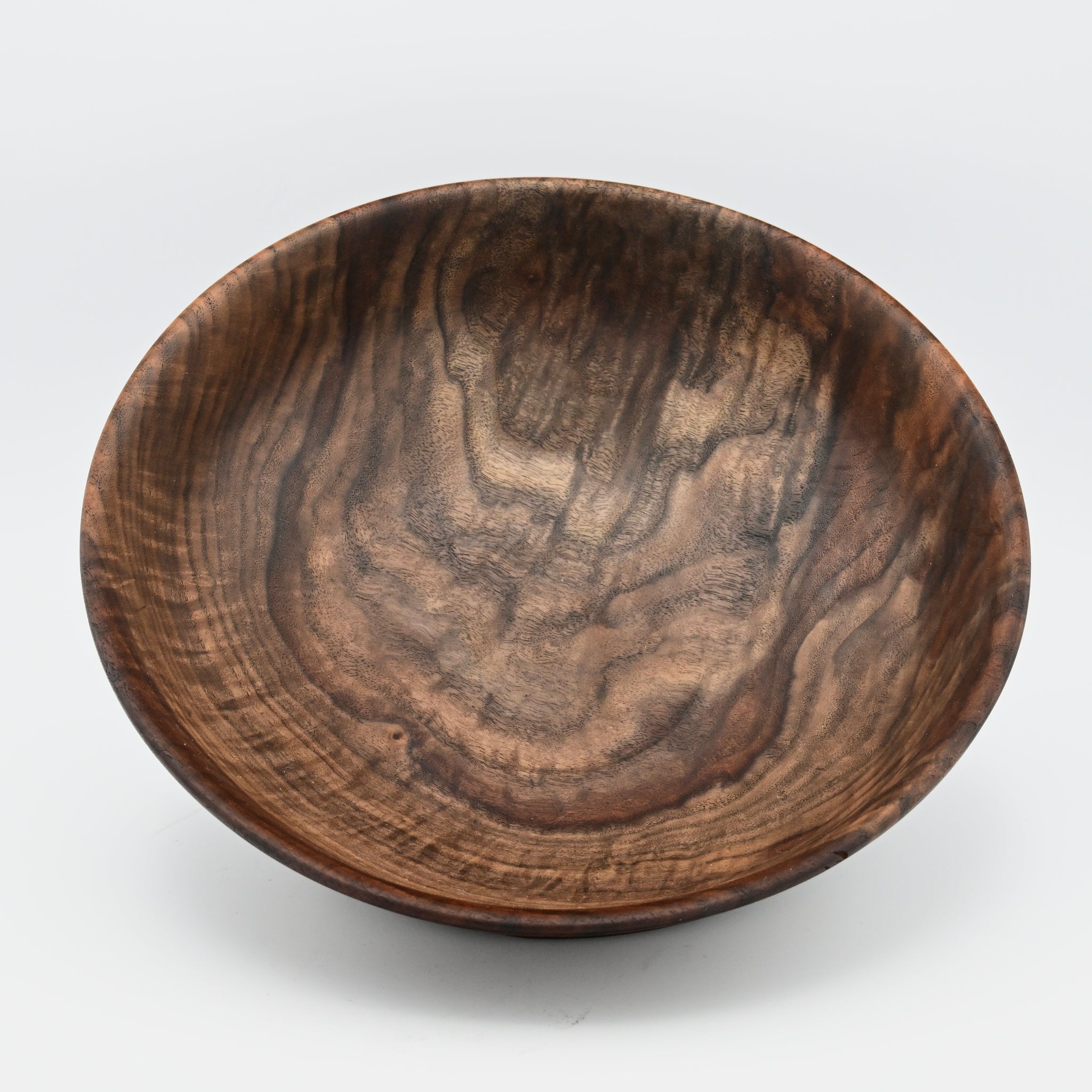 Bill Walzer's gorgeous one of a kind woodworks are proudly sourced from salvaged or discarded wood. Each piece reflects the beauty and form of the wood grain, paired with Bill's artistic vision. This elegant turned bowl highlights the grain of salvaged walnut, and measures about 3.5" tall and 10.5" in diameter at the top. Food safe; please hand wash or wipe clean with a damp cloth.