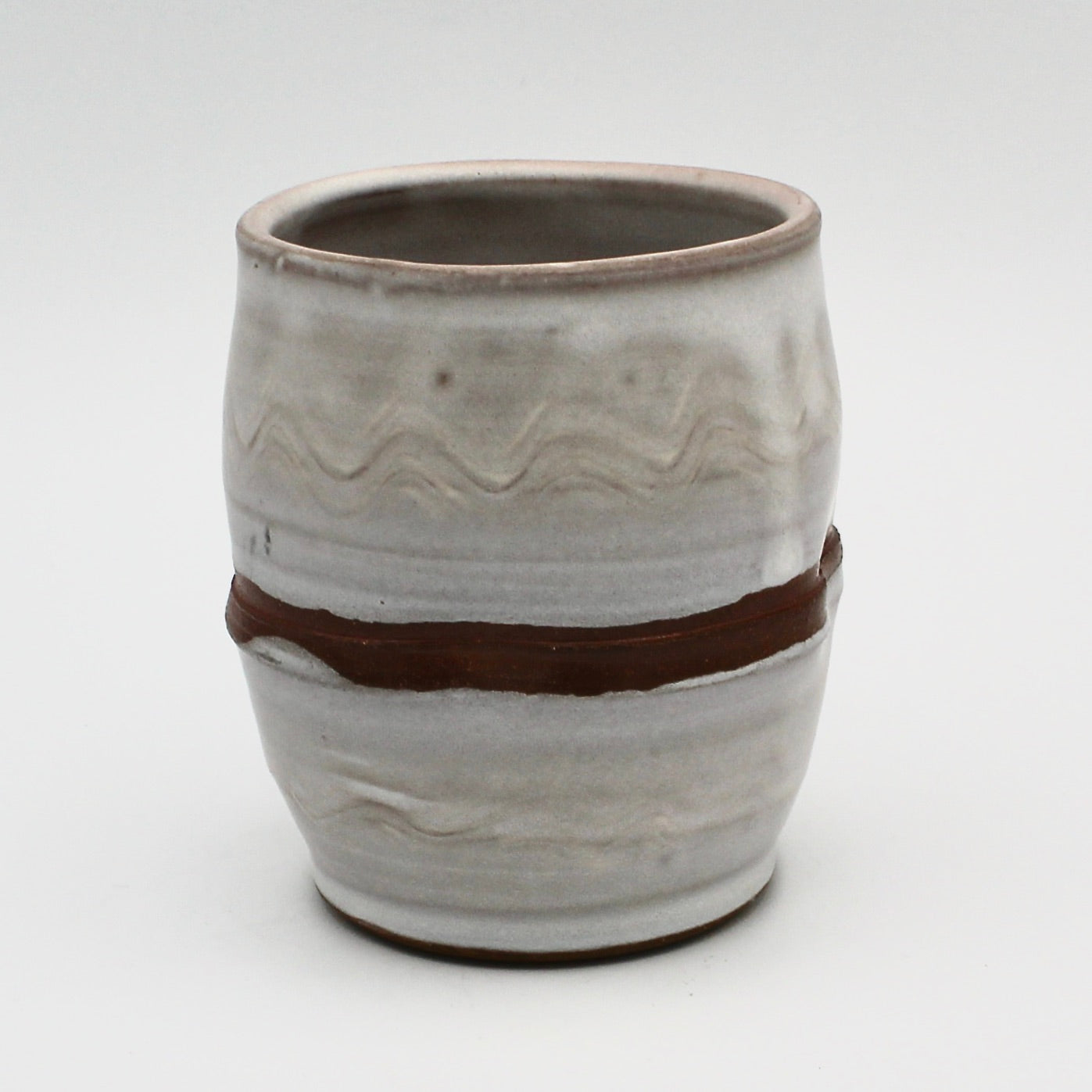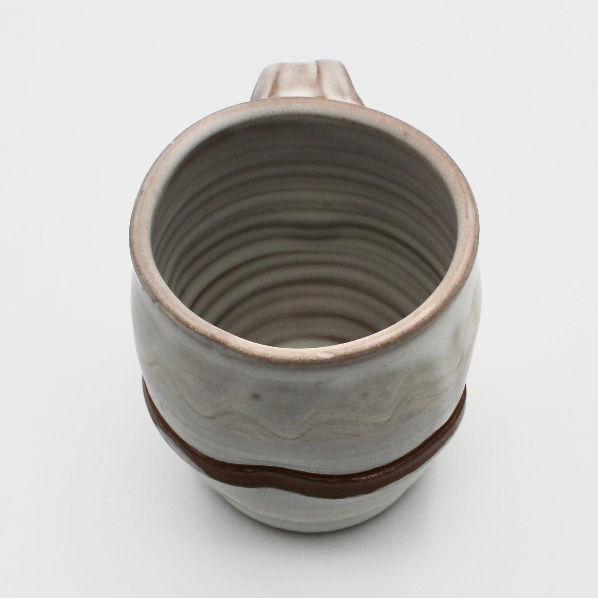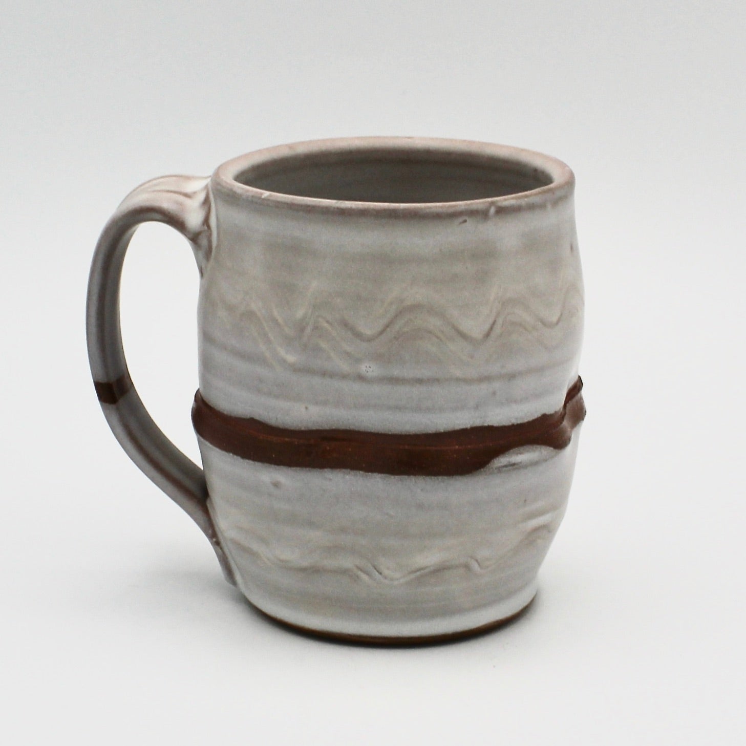 Kathy Kearns uses traditional glaze colors on her stoneware that bring to mind sand and sea for her Greek inspired pottery designs and bold colors for her California ringware inspired designs. This beautifully thrown mug measures a little under 4.5" tall and around 3" in diameter.