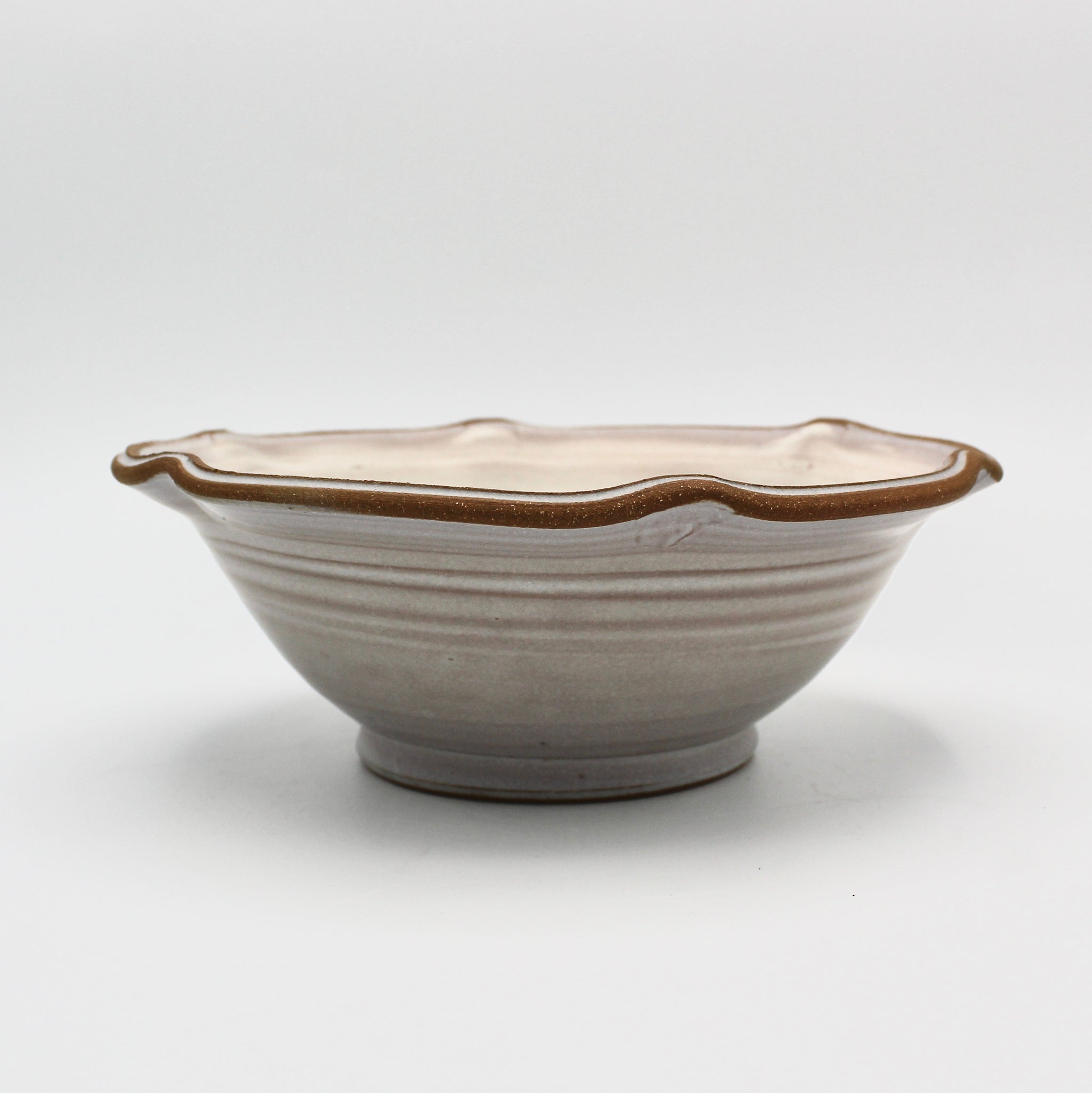 Kathy Kearns uses traditional glaze colors on her stoneware that bring to mind sand and sea for her Greek inspired pottery designs and bold colors for her California ringware inspired designs. This beautifully thrown bowl measures a little over 3.5" tall and around 7" in diameter.